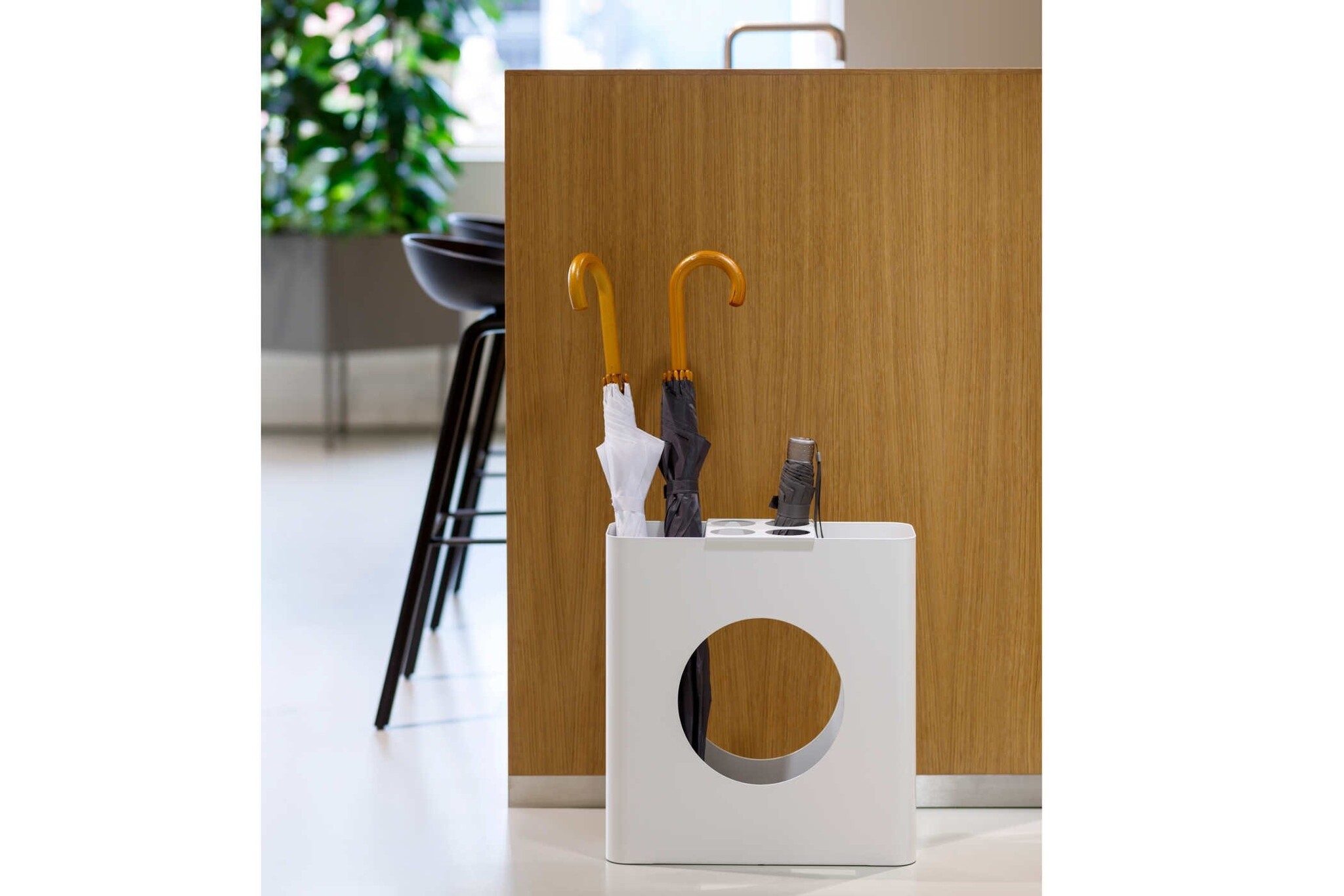 Hoge paraplubak met fraaie ronde hoeken. Vervaardigd uit staal, perfect afgewerkt zonder naad. Kleuren: wit, grijs of staal Materialen