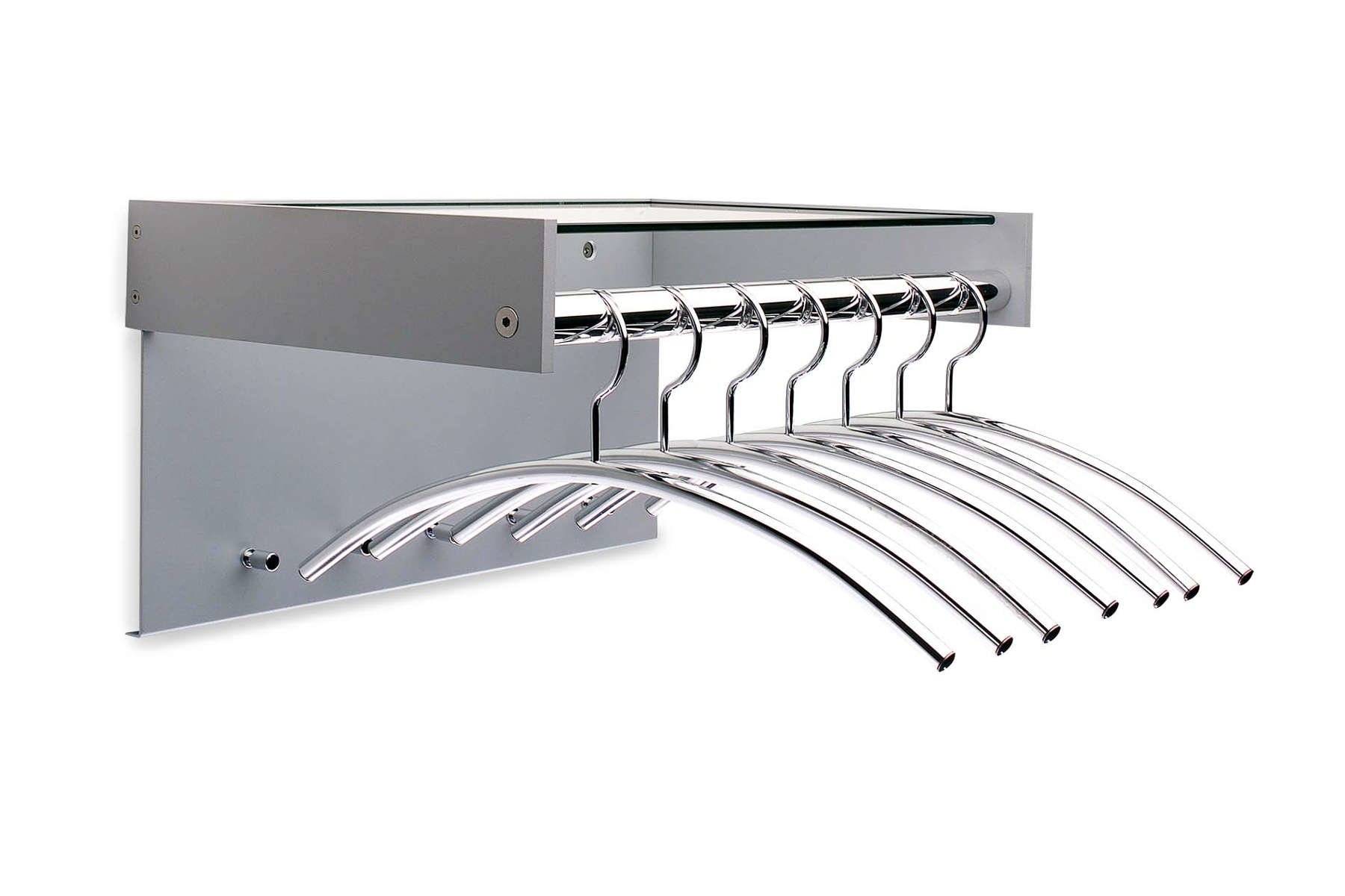 De wandgarderobe Hangon large is, qua materiaal en uitvoering, identiek aan Hangon 7, echter is Hangon 12 voorzien van een achterwand met extra jashaken. Hangon 12 is verkrijgbaar in twee breedtematen en geschikt voor zeven of twaalf kledinghangers. Hangon 12 is verkrijgbaar met en zonder rillen. Een combinatie van gepolijst aluminium en glas geven de garderobe elegantie.
