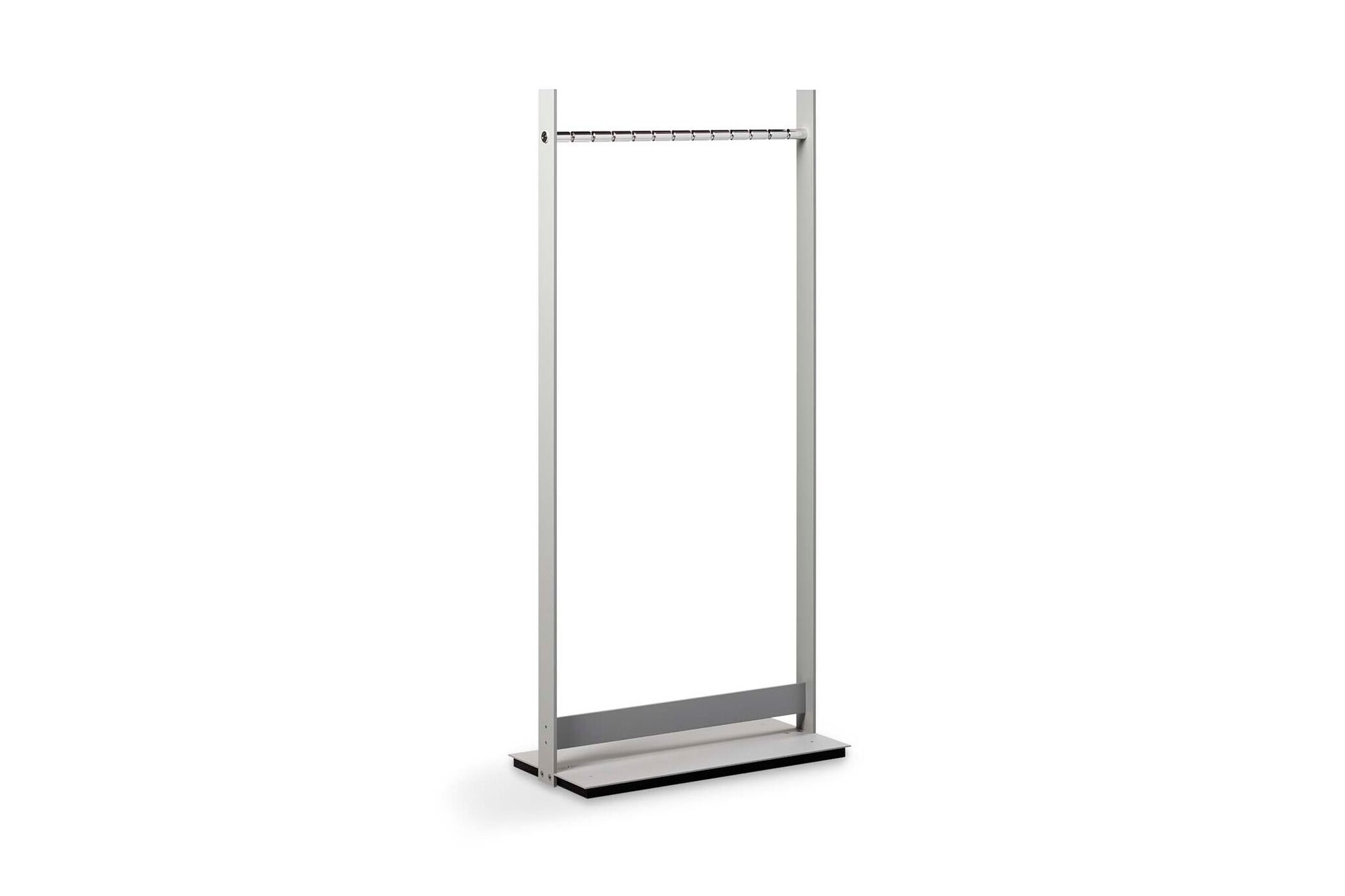 Cascando Standtogether geeft elke entree iets extra's. De combinatie van gepolijste aluminium met aluminium zilver geeft de kapstok een hightech uitstraling. De Standtogether is leverbaar met voet maar ook met wieltjes. Ook is er de mogelijkheid om meerdere Standtogether's aan elkaar te koppelen. Op deze manier ontstaat er een stabiel systeem. De kledingroede is voorzien van twaalf frezen, waardoor de hangers keurig op hun plek blijven hangen.