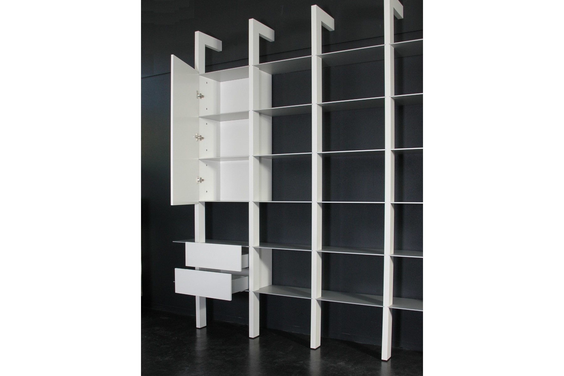 Castelijn Groove XS een design waarmee de ontwerper de uitdaging met de zwaartekracht aan ging. Ranke staanders tot 251 cm hoog met ingeschoven aluminium boekenplanken tot wel 269 cm lang en slechts 6 mm dik! Het resultaat is een aan Groove gerelateerde boekenkast met een zo open en luchtig karakter, dat enkel de staanders het krachtige stramien lijken te vormen.