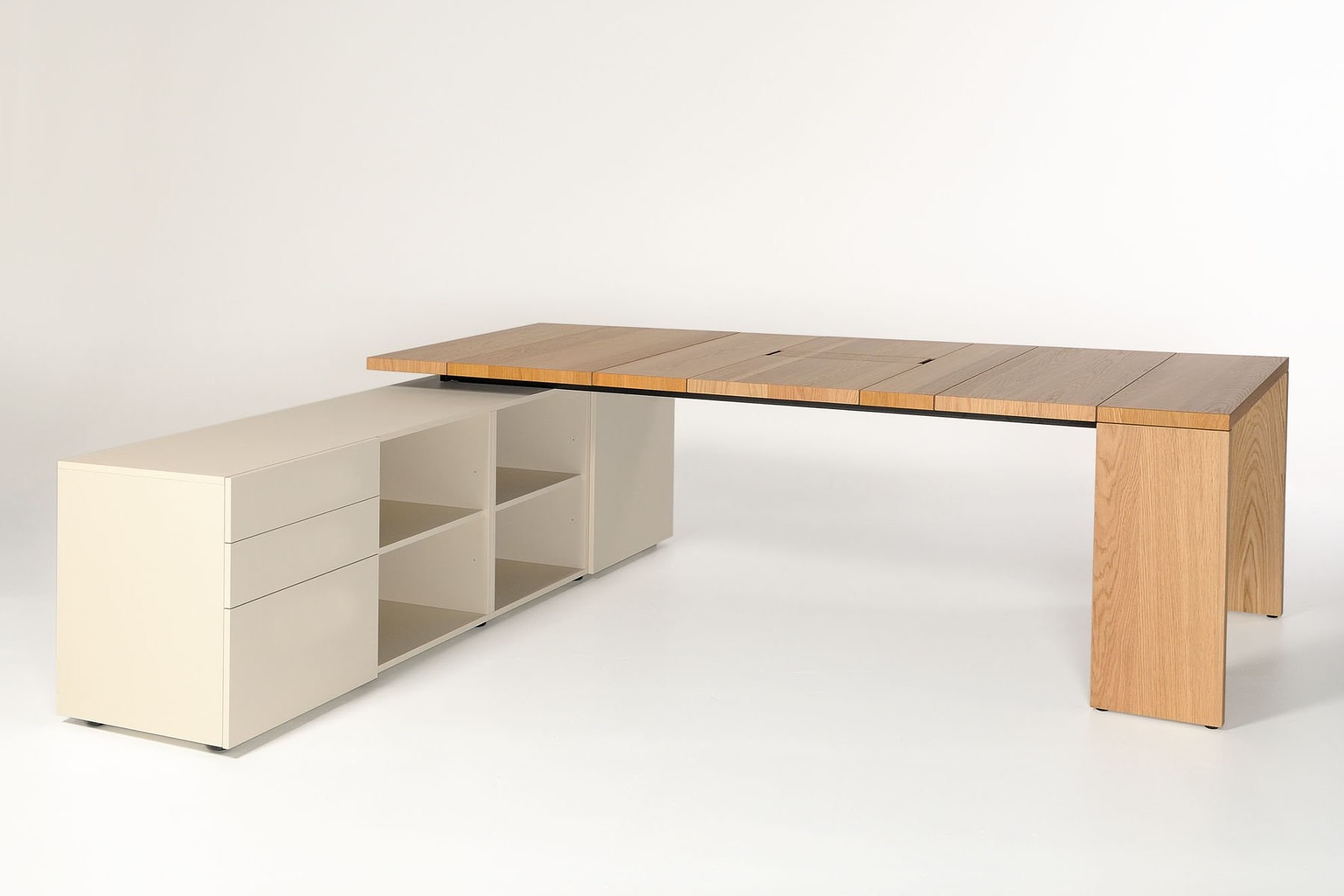 De Castelijn LV bureau kunt u met aparte bladstroken van 20, 30, 40 en 50 cm breed zelf samenvoegen. Zo beslist u niet alleen de lengte, maar ook de vorm van de naden in het blad: effen in stramien of juist een nonchalante samenstelling van breedtematen, de keus is aan u. Tevens bepaalt u of uw blad uit een houtsoort bestaat of verrassend te mixen is met frisse lakkleuren. De aparte bladstroken maken kleurverandering, vernieuwing of aanpassingen in de toekomst mogelijk.
