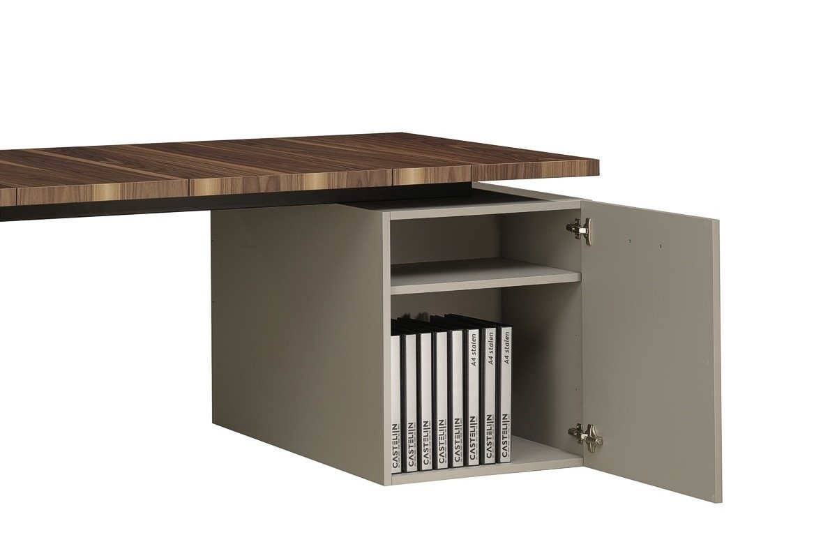 Het strokeneffect komt op de kasten terug in het afdekblad, dat links of rechts tot op de grond doorloopt. Zowel de bureaus van 100cm diep als de benchtafels van 160cm rusten op geheel gelakte kastjes, met rondom bergruimte. Nieuw: Push-to-open!
