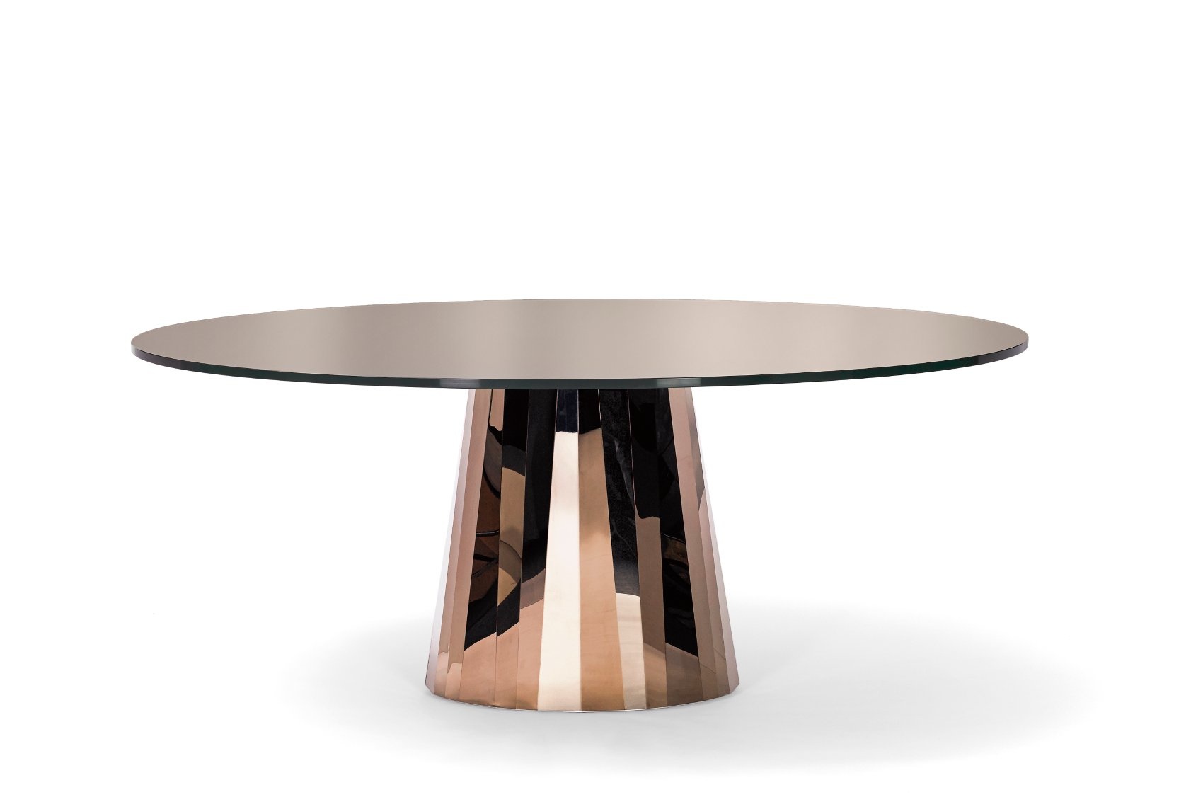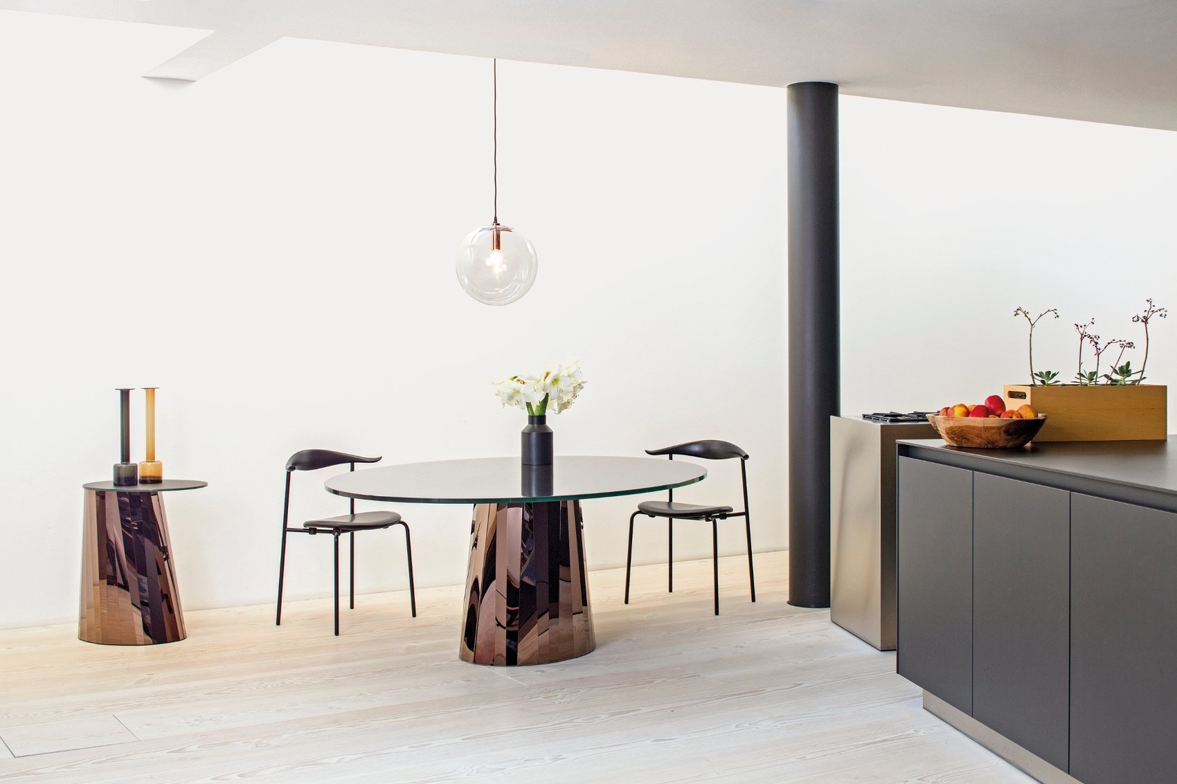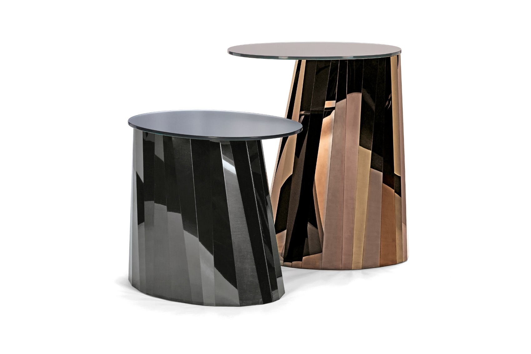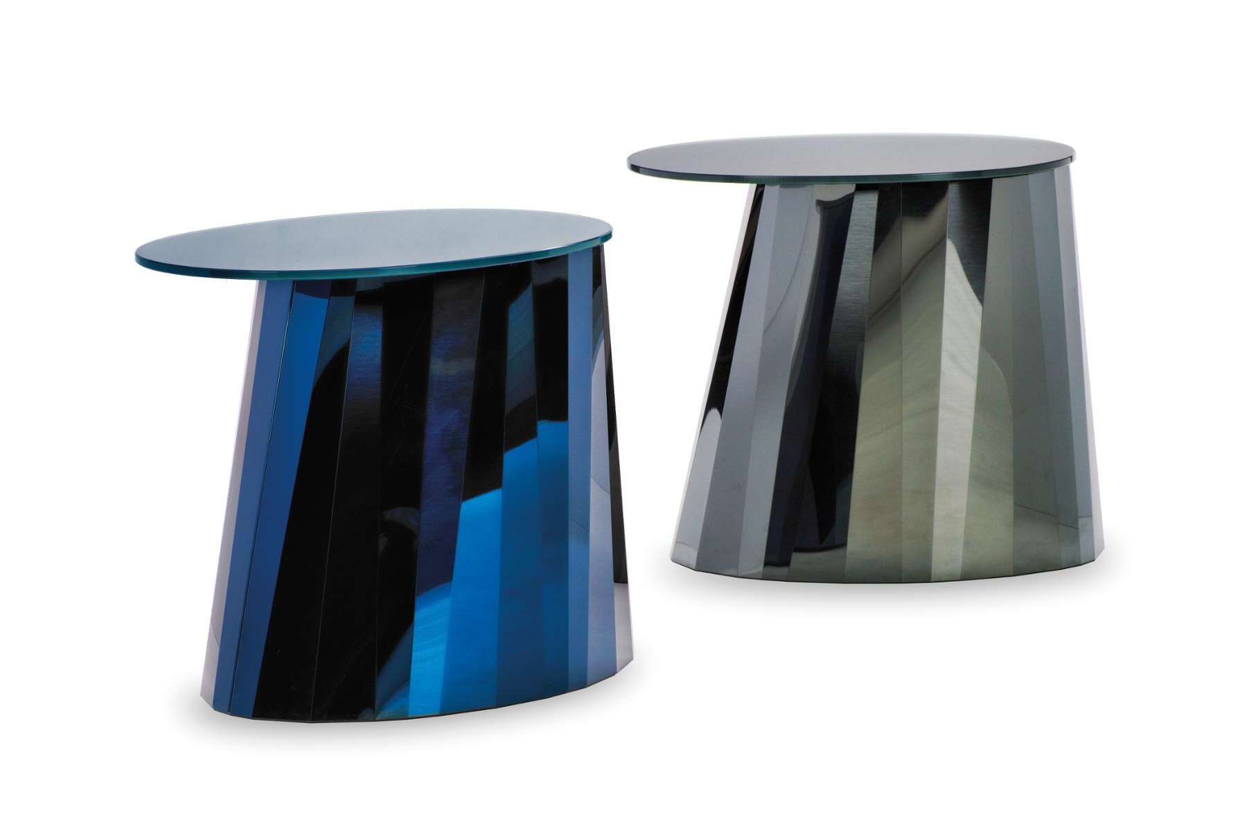 De Pli Side Table is een salontafel met een ongewone elegantie door het geometrische ontwerp. De hoeken en vlakken die de Pli zijn naam geven, zorgen ervoor dat de basis van roestvrij staal haast gepolijst edelsteen lijkt. De Pli bijzettafel is verkrijgbaar in vier verschillende kleuren: groen, blauw, brons of zwart. Het blad is gemaakt van glanzend of mat glas en in kleur bijpassend bij de voet. De ovalen vorm van het blad contrasteert op aantrekkelijke wijze met de hoekige facetten van de basis, die een fascinerend lijnenspel op de omgeving reflecteren. Met zijn waardevolle materialen en sterke kleuren herinnert de Pli aan de elegante designs van de afgelopen decennia, maar is tegelijkertijd een tijdloos 21e-eeuws ontwerp. Materialen