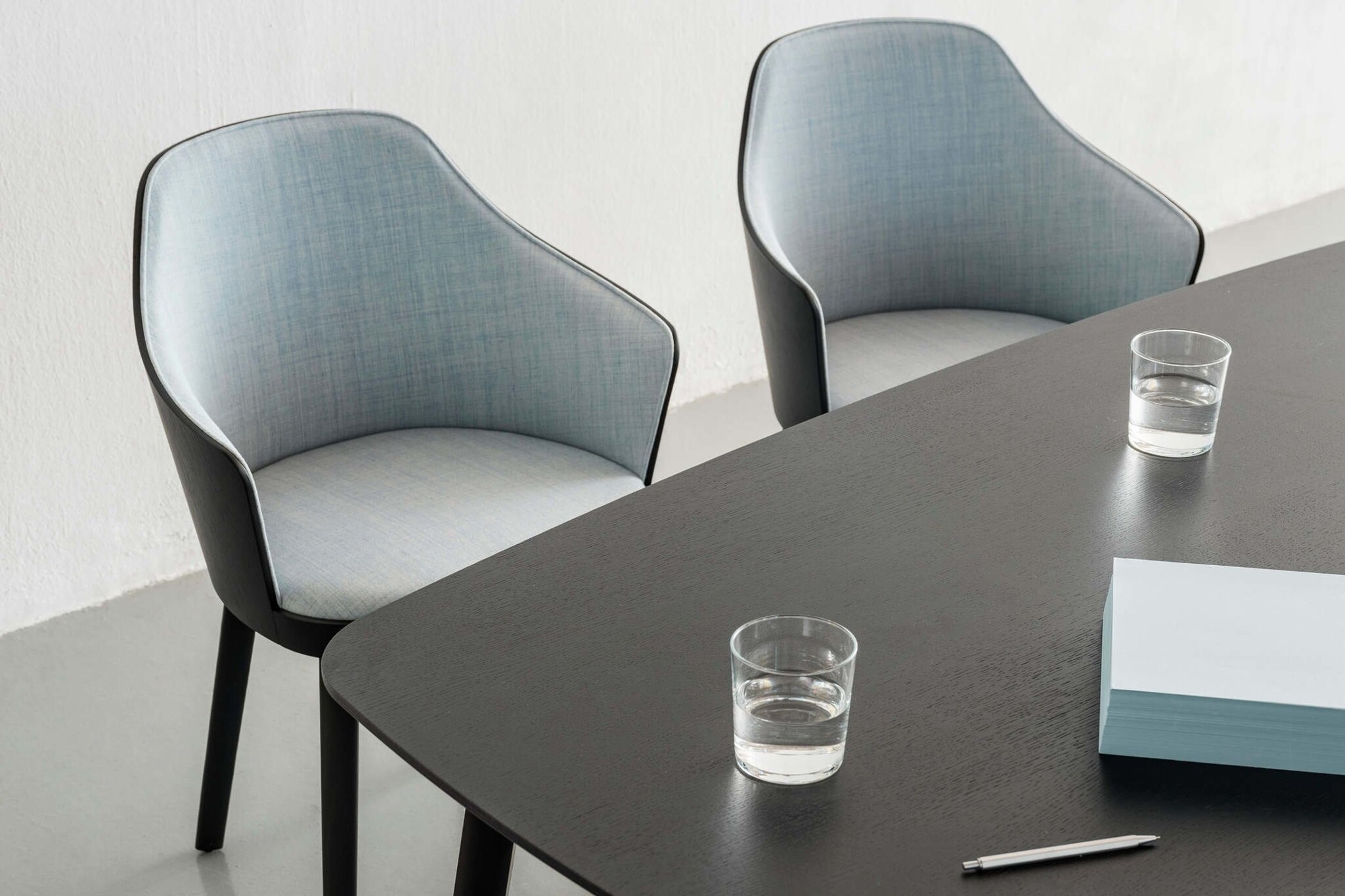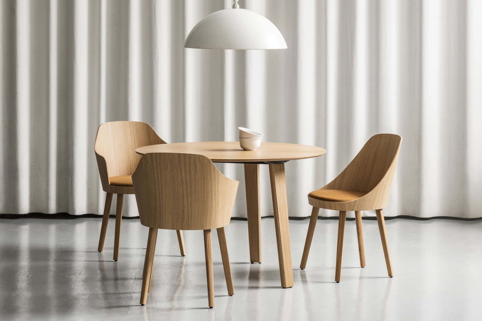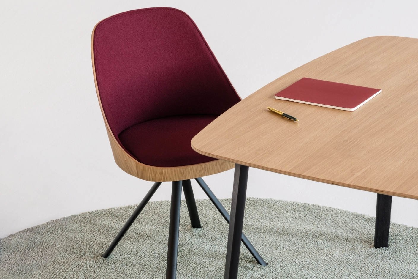 De stoel is gemaakt van een subtiel gelakt multiplex-eik en een omhullende vorm die een gevoel van intimiteit biedt.