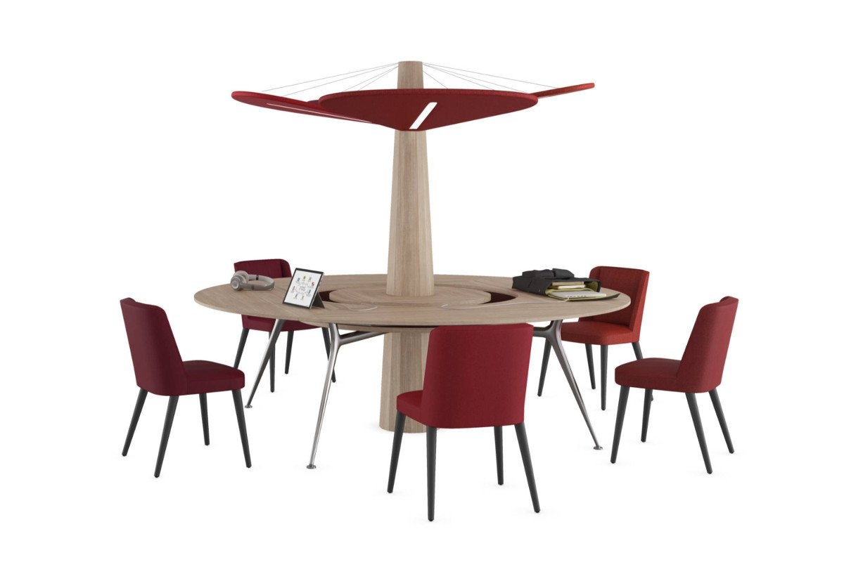 In het midden van de tafel bevind zich een blok met elektrificatie én een standaard met een soort ‘plafond’ die als het ware de tafel overdekt. Dit worden ook wel helikopter bladeren genoemd. Deze bladeren hebben een functie: ze geven licht (LED) én ze verbeteren de akoestiek in de ruimte, gezien ze geluid absorberen.
