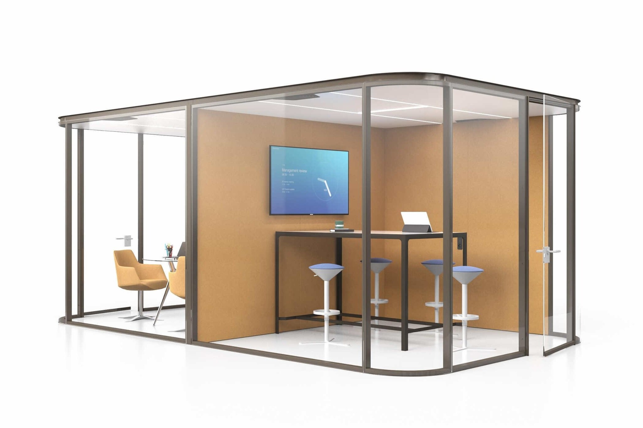 De Estel Collaborative Room X ook in uw ruimte? Dat kan uiteraard! Deze geluidsdichte ruimte is ideaal wanneer u een concentratiewerkplek, vergaderruimte of relaxruimte wil creëren op de werkvloer. Vanwege de glazen deuren blijft u dan toch betrokken. Kenmerken van de Estel Collaborative Room X