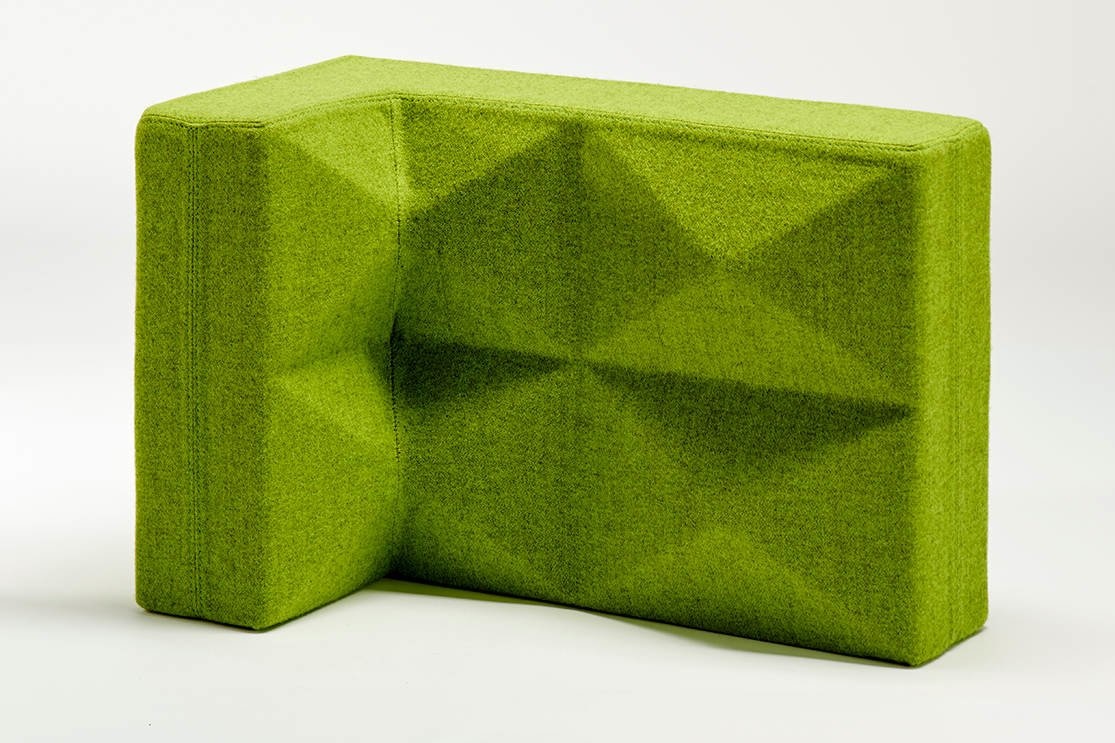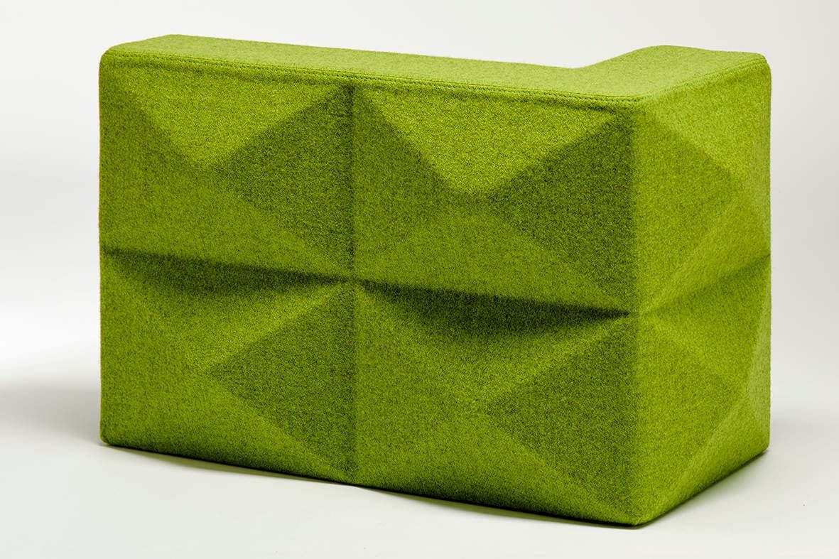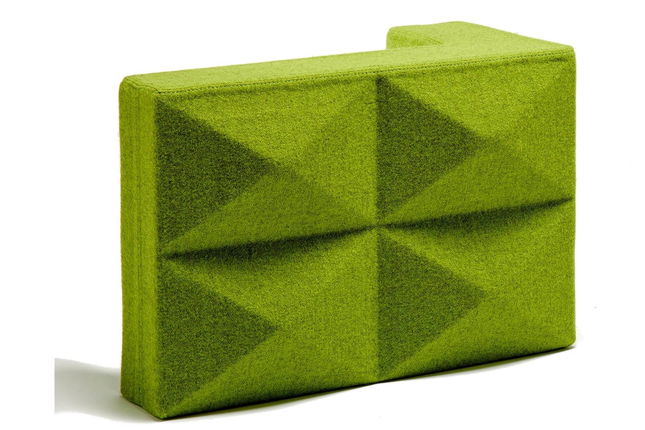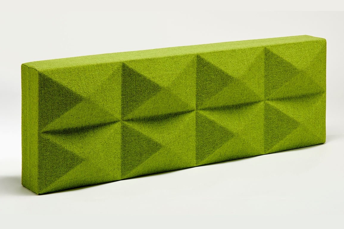 Foamfabrics Fabricks akoestische oplossing Fabricks zijn bouwstenen gemaakt van hoogwaardig akoestisch schuim en stof. Ze zijn ontworpen om een ruimte visueel aantrekkelijk te maken en ook om ruimtes te verdelen en geluidshinder tegen te gaan. Met Fabricks is het namelijk makkelijk om snel een muur te bouwen voor ontmoetingsplekken of individuele werkplekken. Het concept is ontworpen om eenvoudig en snel op te bouwen en af te breken. Fabricks wordt ondersteund door middel van grondplaten en aluminium palen. De blokken worden hier opgeschoven.
