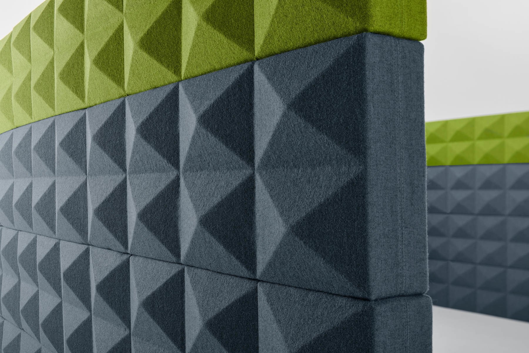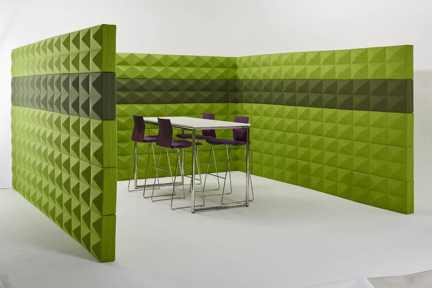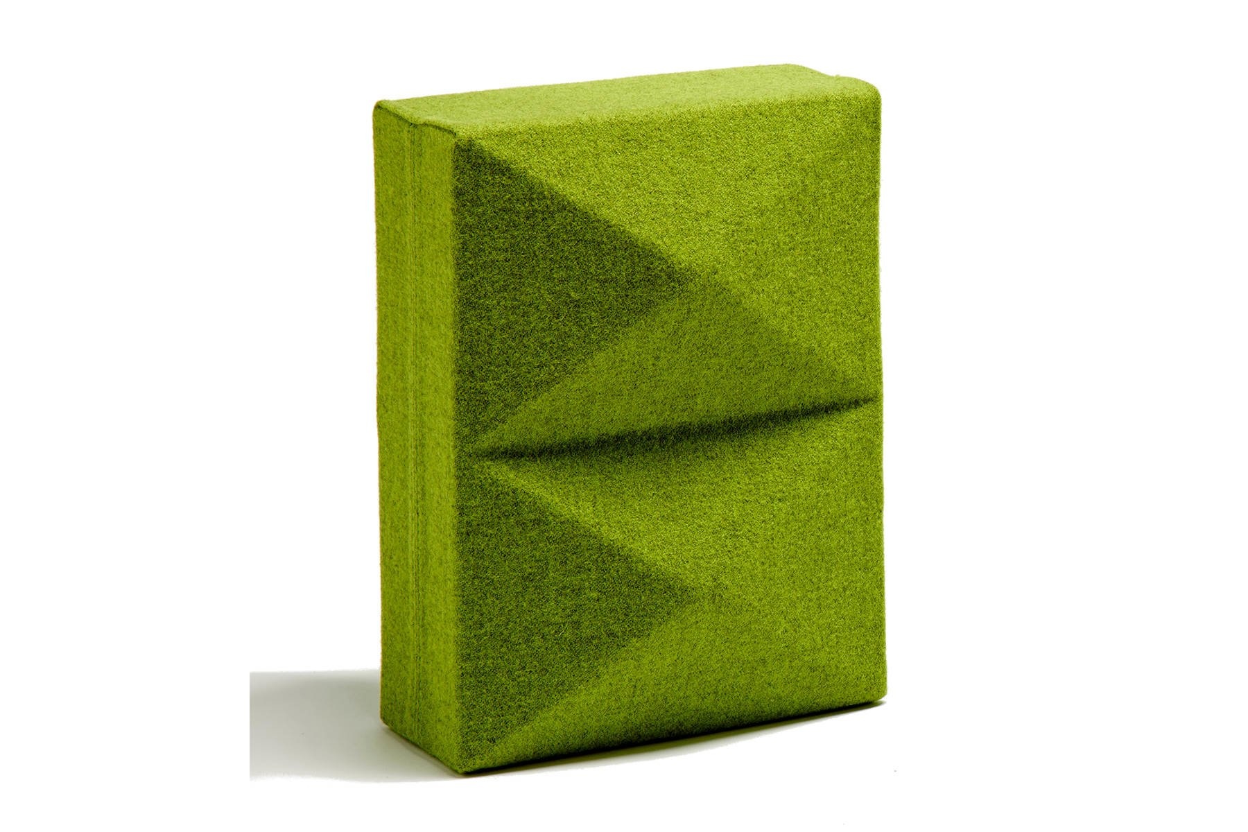 Foamfabrics Fabricks akoestische oplossing Fabricks zijn bouwstenen gemaakt van hoogwaardig akoestisch schuim en stof. Ze zijn ontworpen om een ruimte visueel aantrekkelijk te maken en ook om ruimtes te verdelen en geluidshinder tegen te gaan. Met Fabricks is het namelijk makkelijk om snel een muur te bouwen voor ontmoetingsplekken of individuele werkplekken. Het concept is ontworpen om eenvoudig en snel op te bouwen en af te breken. Fabricks wordt ondersteund door middel van grondplaten en aluminium palen. De blokken worden hier opgeschoven.