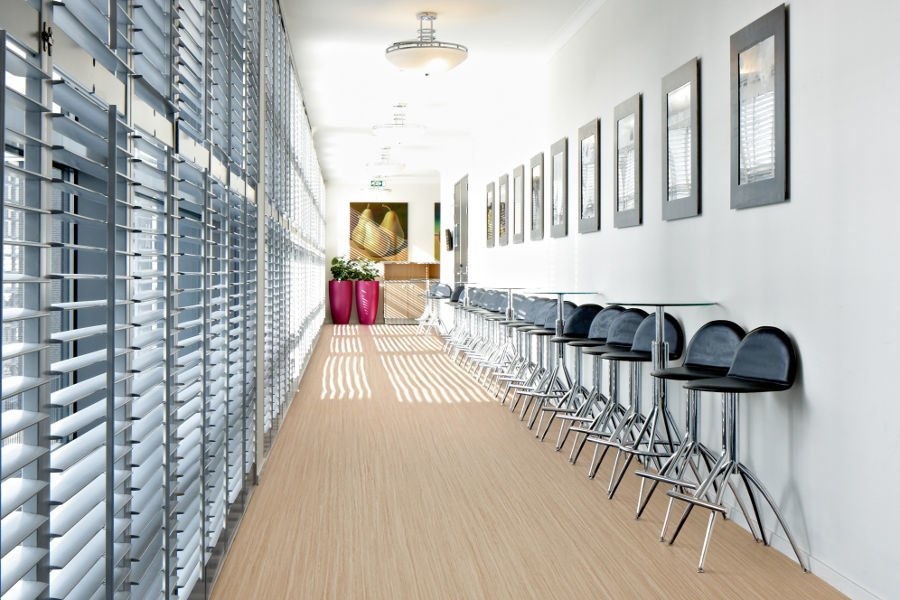De Forbo Marmoleum Striato Original is leverbaar in een scala van neutrale kleuren met een subtiel lijnenpatroon.