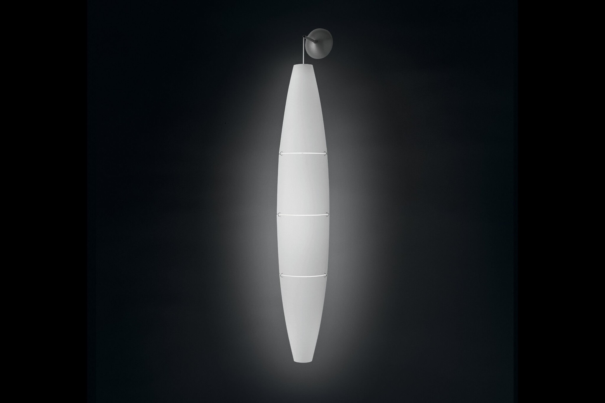 Een wandlamp met ondersteuning voor aan de muur in gelakt metaal. Ook hier is de eenvoudige langwerpige vorm van de lamp te zien.