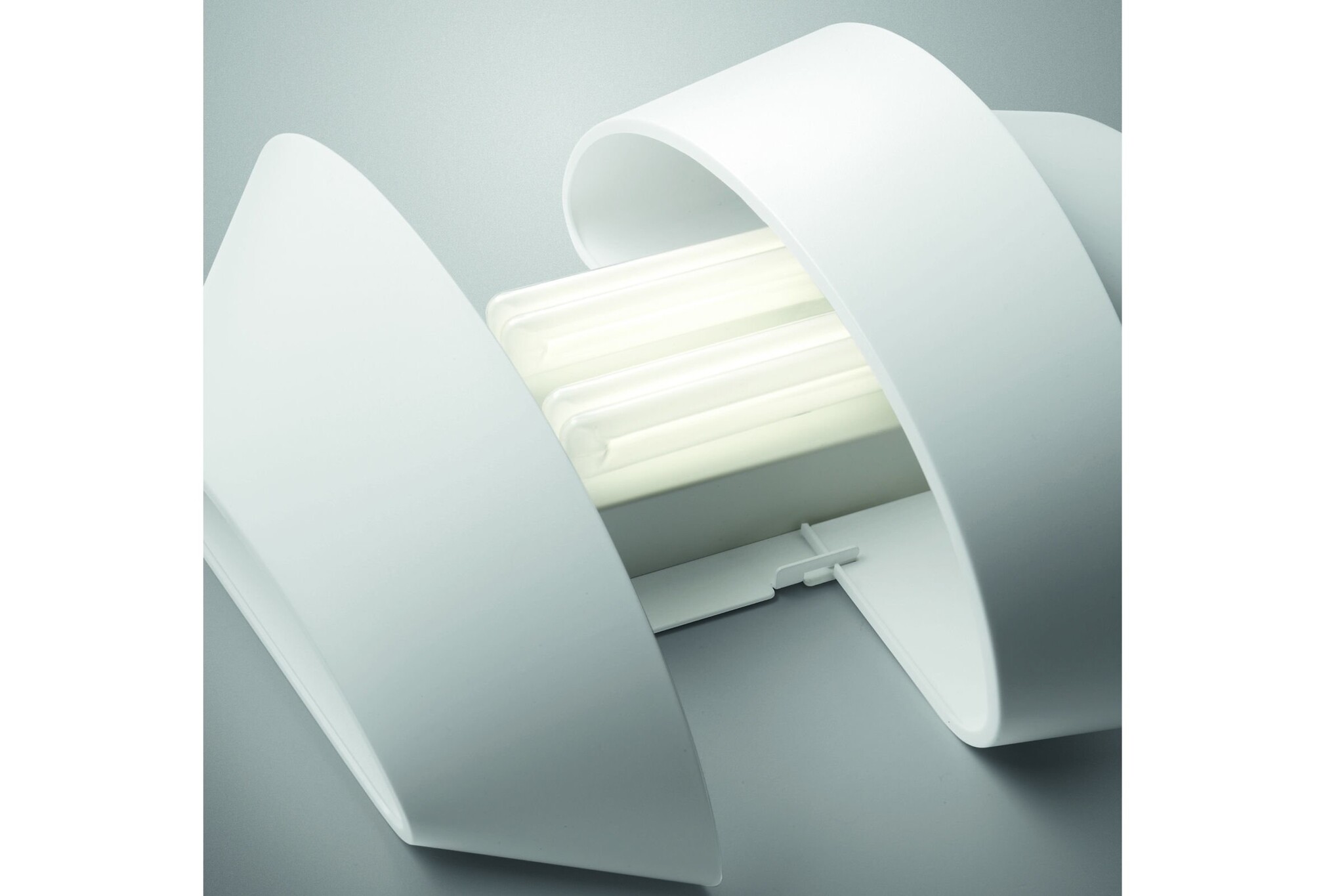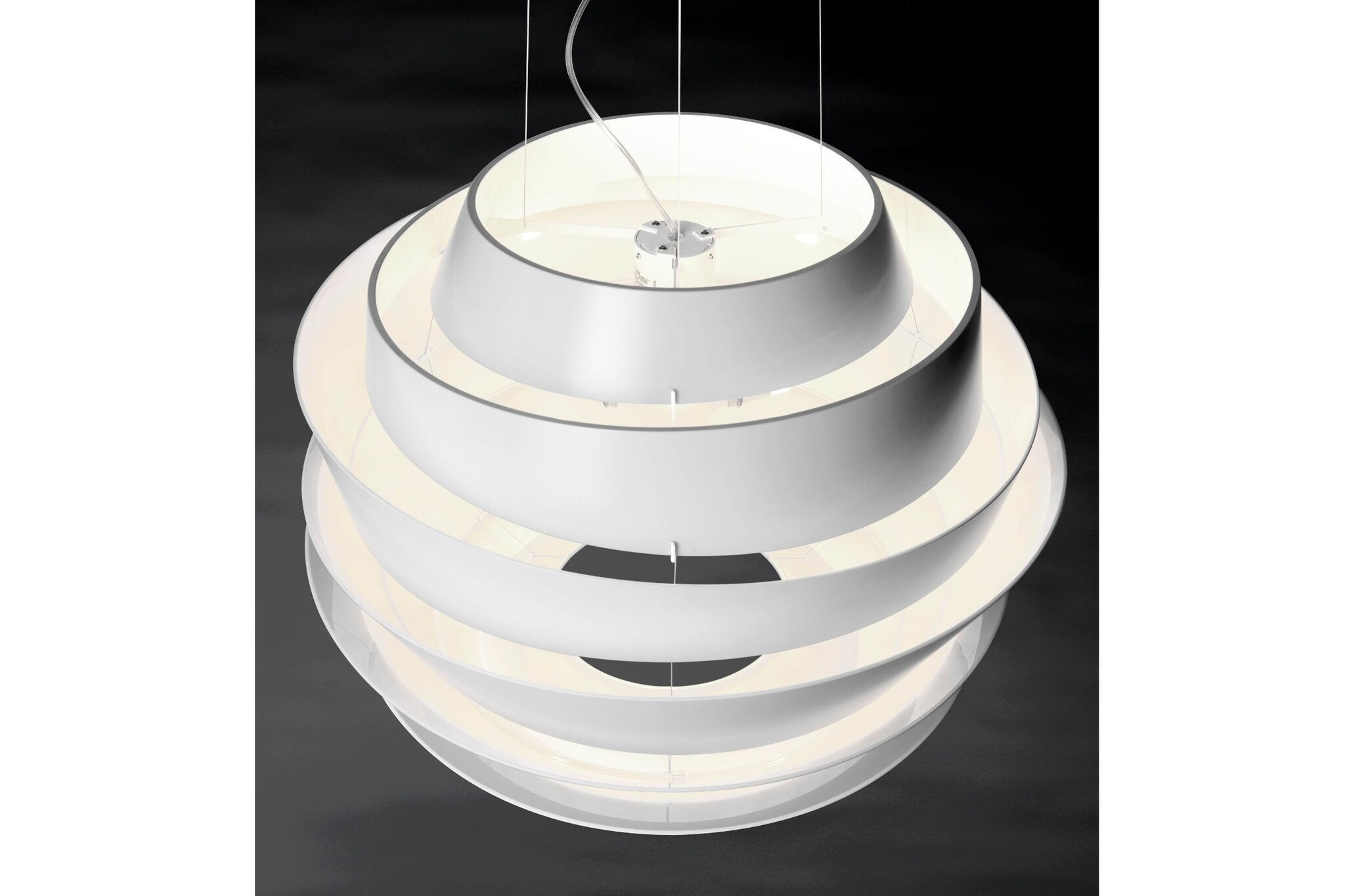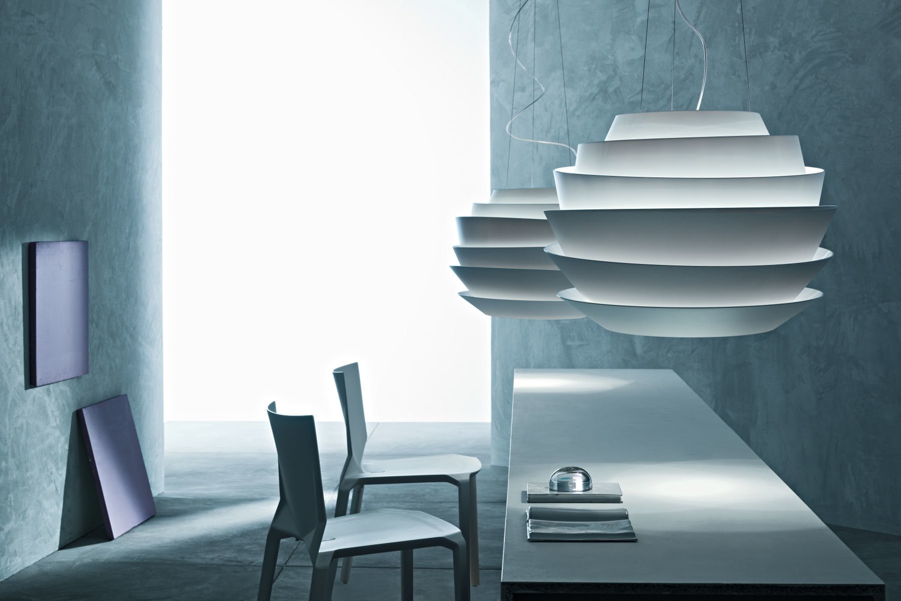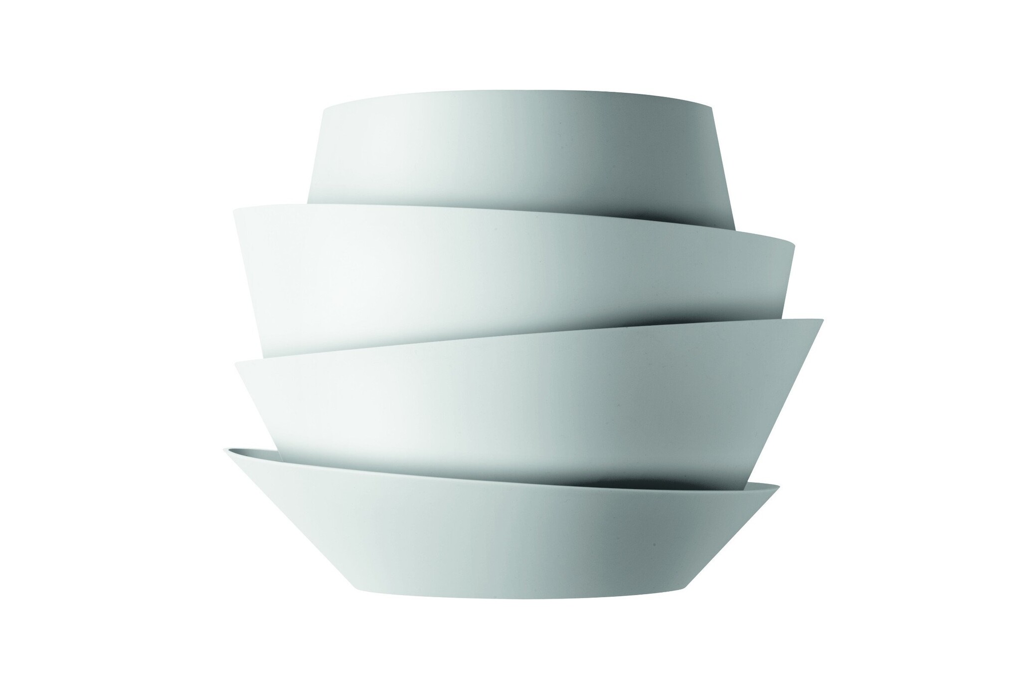 Foscarini Le Soleil een plafondlamp gemaakt van polycarbonaat. Le Soleil bestaat uit asymmetrische banden, die een leidende rol spelen in de verspreiding van het licht. De Le Soleil, verlichting, is leverbaar in wit. Naast de hanglamp is er ook een wandlamp leverbaar ook in de kleur wit.