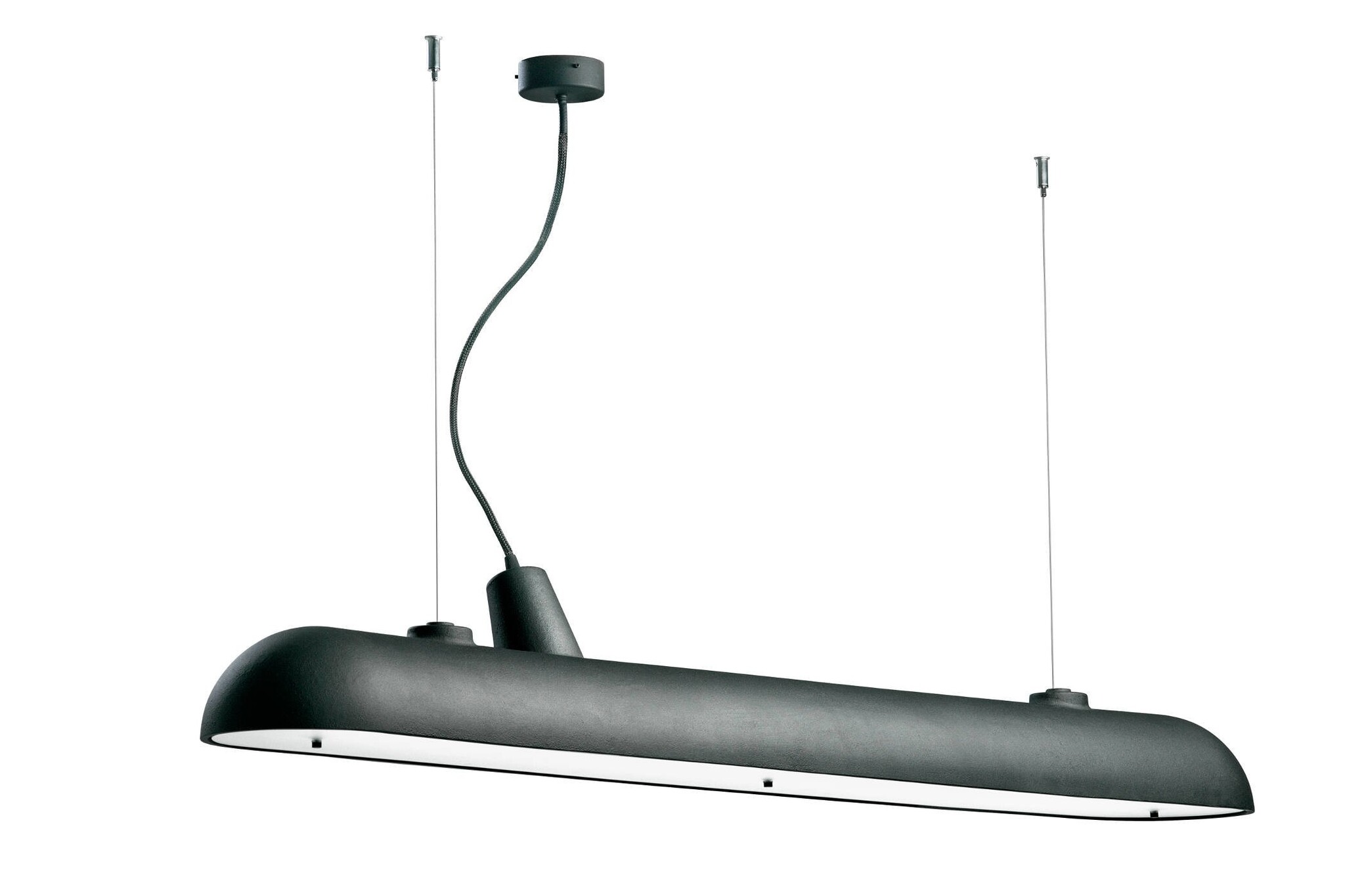 De Functionals Luftschift hanglamp, ontworpen door Kranen & Gille, hangt in de lucht, net als zijn naamgenoot: het luchtschip of zeppelin van de jaren 30 van de vorige eeuw. Het bijna onzichtbare staaldraad houdt onderzeeërvormige, gegoten aluminium body van het plafond, terwijl een zwarte kabel van 295 cm voor de elektra zorgt.De Functionals Luftschiff weegt 11,6 kilo.