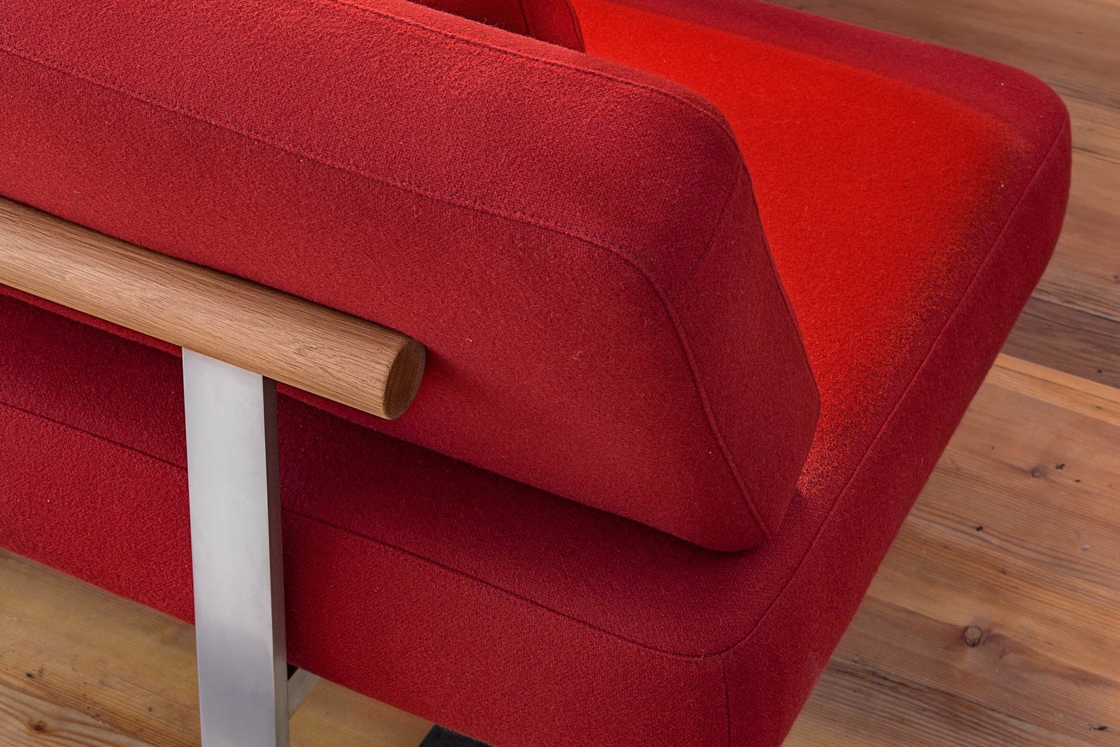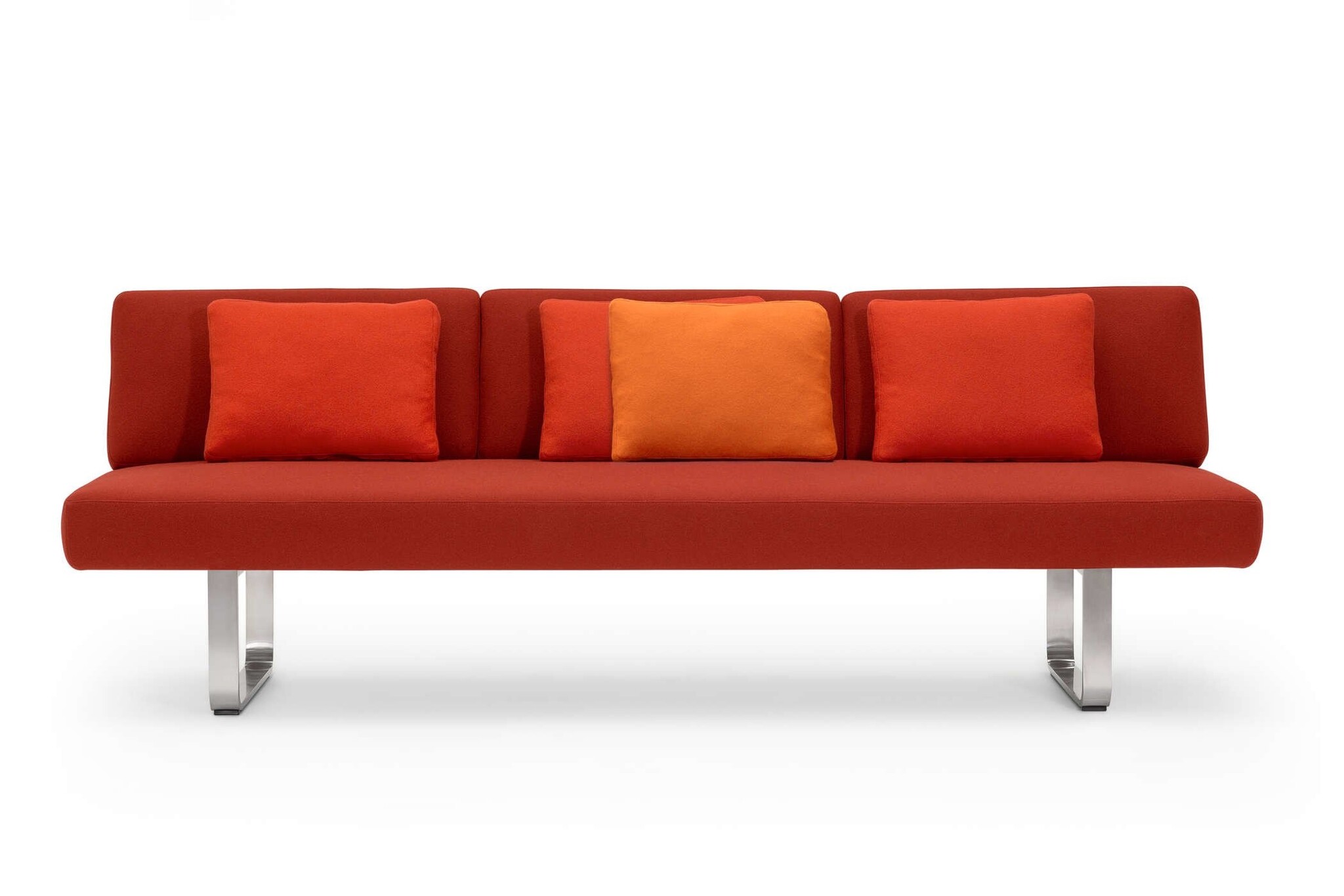 De Girsberger Joline bank maakt zitten buitengewoon comfortabel bijvoorbeeld in een bedrijfsrestaurant of in een vergadering. Uniek aan het design is het houten rug frame, welke niet alleen mooi staat maar ook extra steun geeft aan de rug kussens. De extra losse kussens zorgen voor extra comfort bij het achterover leunen en maken het mogelijk één of meerdere kleurcombinaties te maken.