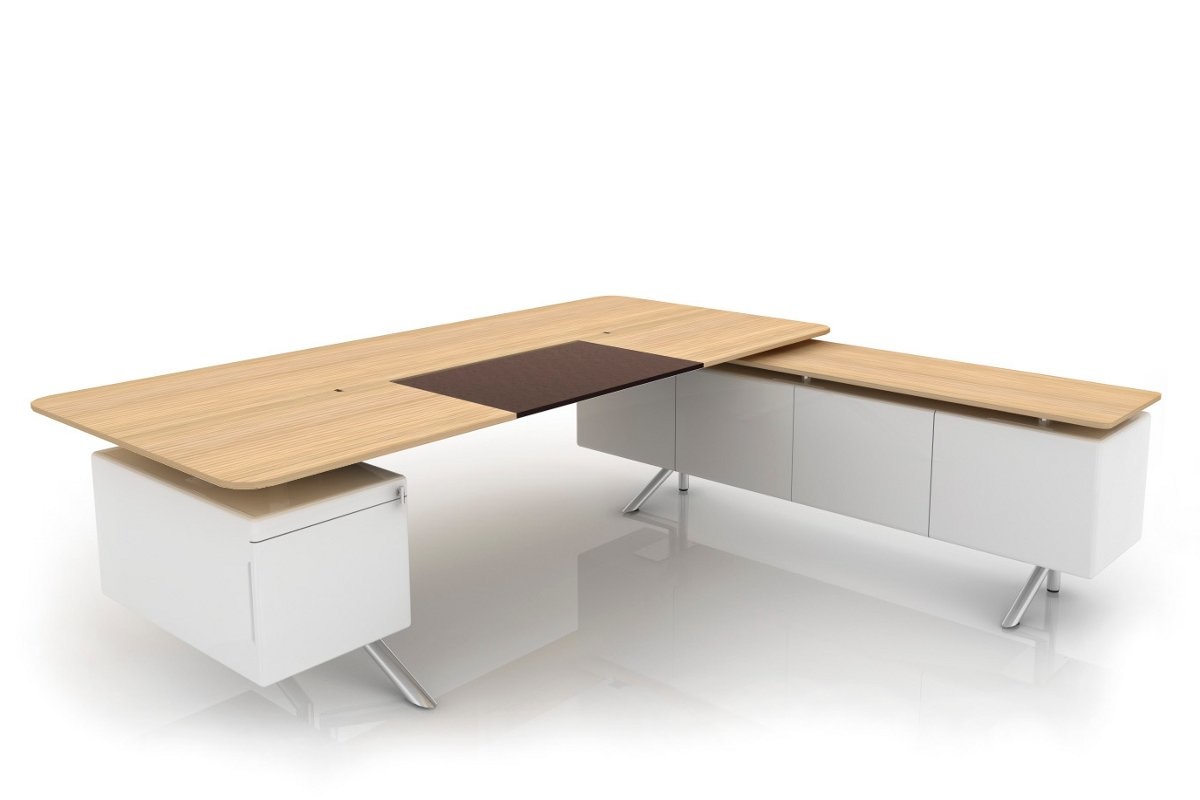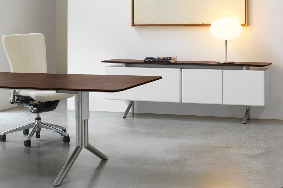Haworth Audience Executive directiemeubilair is een veelzijdige serie ontworpen door Albert Holz Het vrijstaande bureau staat op ëën of twee ladeblokken. De opbergunits kunnen worden voorzien van een projector die onverwachte- of vertrouwelijke vergaderingen mogelijk maken in de vertrouwde kantooromgeving.