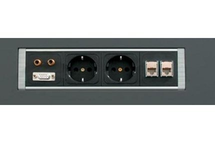 Kabelmanagement systeem rotation II, van geanodiseerd aluminium. bestaande uit 3 x 230 V + 2-voudig RJ 45, vlak in tafelblad verwerkt.