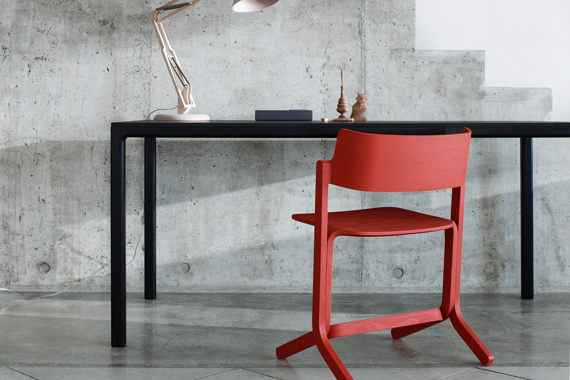 Het tafelblad is gemaakt van essenhout en leverbaar in het wit of zwart. Bij beide kleuren is de houtnerf zichtbaar.