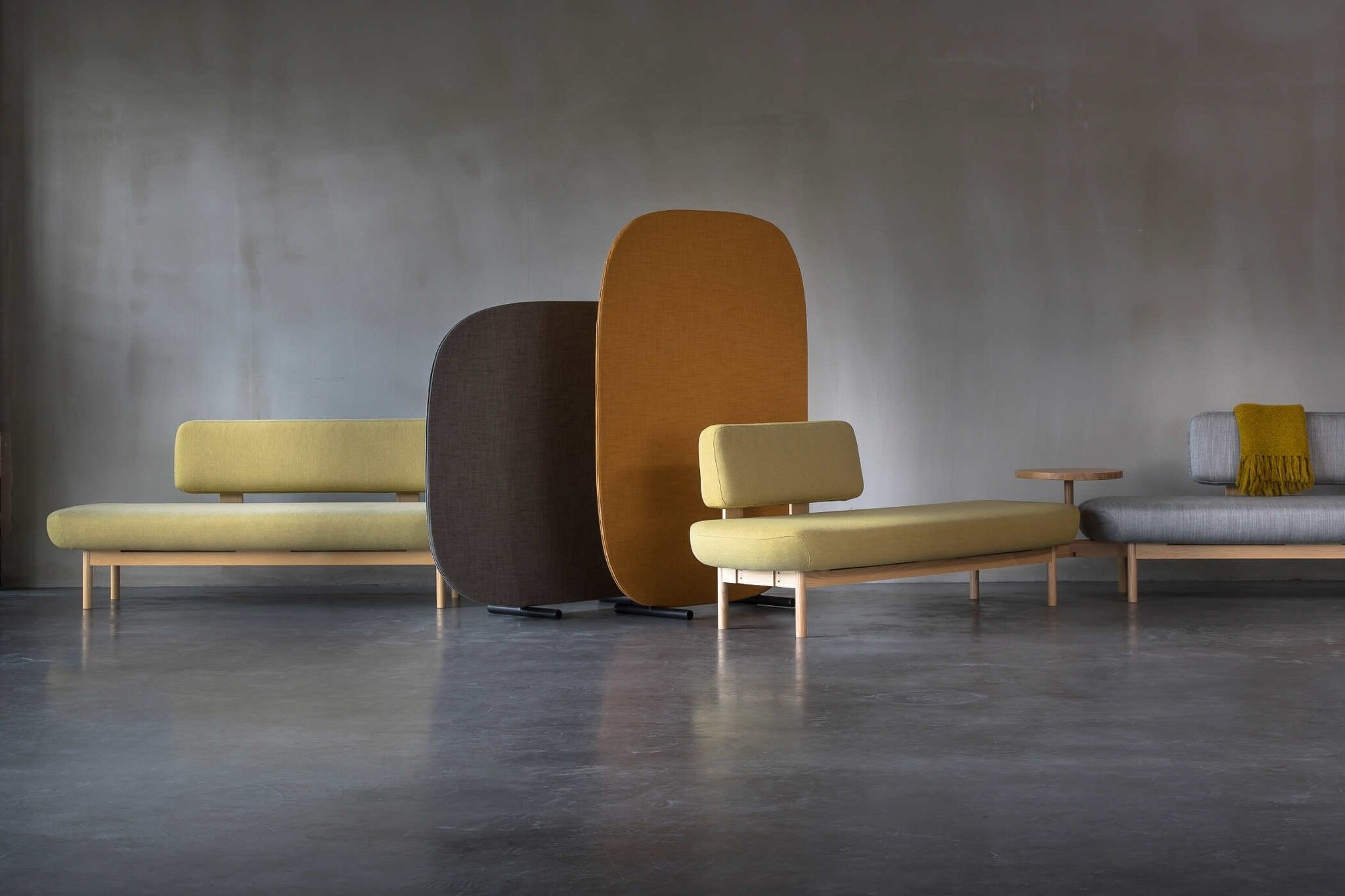De akoestische ruimteverdelers zijn te bekleden in de verschillende stofkleuren uit de collectie van Dekoma Hermes.