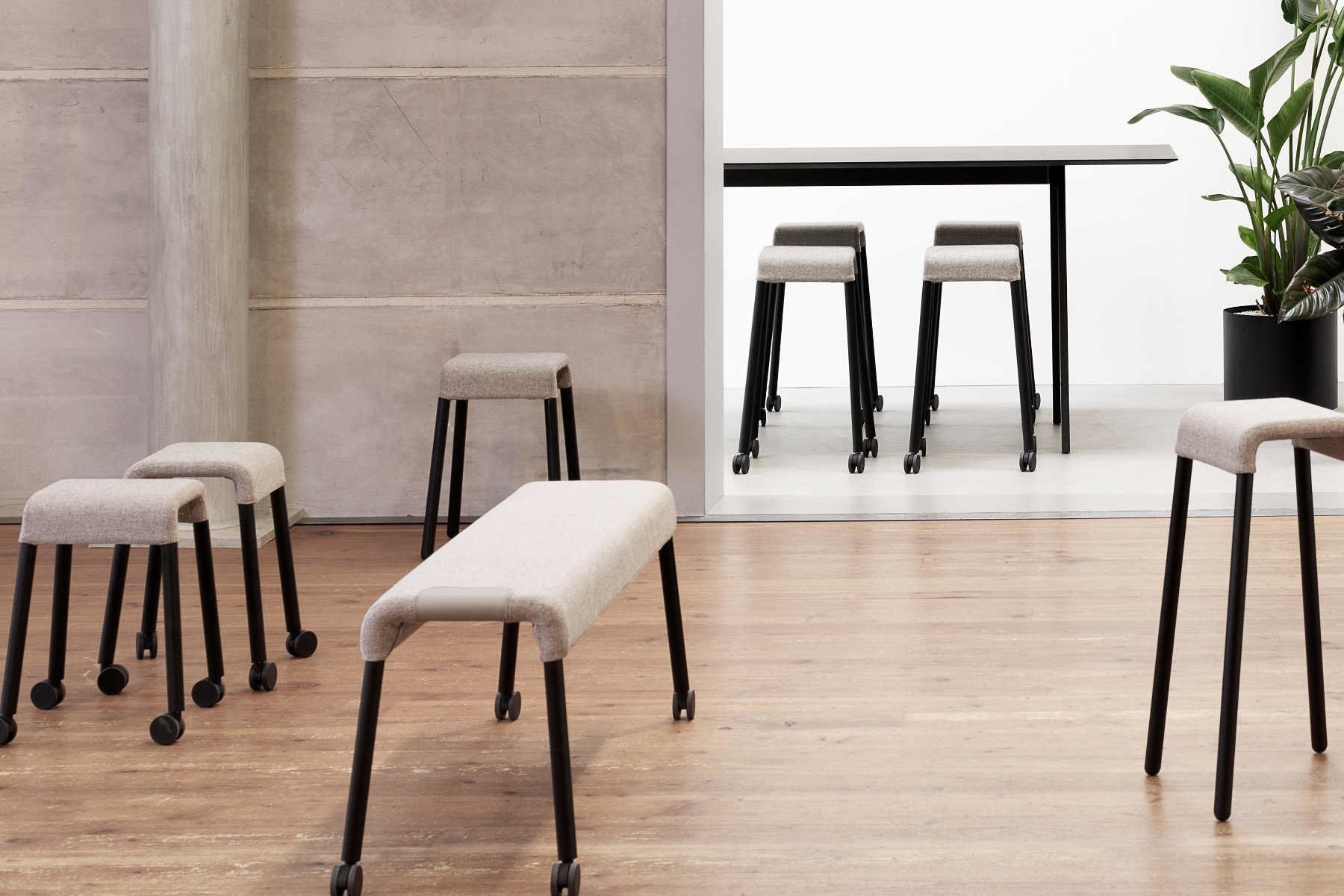 De krukken zijn stapelbaar en verrijdbaar