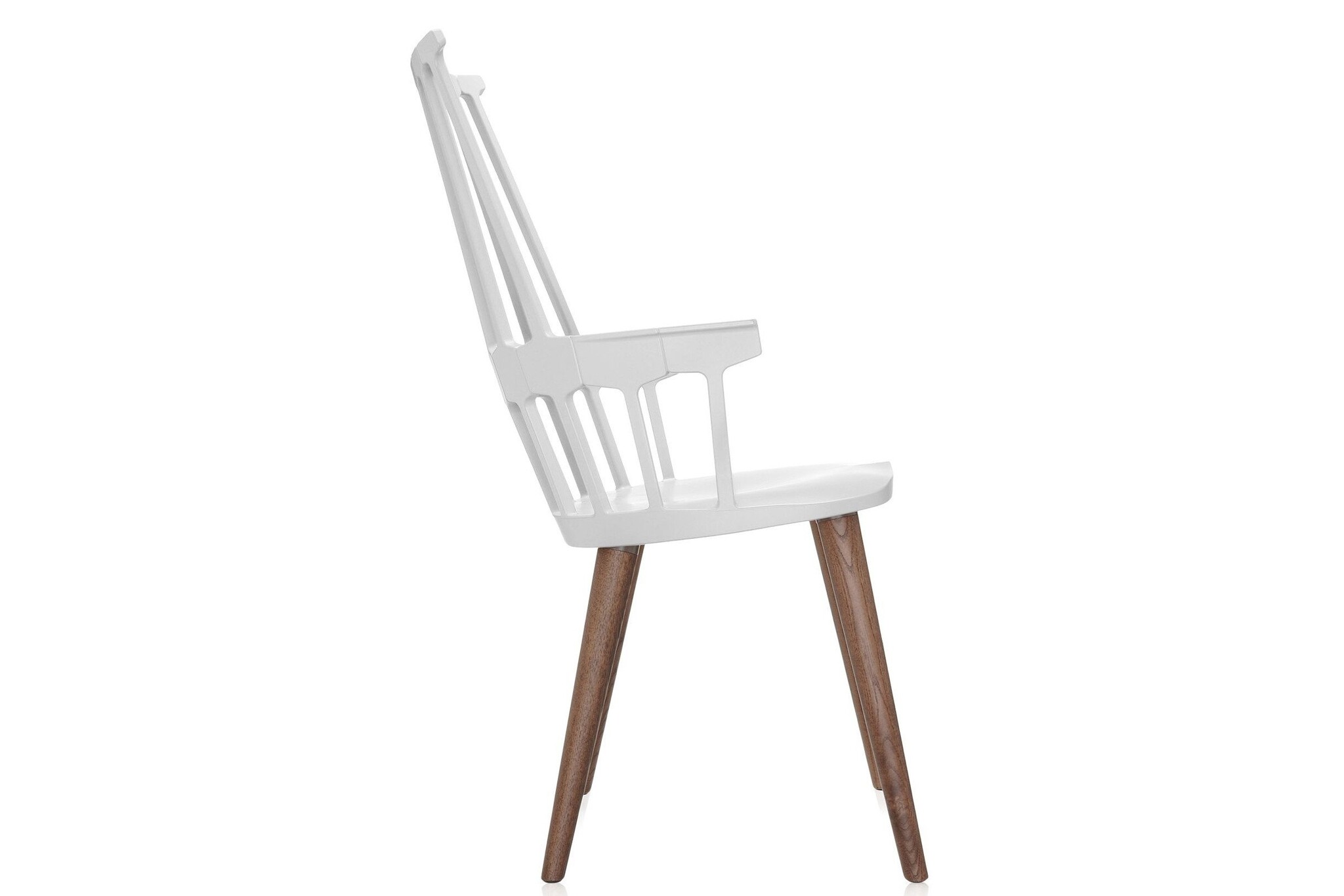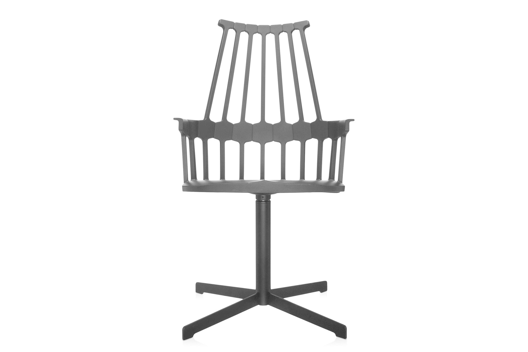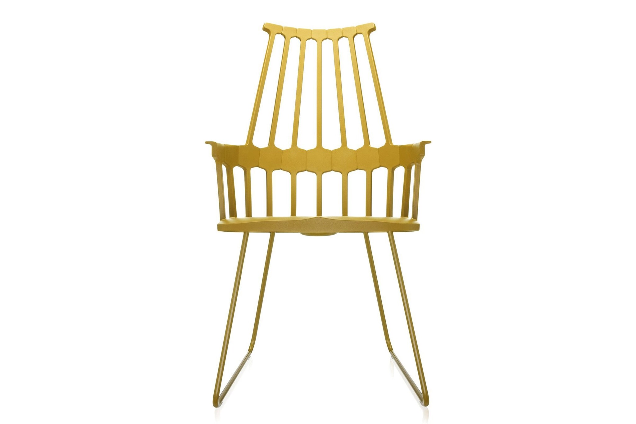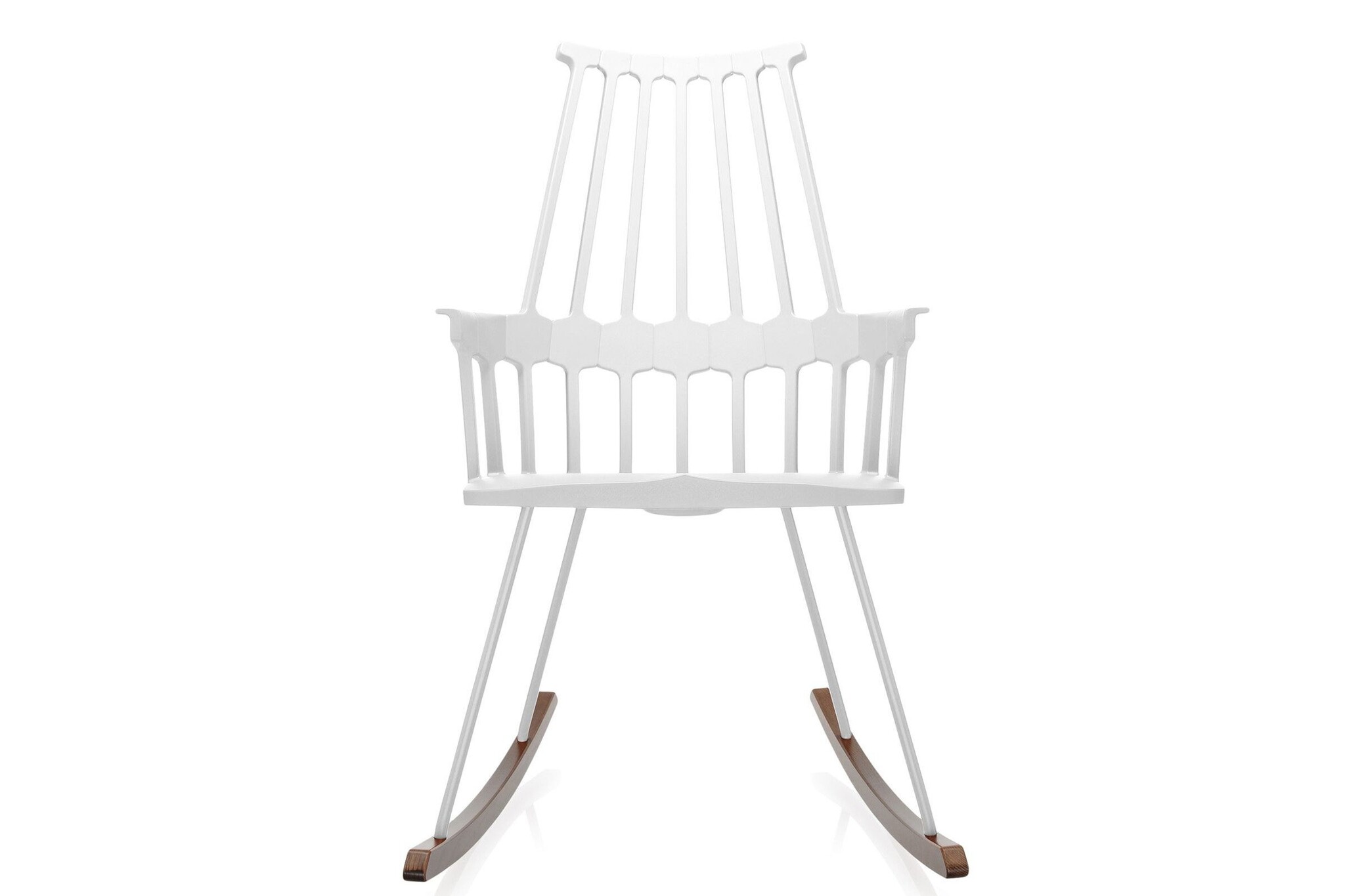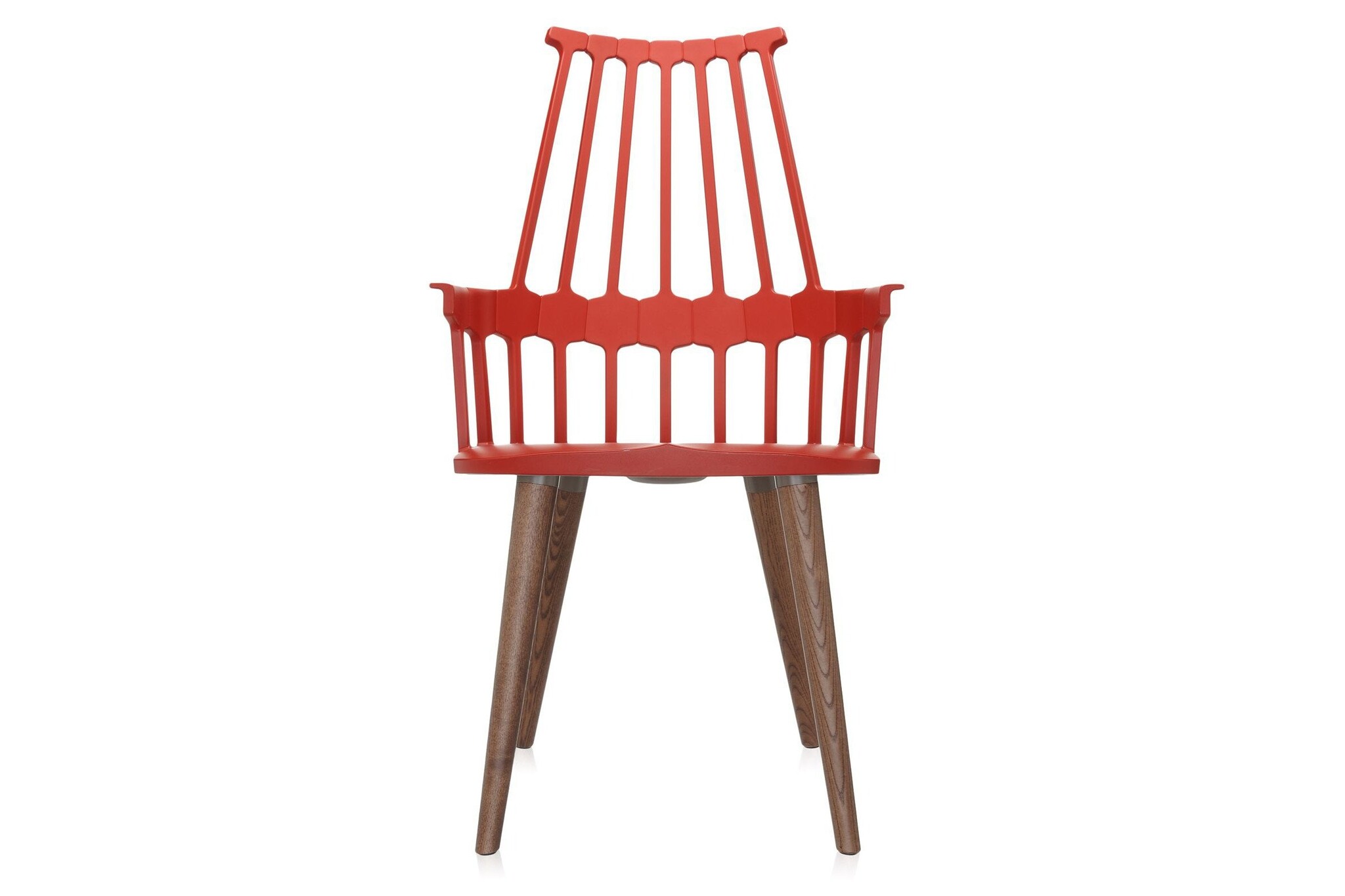 Kartell Comback heeft een rugleuning die bestaat uit zeven staven die samenkomen in een zeshoekige structuur die vastzit aan het zit gedeelte. Het frame is gemaakt van technopolymeer thermoplastic en de stoelpoten van eiken gebeitst of gelakt essenhout. De stoel is leverbaar in zes matte kleuren. De Comback stoel is goed toe te passen als restaurantmeubilair.
