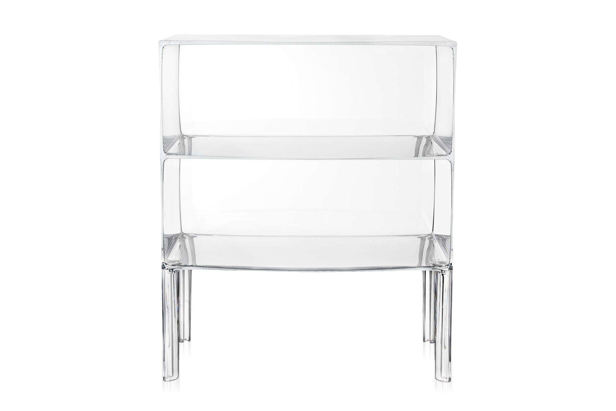 De Kartell Ghost Buster is een compact opbergmeubel dat ook buiten te plaatsen is, dankzij het toegepaste materiaal (PMMA). Deze transparante thermoplastische kunststof, ook wel bekend als plexiglas, is waterbestendig. Ook binnen toe te passen