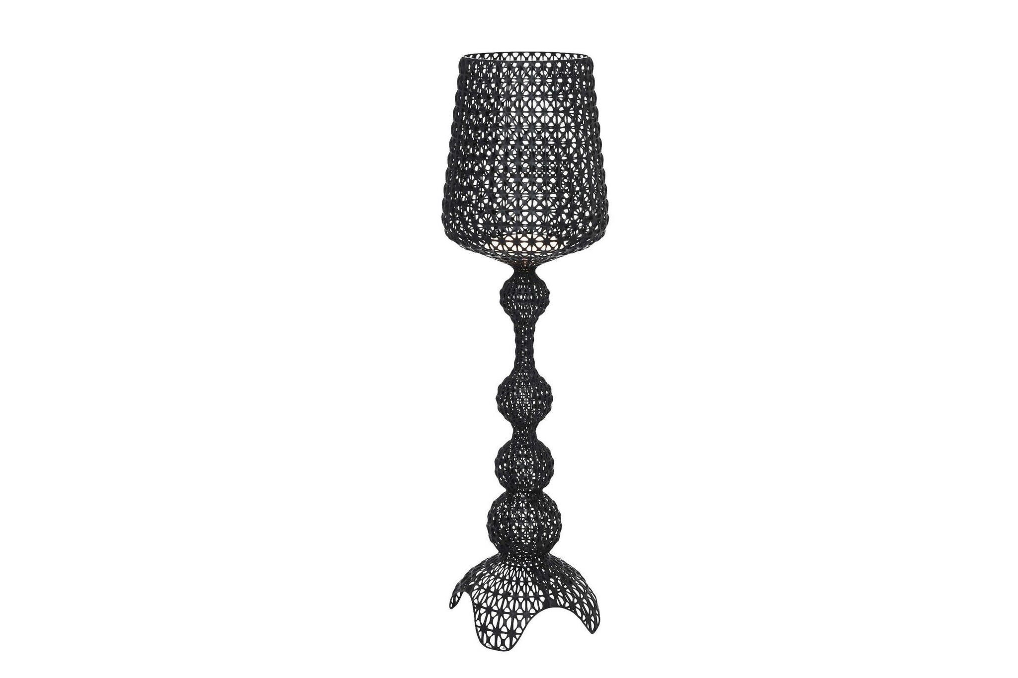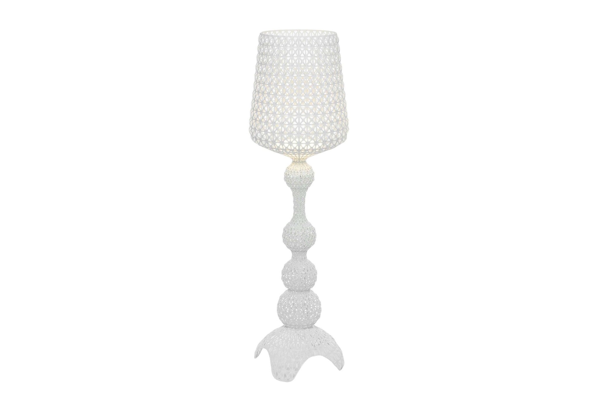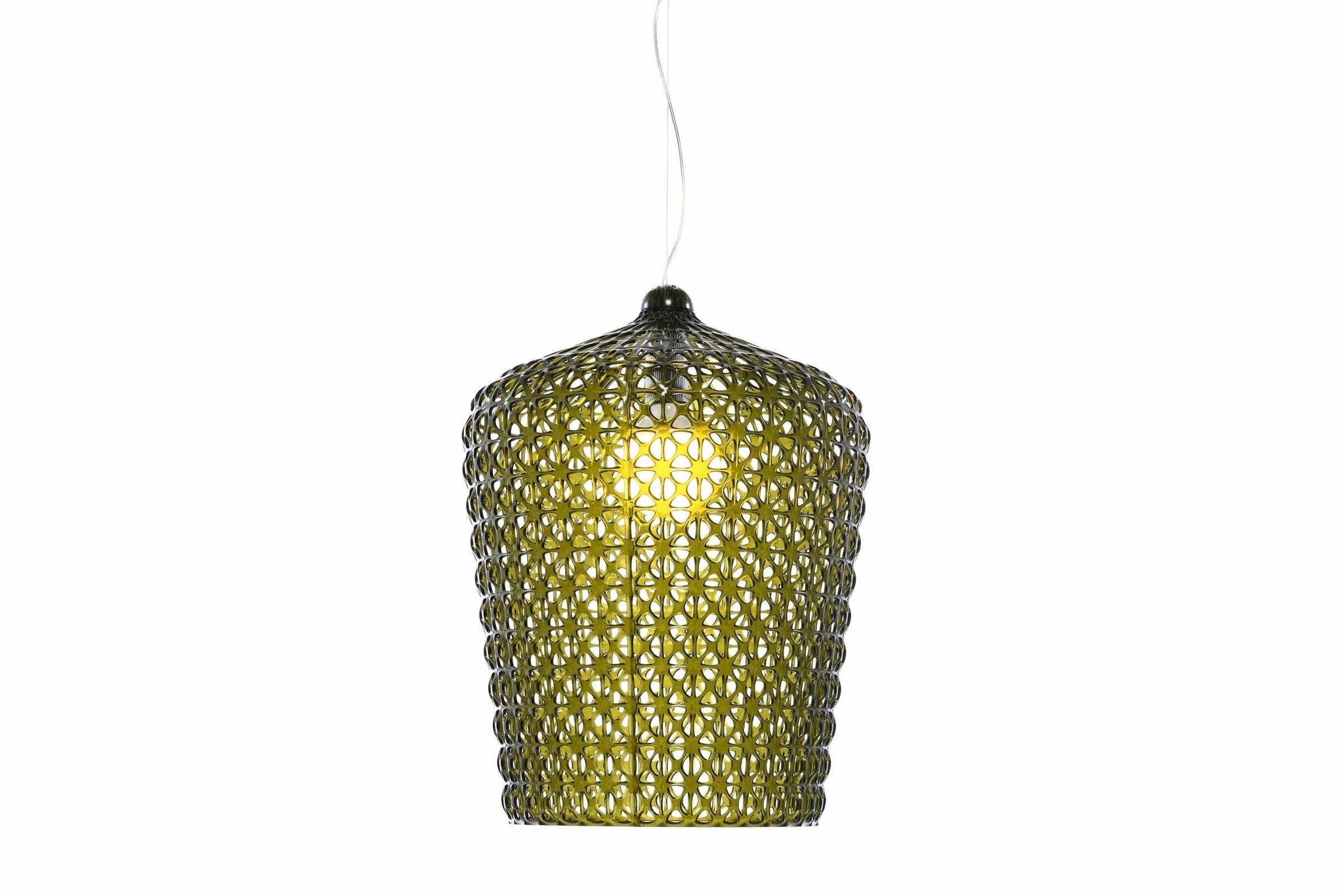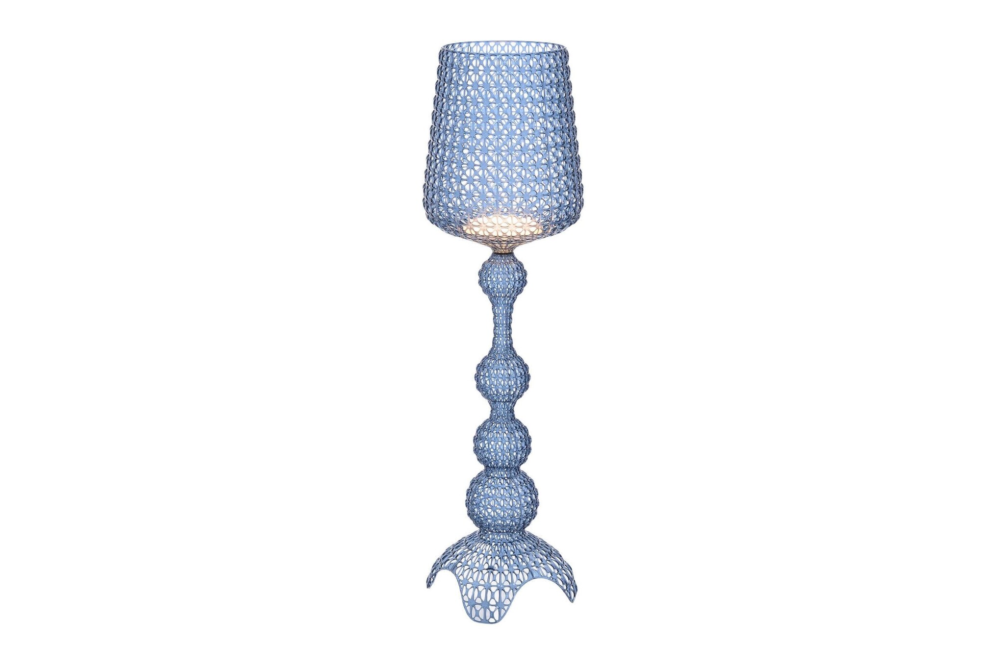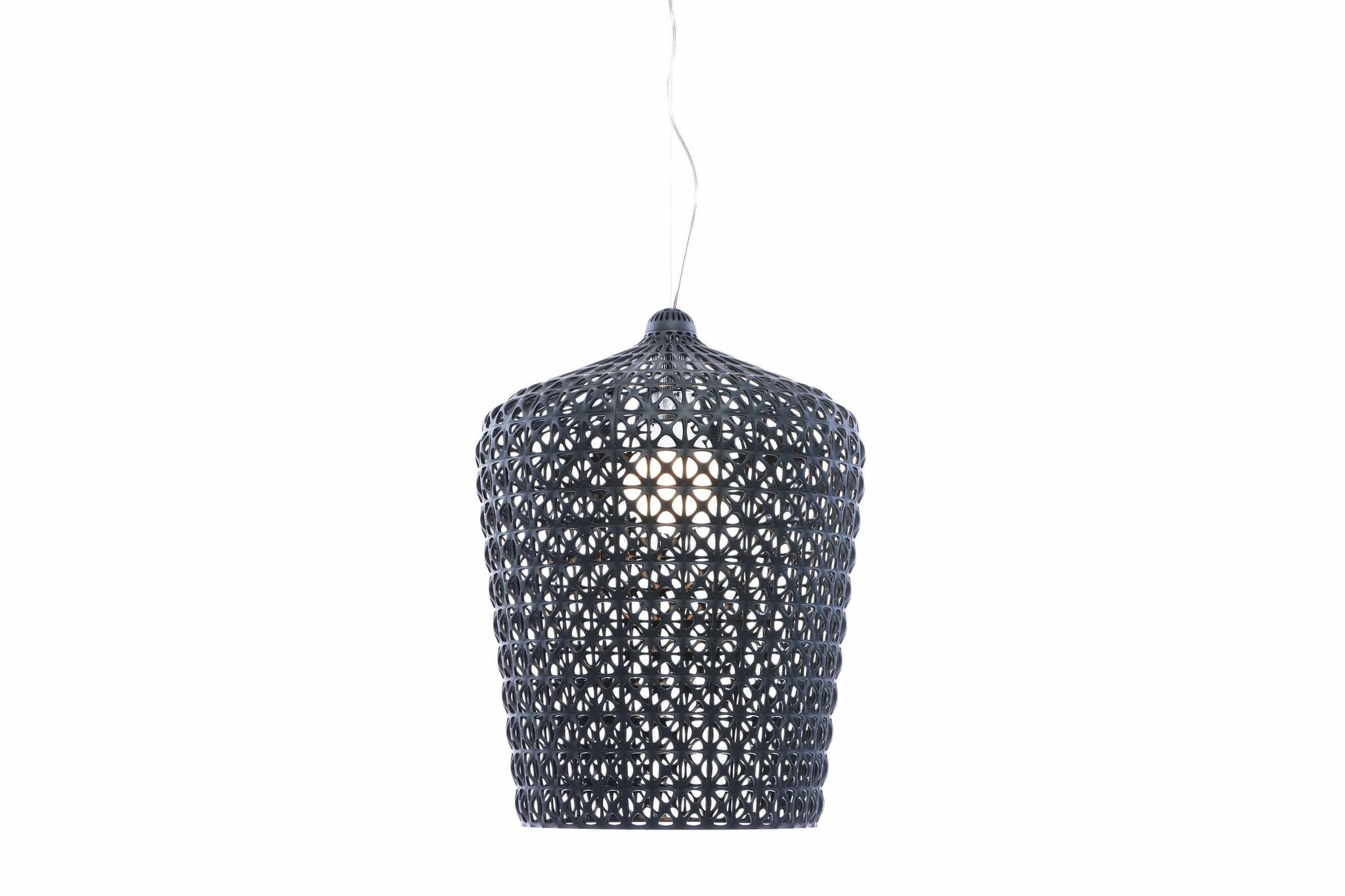 De Kartel Kabuki is een collectie van hanglampen en vloerlampen in vijf kleuren: lichtblauw, kristal, groen/goud, zwart en wit. De gebruikte technologie maakt het mogelijk om een geweven structuur van de lampenkap te creëren die lijkt op kant met een uniek geperforeerd oppervlak waardoor het licht op een speelse wijze wordt verspreid. Of u nu kiest voor de hanglamp of vloerlamp, in beide gevallen geeft het licht een mooi patroon.