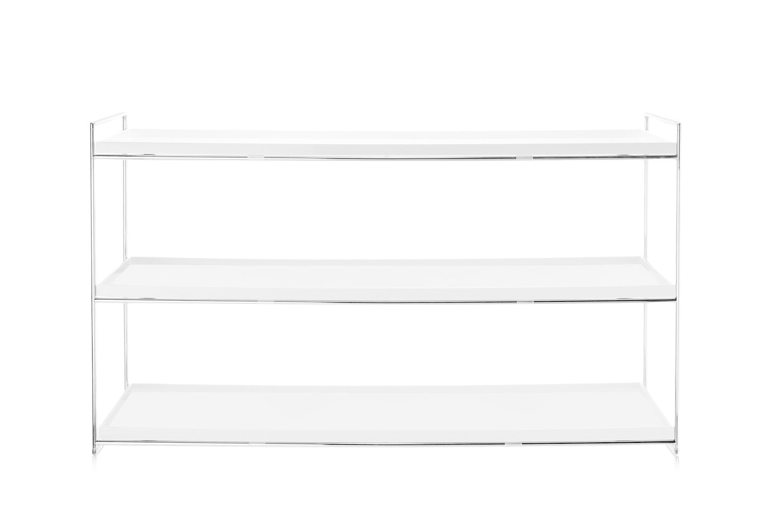 Er is ook een vierkante uitvoering van 80 x 80 cm. De bladen zijn wit of zwart en de ondersteunende structuren zijn van verchroomd staal. Dankzij de mogelijkheid om de metalen structuur weg te halen, dankzij een speciale hoekverbinding om het op zijn plaats te houden, is het verpakte product volledig vlak, waardoor vervoeren en opslaan handiger is. Ook bij het Trays-systeem hoort de trolleyuitvoering op wielen met drie bladen boven elkaar van 80 cm, of van 140 cm als boekenkast.