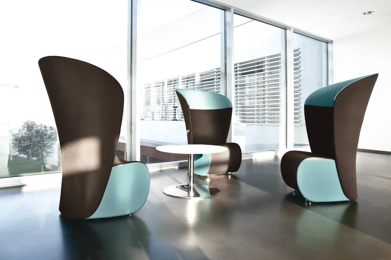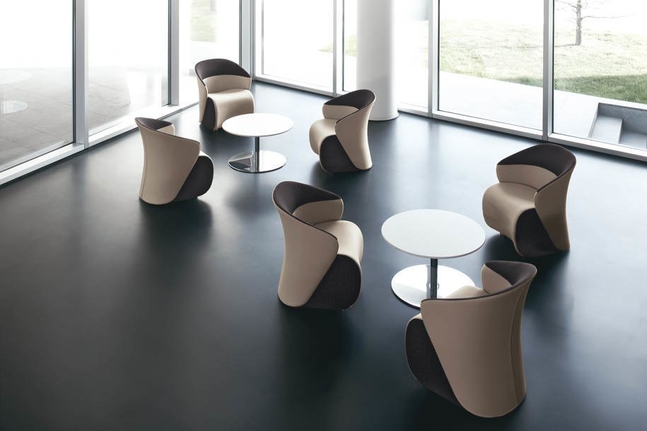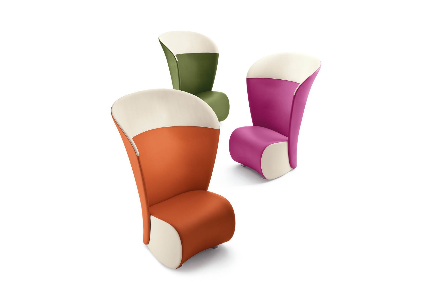 Kastel Koccola fauteuil met lage of hogere rugleuning voor rust en ontspanning, receptie- en gespreksruimtes, in de versies een of twee kleuren, met glijders of rollen. Over Kastel