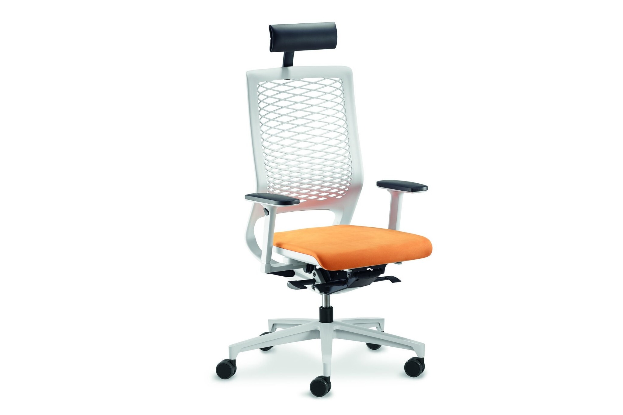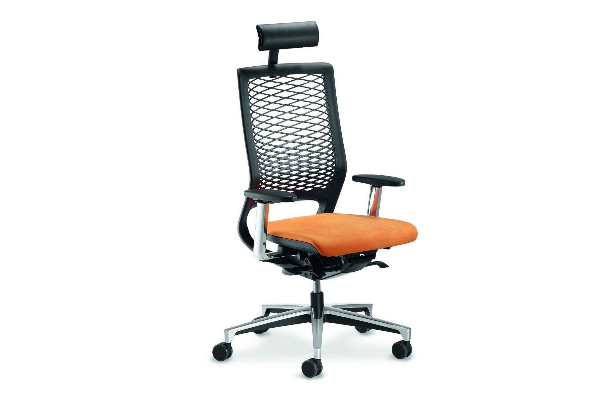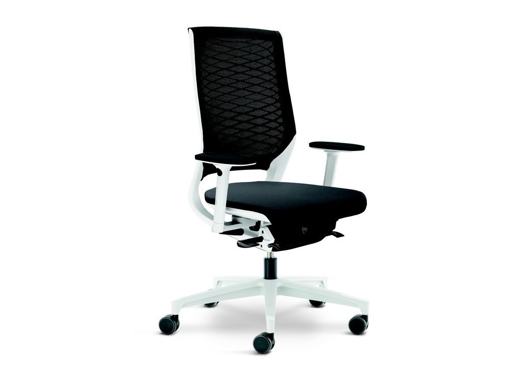 Mer89: bureaustoel met net rug, voorzien van hoofdsteun, leverbaar met en zonder armleuningen.