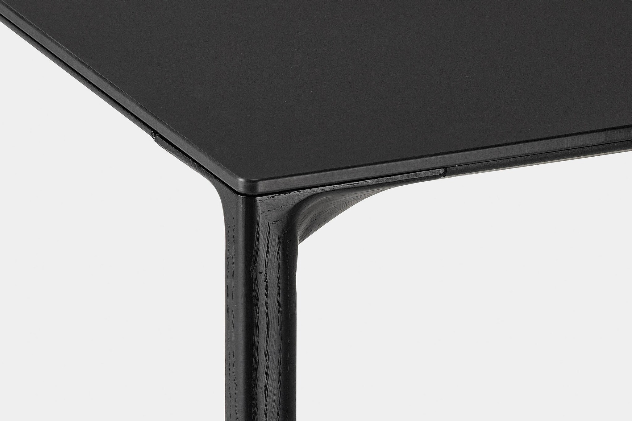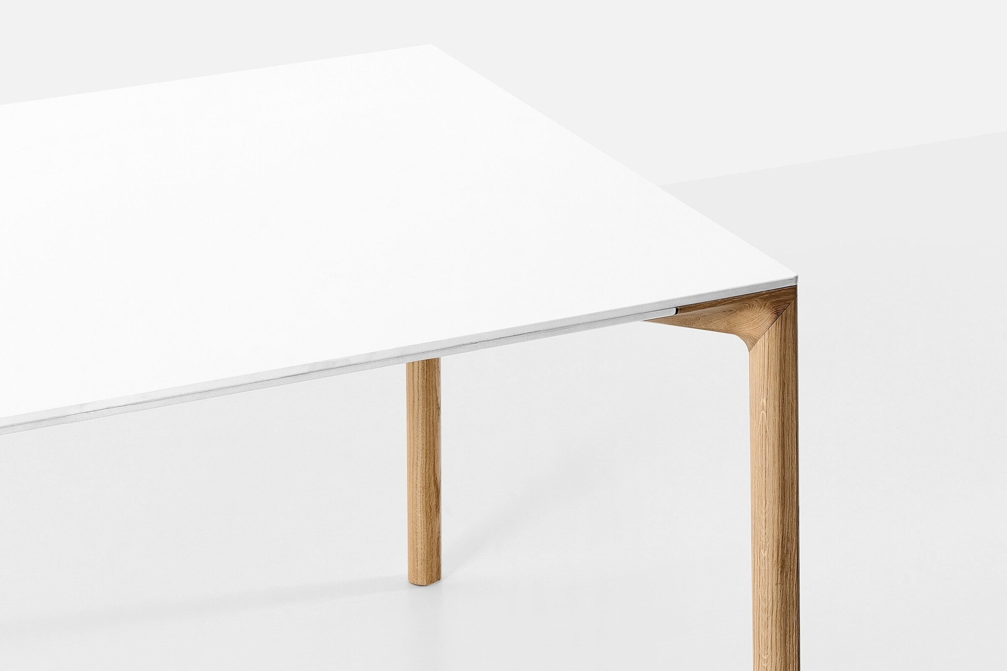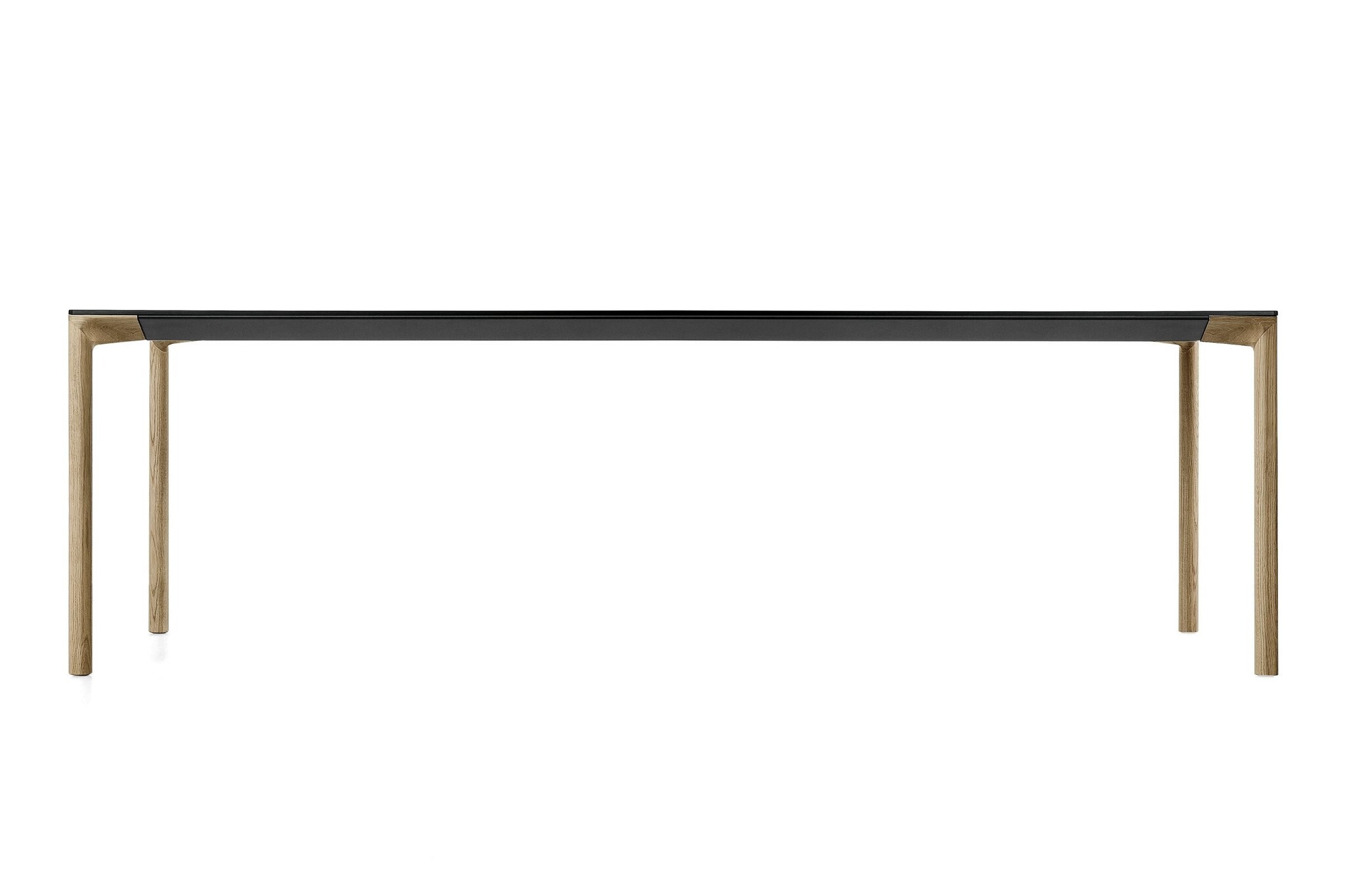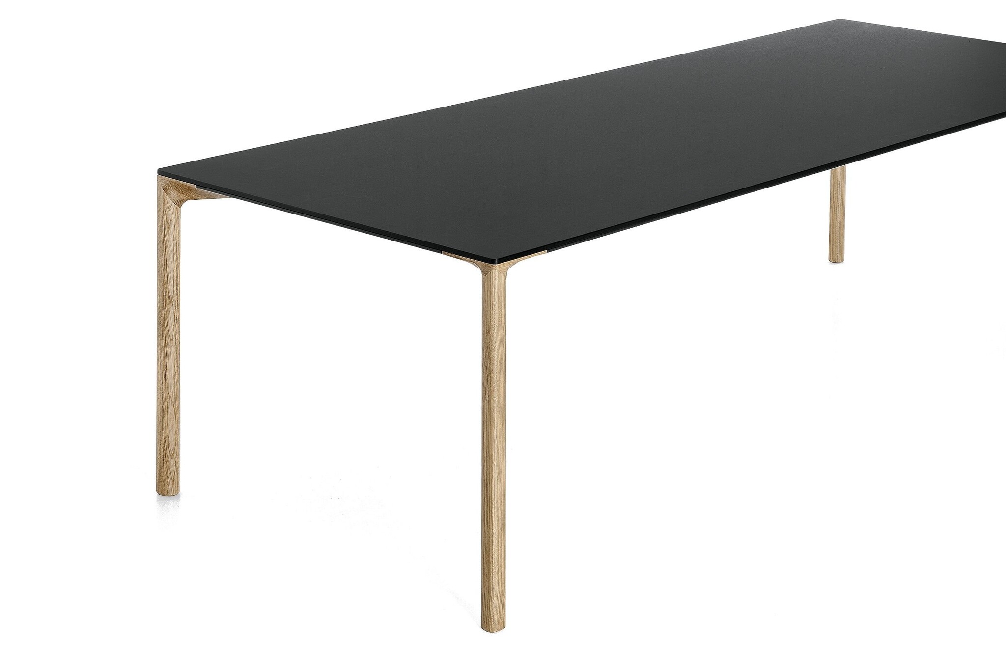De Kristalia Boiacca tafel heeft poten in massief eikenhout en is inwendig versterkt met een stalen kern. Het tafelblad is verkrijgbaar in Pure-wit laminaat of zwart Fenix-NTM met een soft-touch effect.