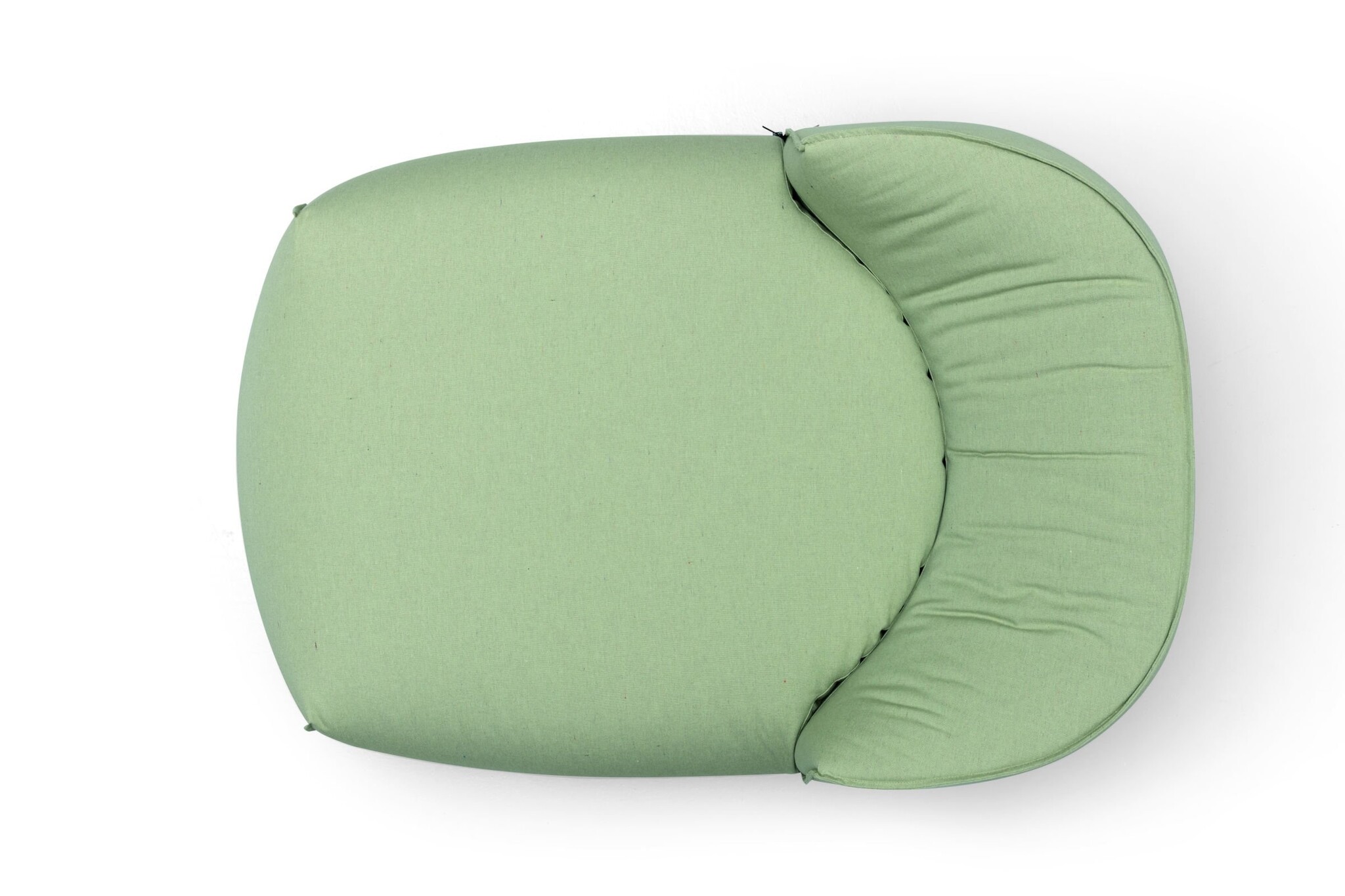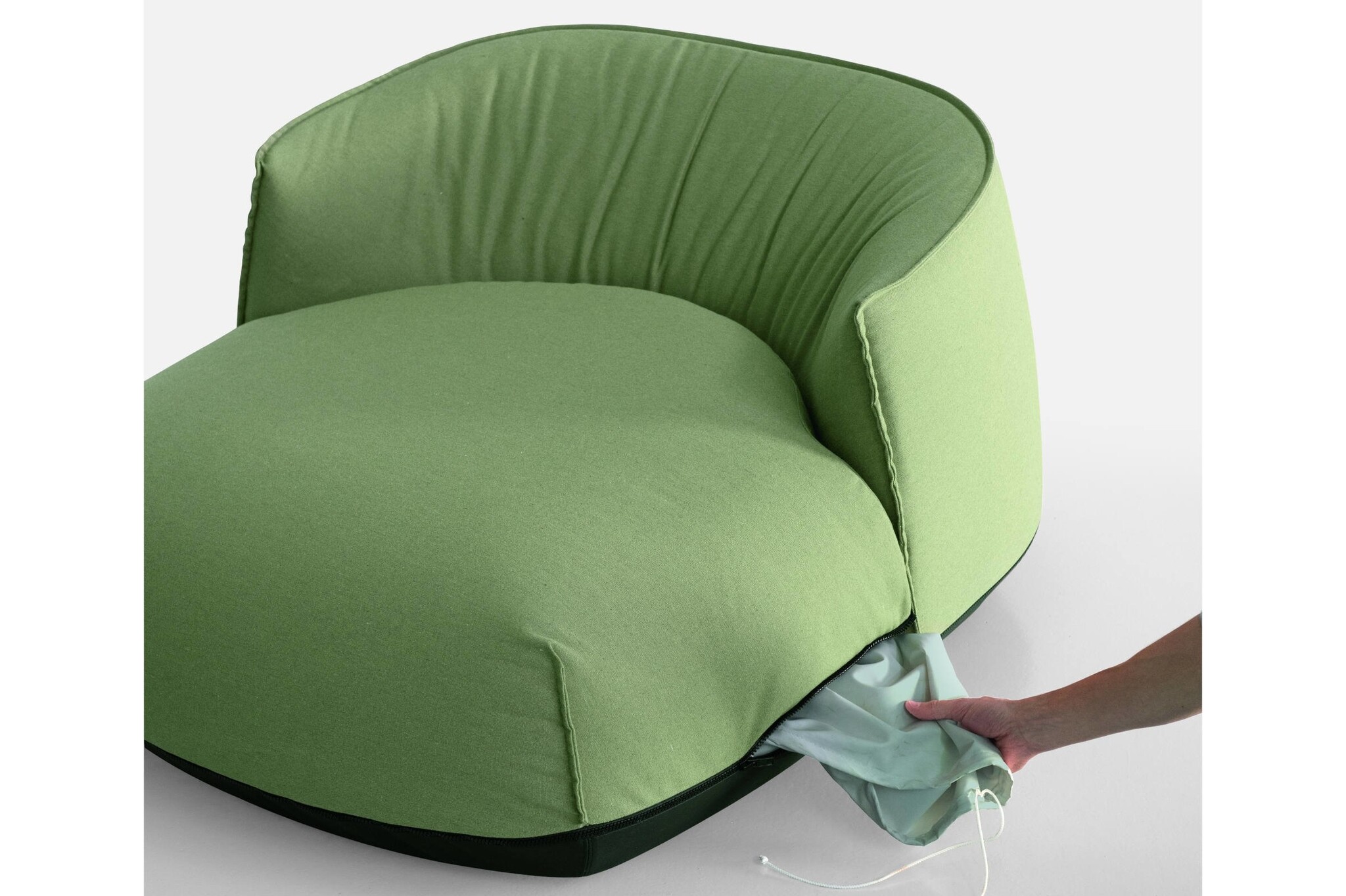 De onderkant van de fauteuil heeft een donkere band die direct contact tussen de grond en de bekleding voorkomt.