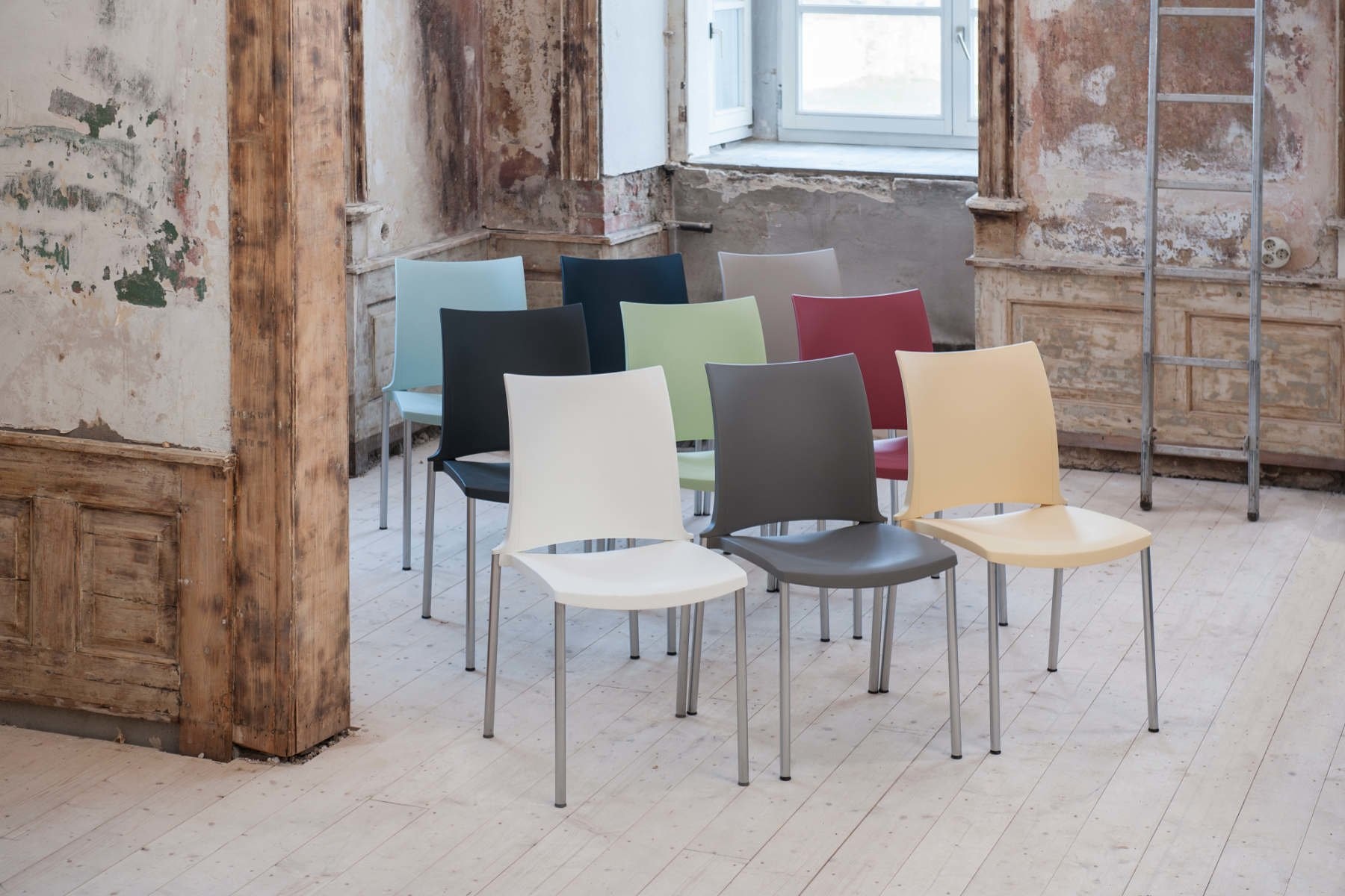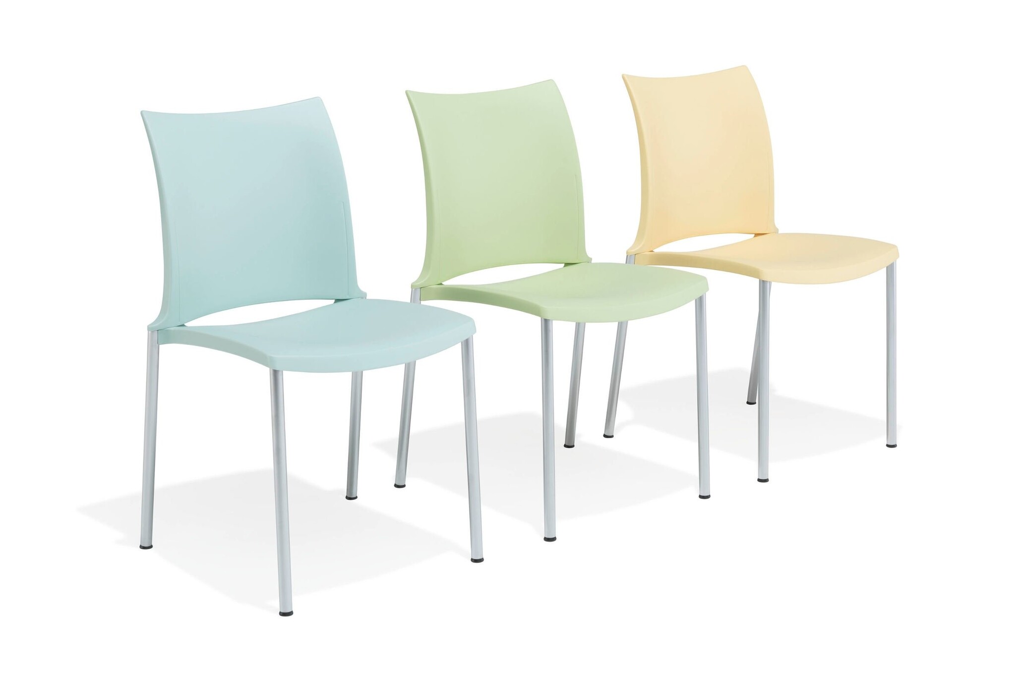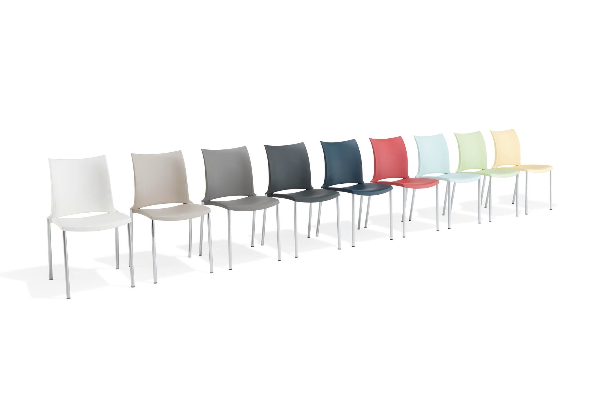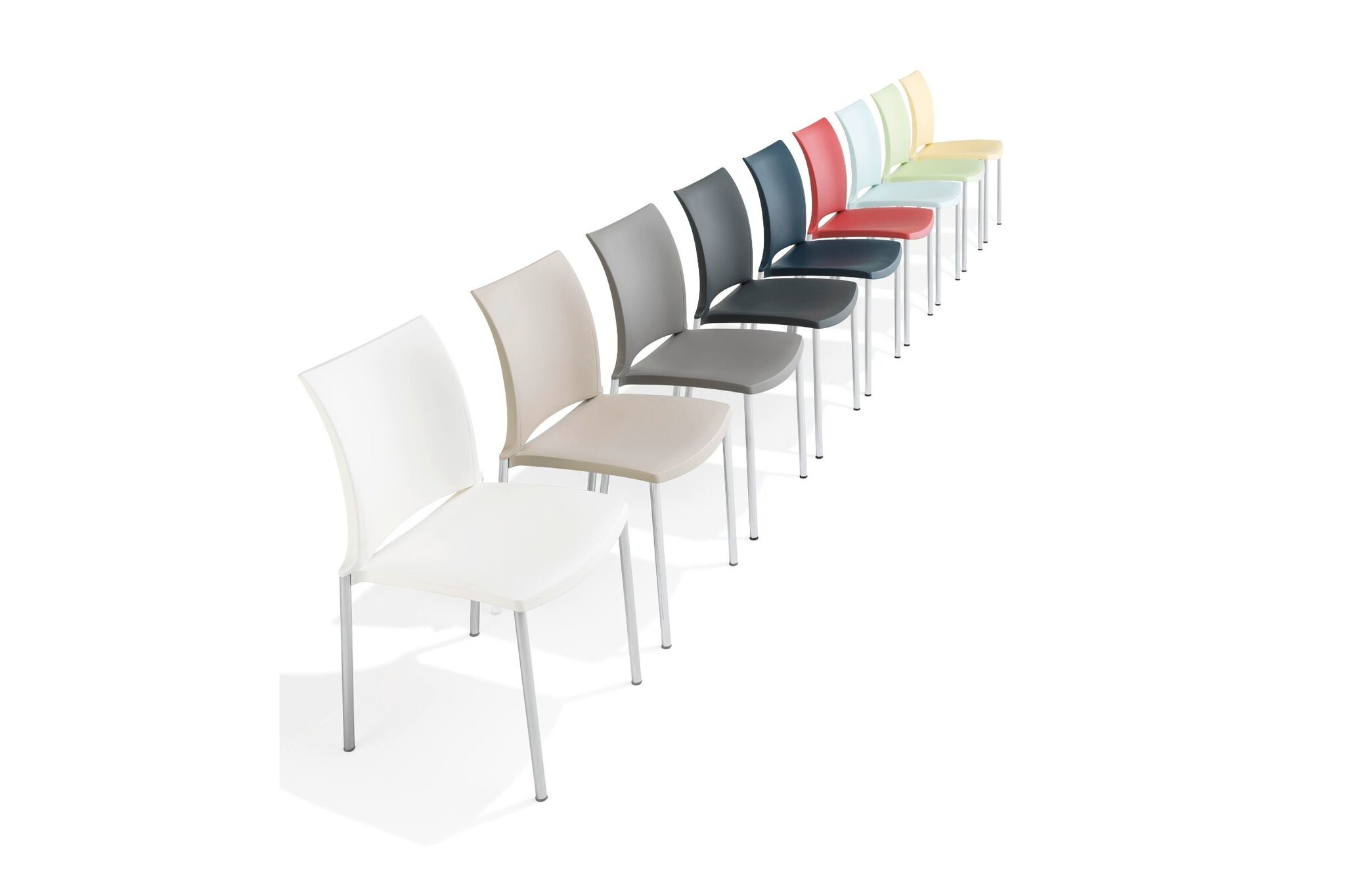 Kusch+Co Hola de allrounder onder de multifunctionele stoelen. Geschikt voor de foyer en de conferentiezaal, maar ook voor vergader- en onderwijsruimtes en casino's, tot zelfs voor grote zalen. Hola van Kusch+Co is eveneens geschikt voor gebruik in openlucht. Grote functionaliteit in een zeer mooie vorm! Hola van Kusch + Co heeft een aluminium onderstel gemoffeld, verchroomd of zijdemat verchroomd.Hola Kusch uitvoeringen: armleggers/zitting/rug kunststof white, lemon, strawberry, lavender, midnight blue, light grey en black (bestemd voor zowel binnen als buiten), tangerine, kiwi en sky blue (enkel voor binnen), kunststofglijder.De kleuren van de moffellak die voor buitengebruik bestemd zijn glanzen niet zo sterk als de normale moffellak.