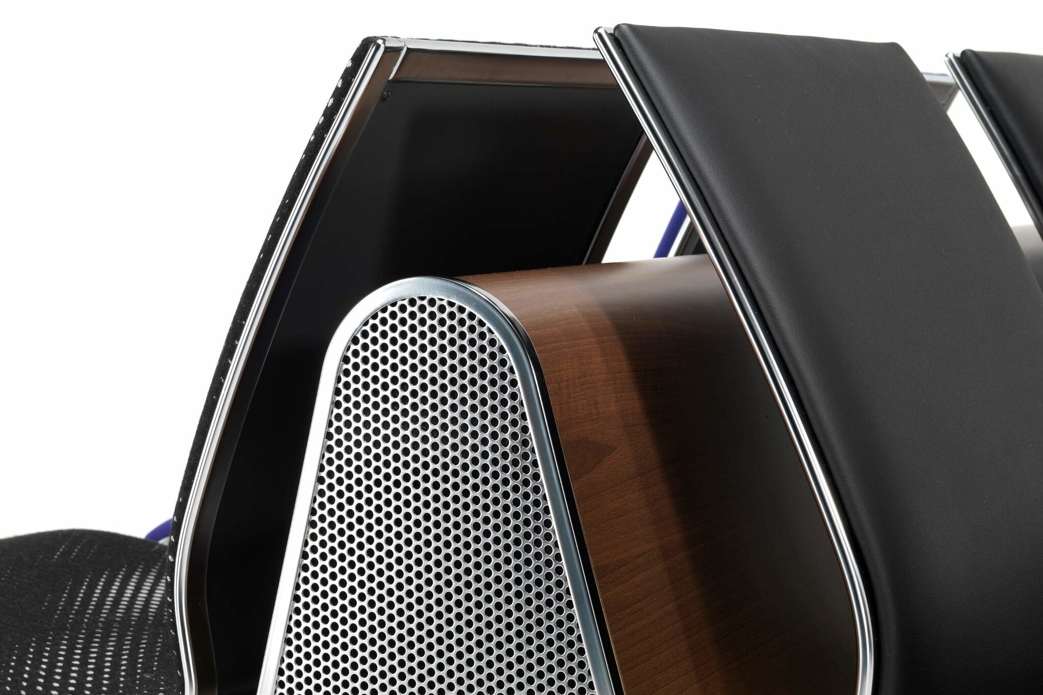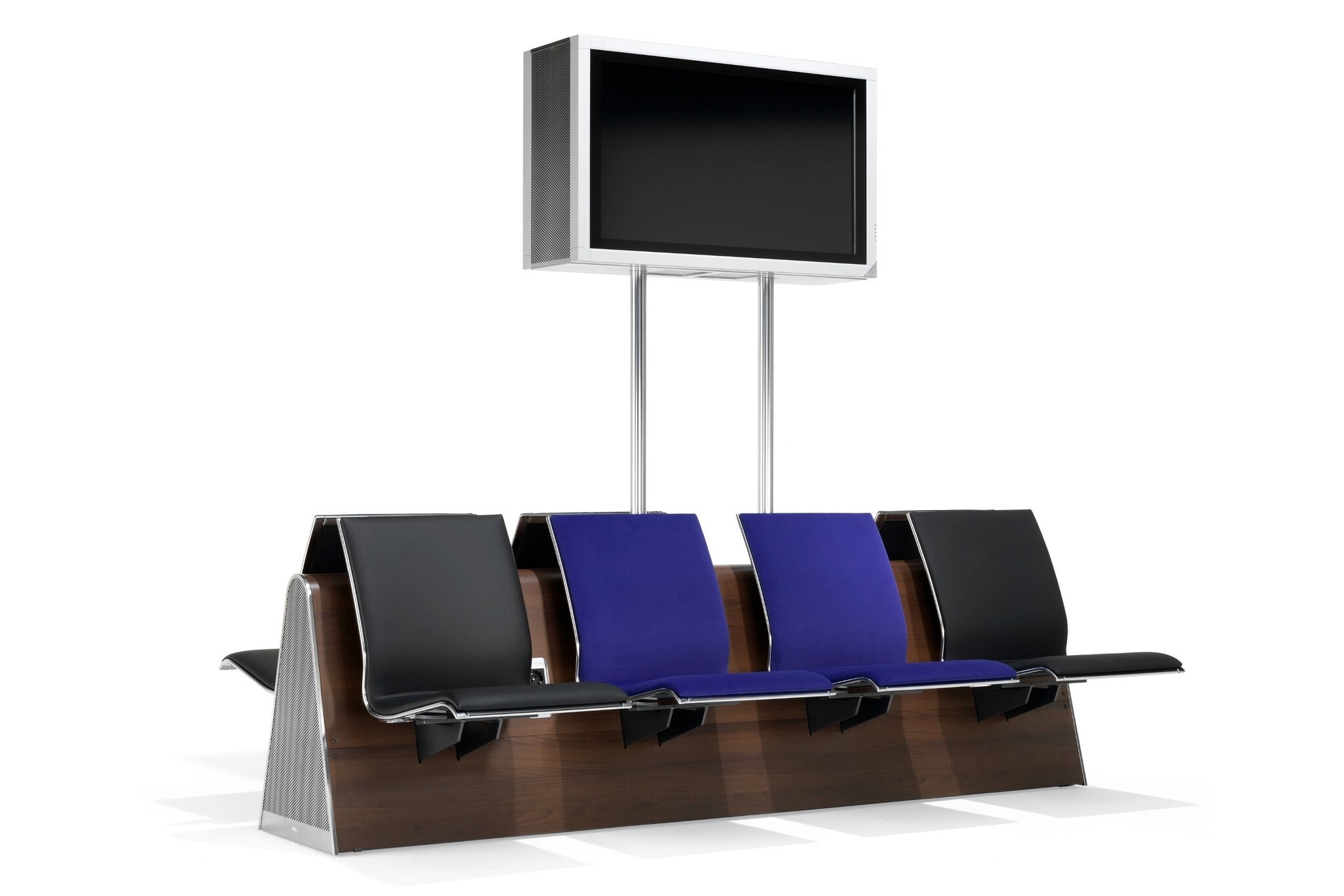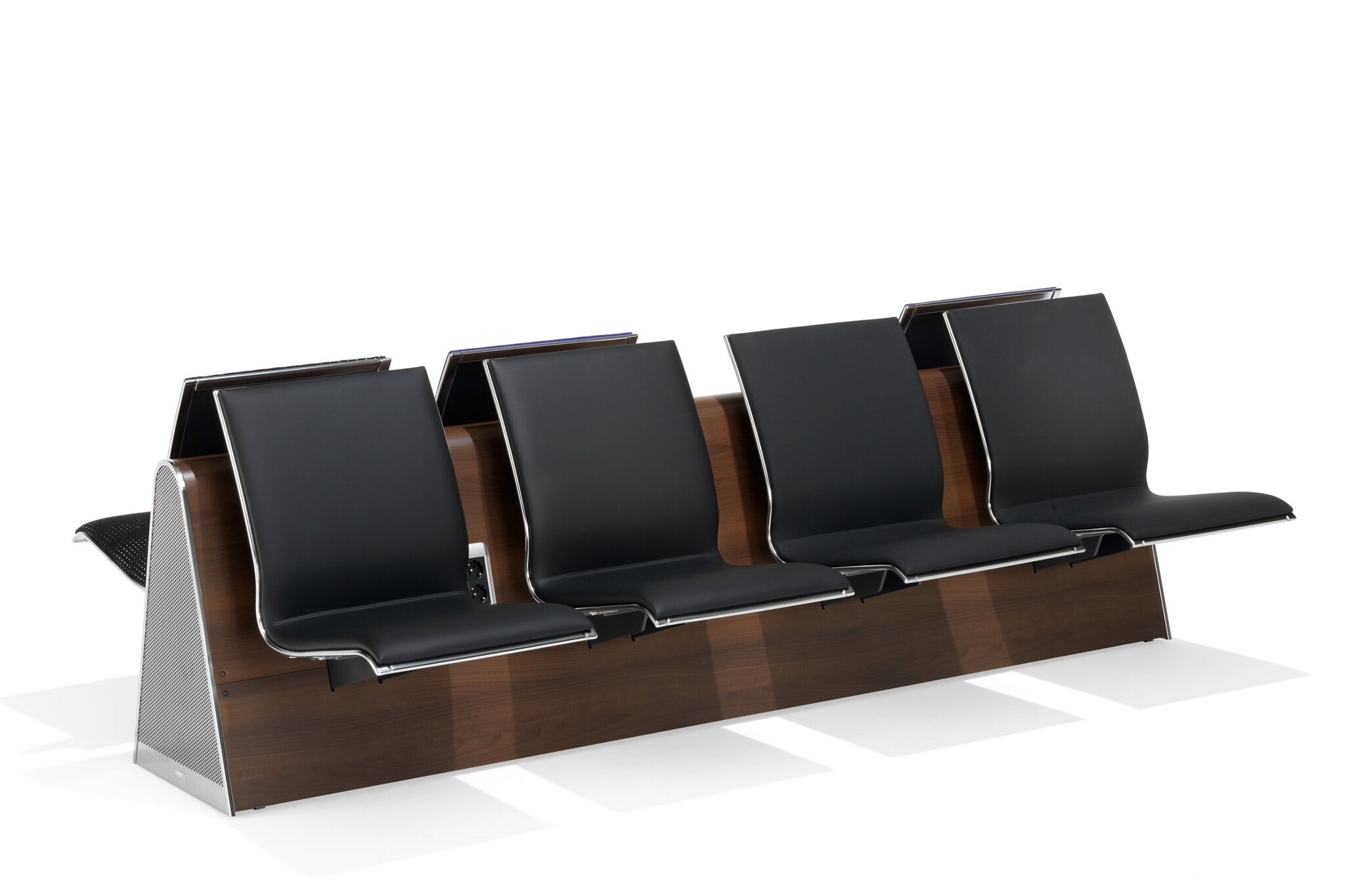 Kusch Terminal 7500 vereinigt zitcomfort en techniek in een bank. Het frame draagt niet alleen de zijdelings bevestigde zitschalen, maar biedt ook plaats aan een brede waaier aan technische installaties, zoals de airconditioning met luchtuitlaten, de stroomkabels met stopcontacten voor laptops of de kabels voor de luidsprekers of monitoren voor akoestische en visuele mededelingen. Ontworpen voor plaatsen waar vele mensen samenkomen, bijvoorbeeld in de foyers van hotels, van conferentiezalen en congrescentra of in de wachtzalen van stations of luchthavens. Materialen stof metaal hout