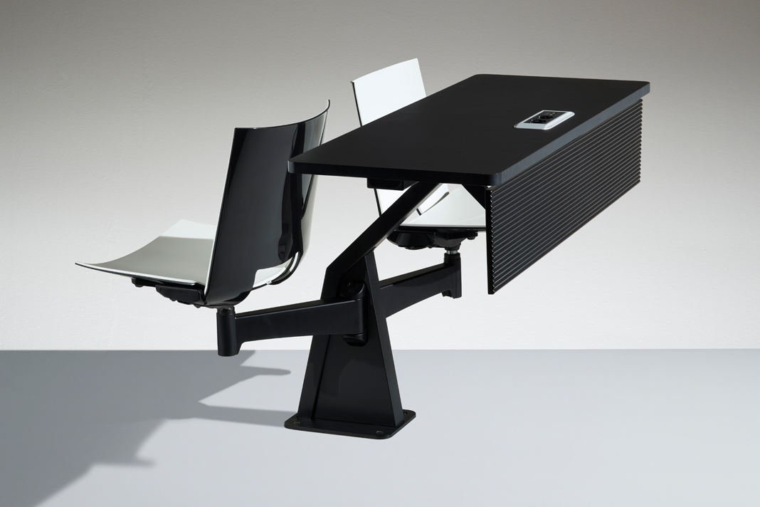 De buis in het midden van het bureau zorgt ervoor dat de ST12-13 stoelen met elkaar verbonden blijven, maar maakt het ook mogelijk om de hele Lamm ST12-13 plek te monteren aan de vloer.