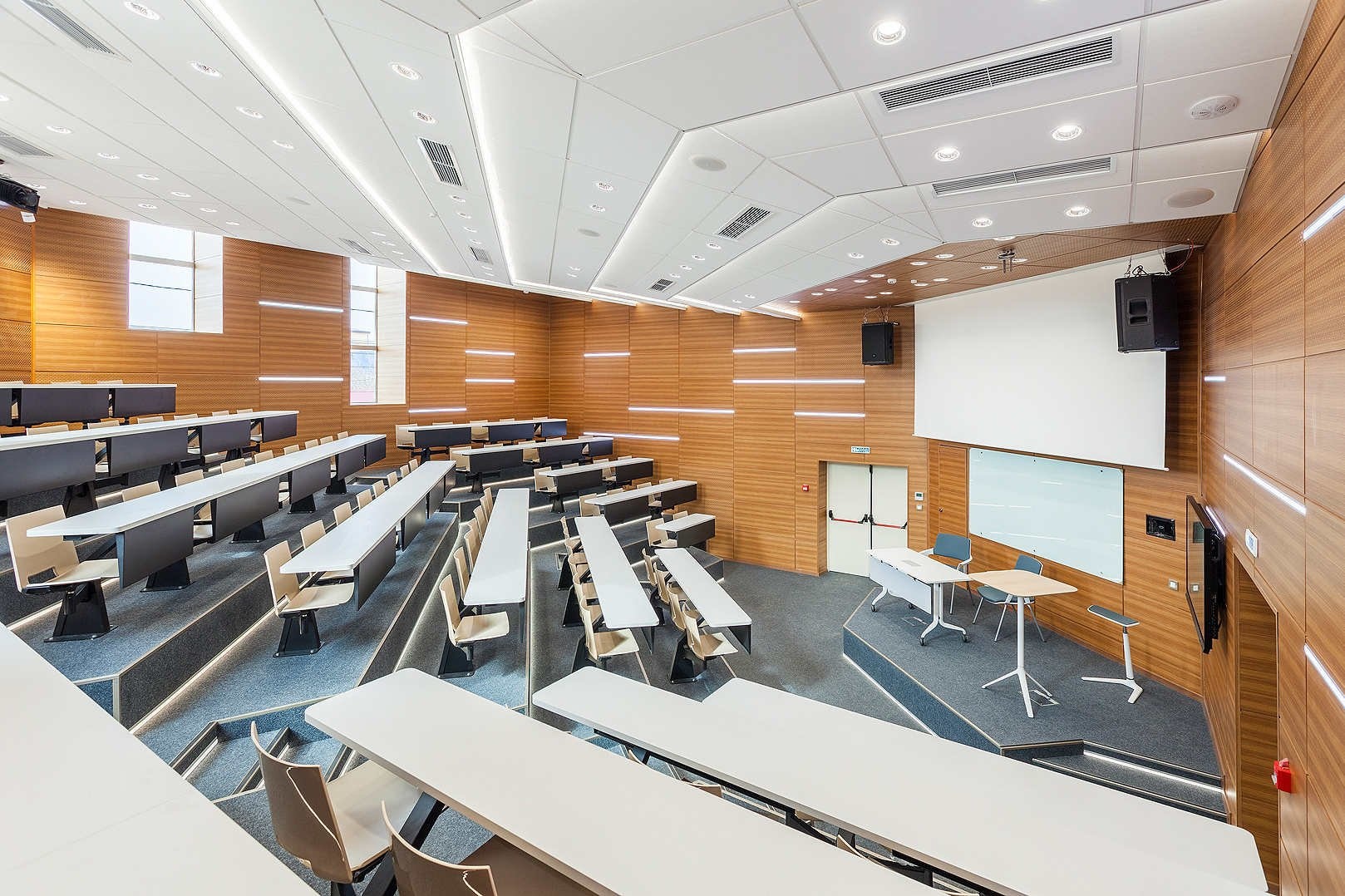 De stoel zit vast aan de tafel. Iedere werkplek is dan ook volledig voorzien van een stoel en een tafel waaraan gewerkt kan worden.