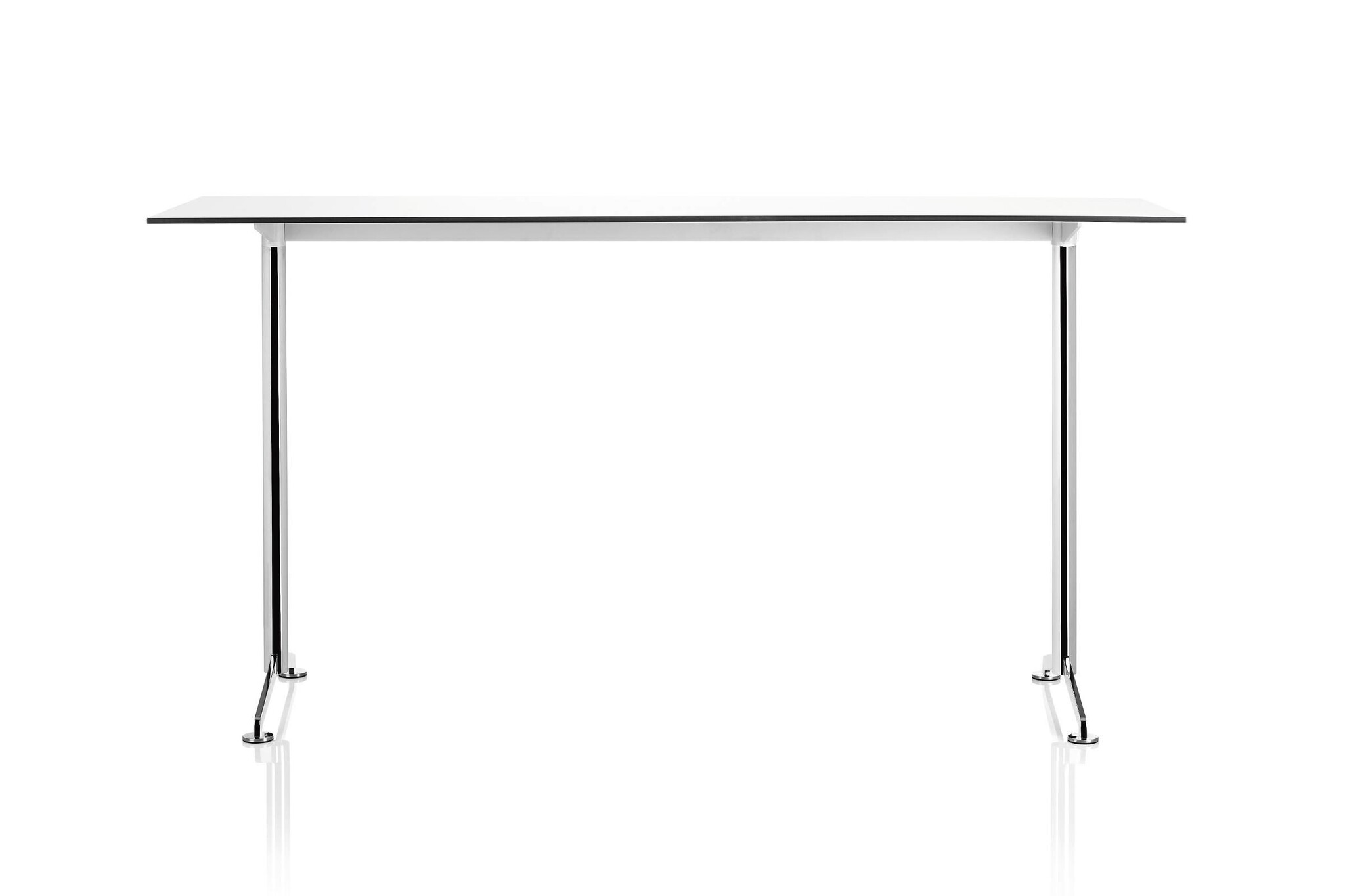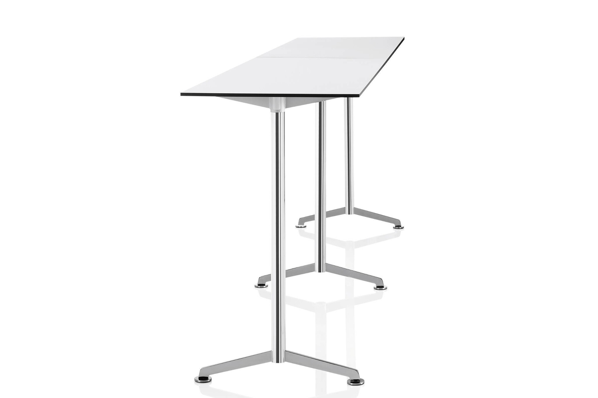 Tafelblad van 12 mm wit compact laminaat of 19 mm MDF met hoogglans laminaat. Onderstel uit verchroomd of poedercoated staal. Justierbare doppen en koppelbare tafelbladen.