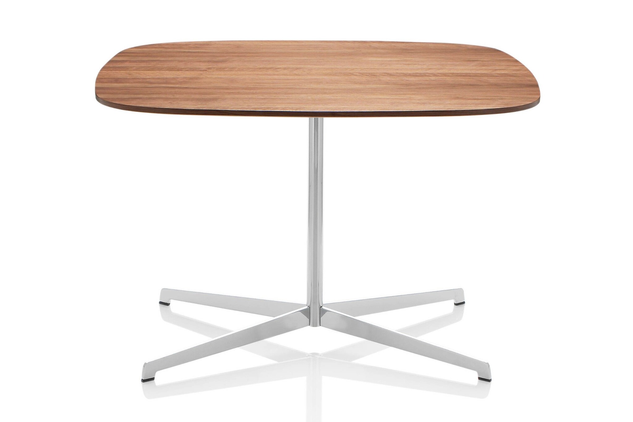 Lammhults Cooper Table heeft een tafelblad van 10/12 mm wit compact laminaat of 16 mm MDF met walnoot fineer en randen in walnoot. Onderstel uit verchroomd of poedercoated staal.