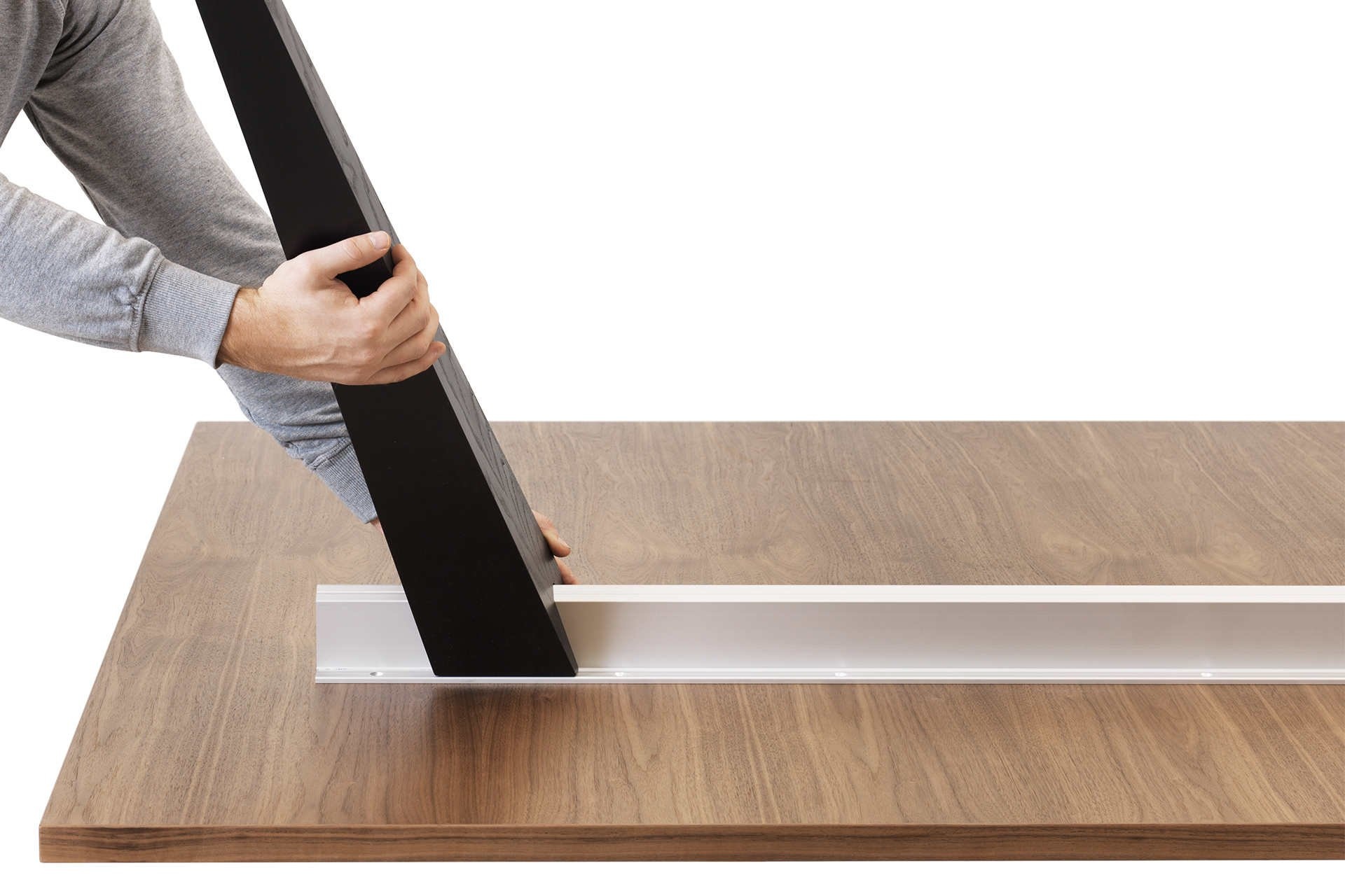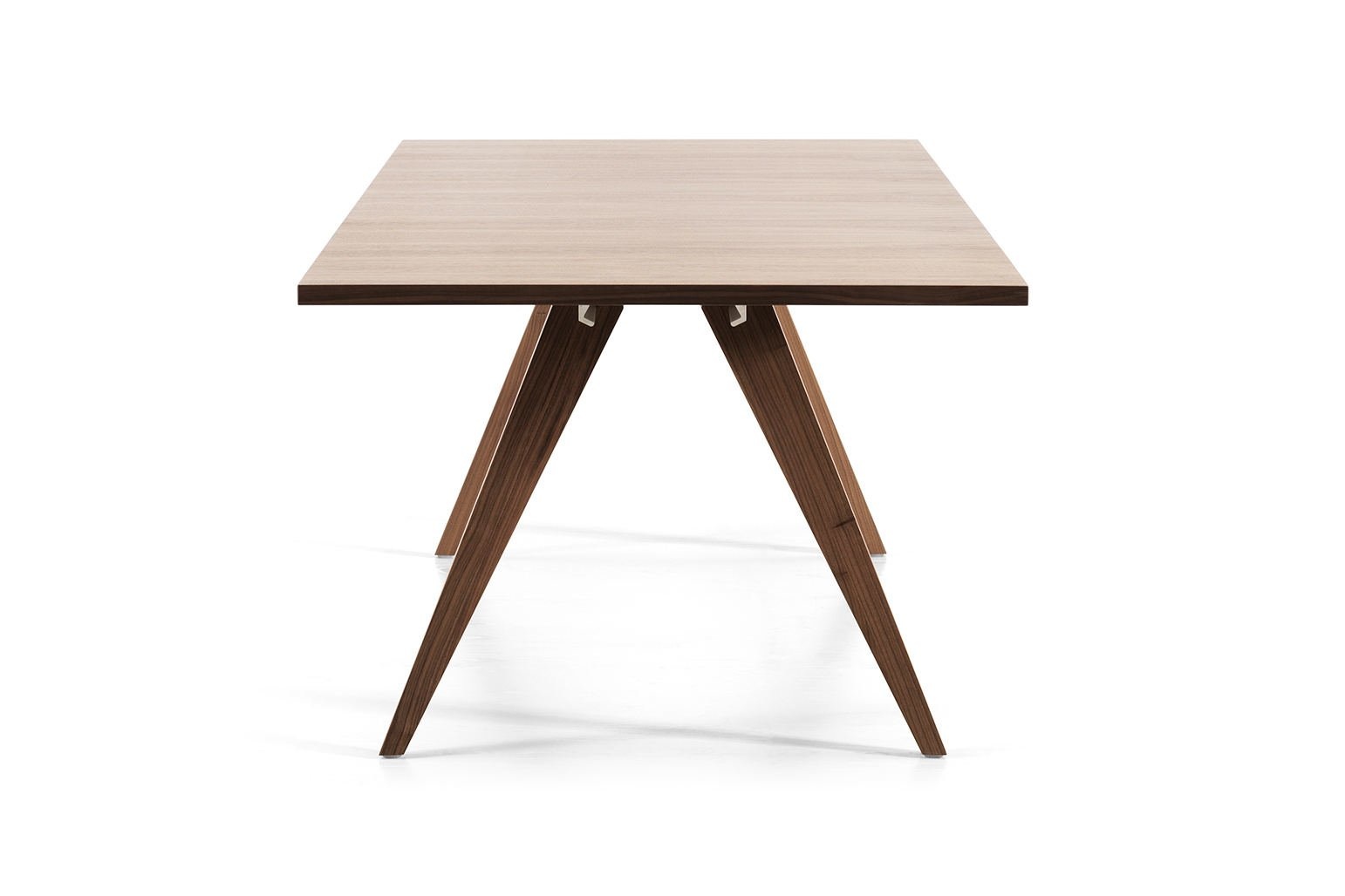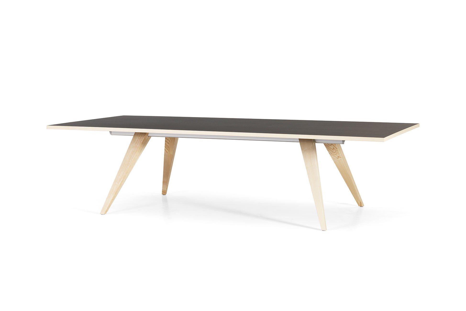 Tafelbladen in fineer: Natuurlijk essen / eiken, gebeitst essen of walnoot met bijpassende houten rand of in linoleum: Nero met een houten rand in donker gerookt eiken. Extra afwijkende houten rand in eiken, essen of walnoot tegen meerprijs.