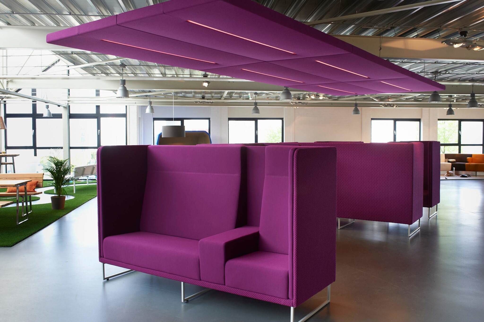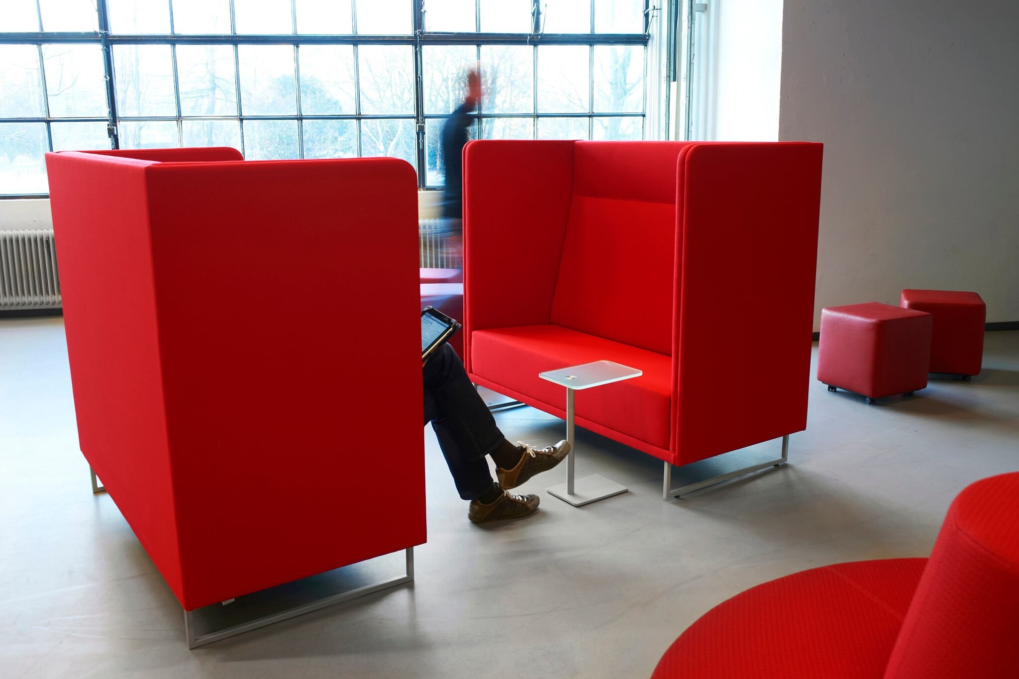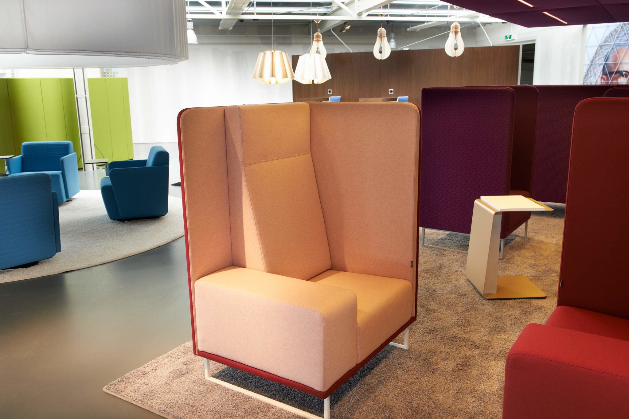 Lande 1st Class lounge werkplek | banken. Bij de luxe coupe-zit zijn zeer veel toepassingen en mogelijkheden. De hoge rugleuning zorgt voor een visuele afscheiding en heeft daarnaast een geluiddempende werking. De 1st Class lounge banken kunnen tegen over elkaar geplaatst worden. Er ontstaat dan een soort kamer, die gebruikt kan worden voor informeel overleg. De Lande 1st Class past bij het nieuwe werken | open kantoorruimtes.