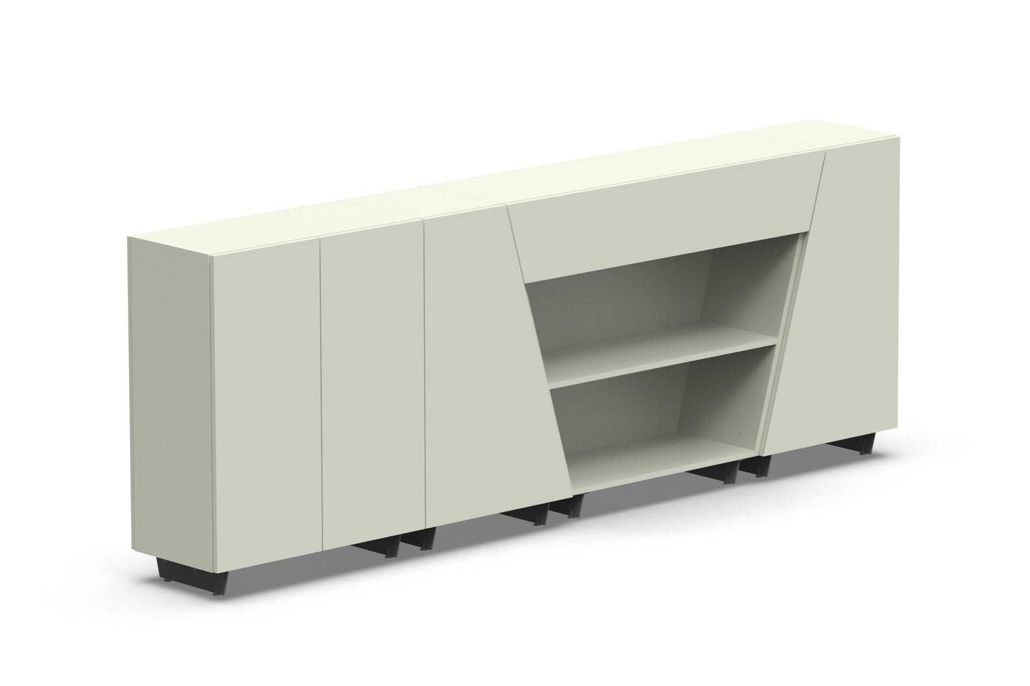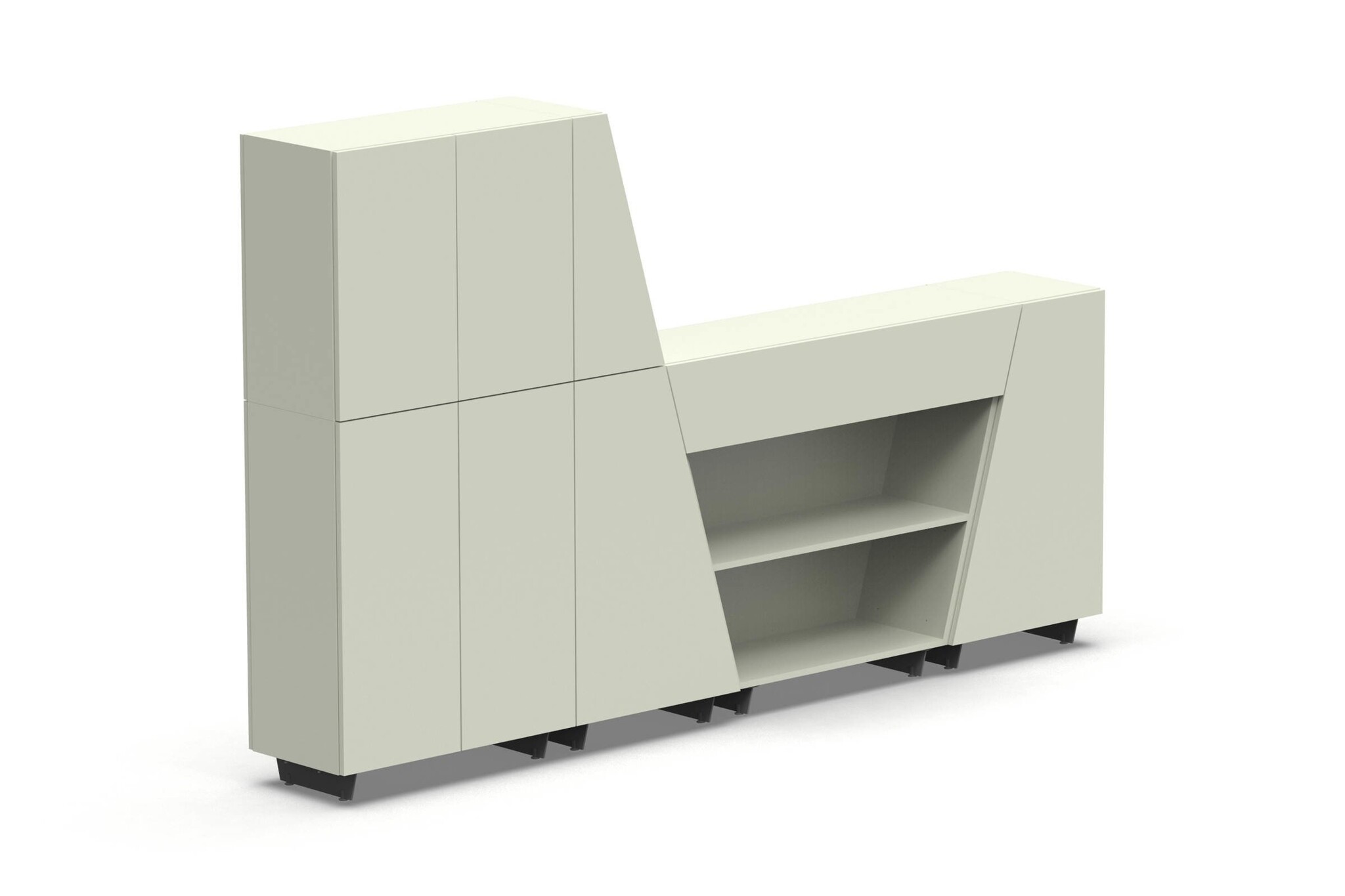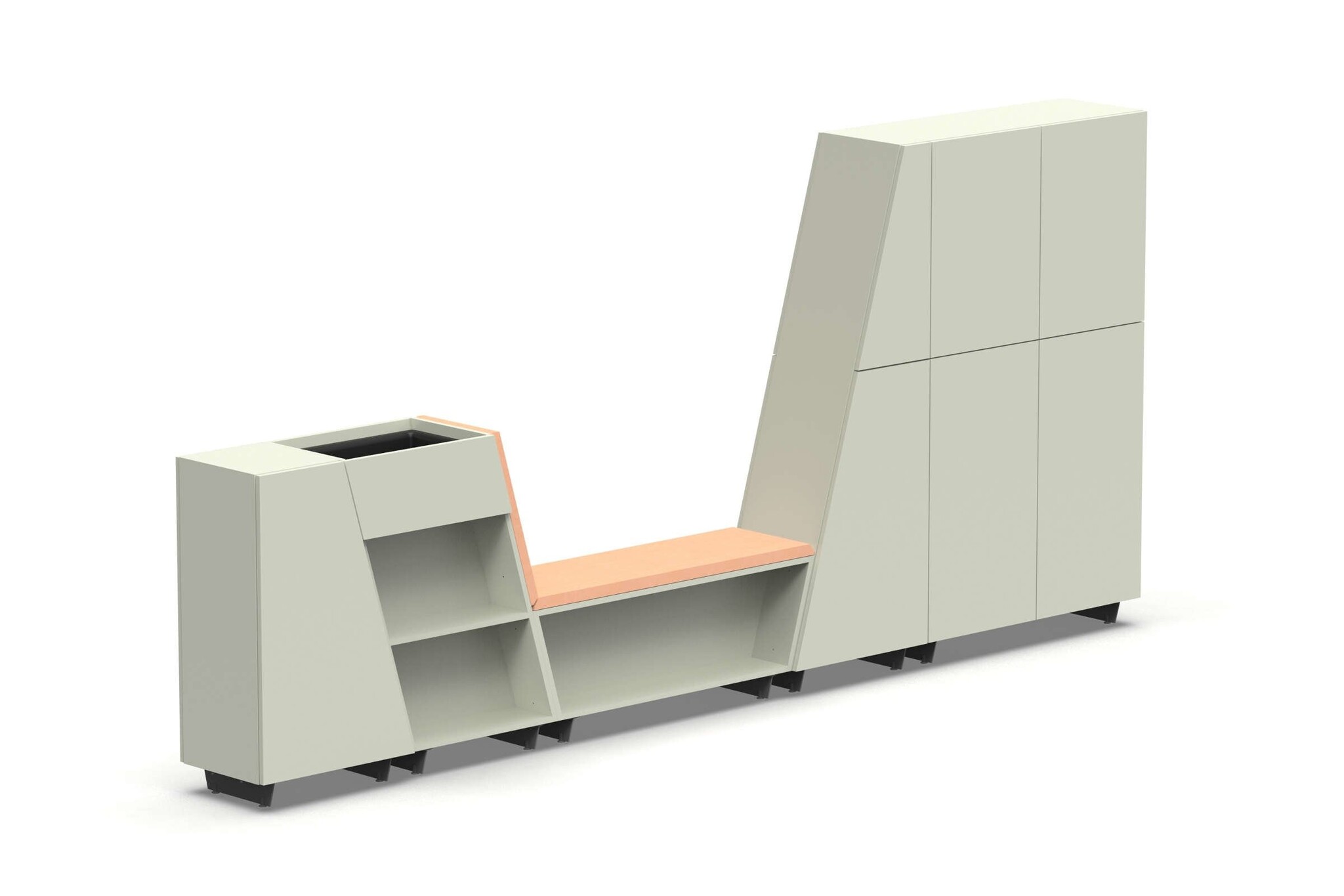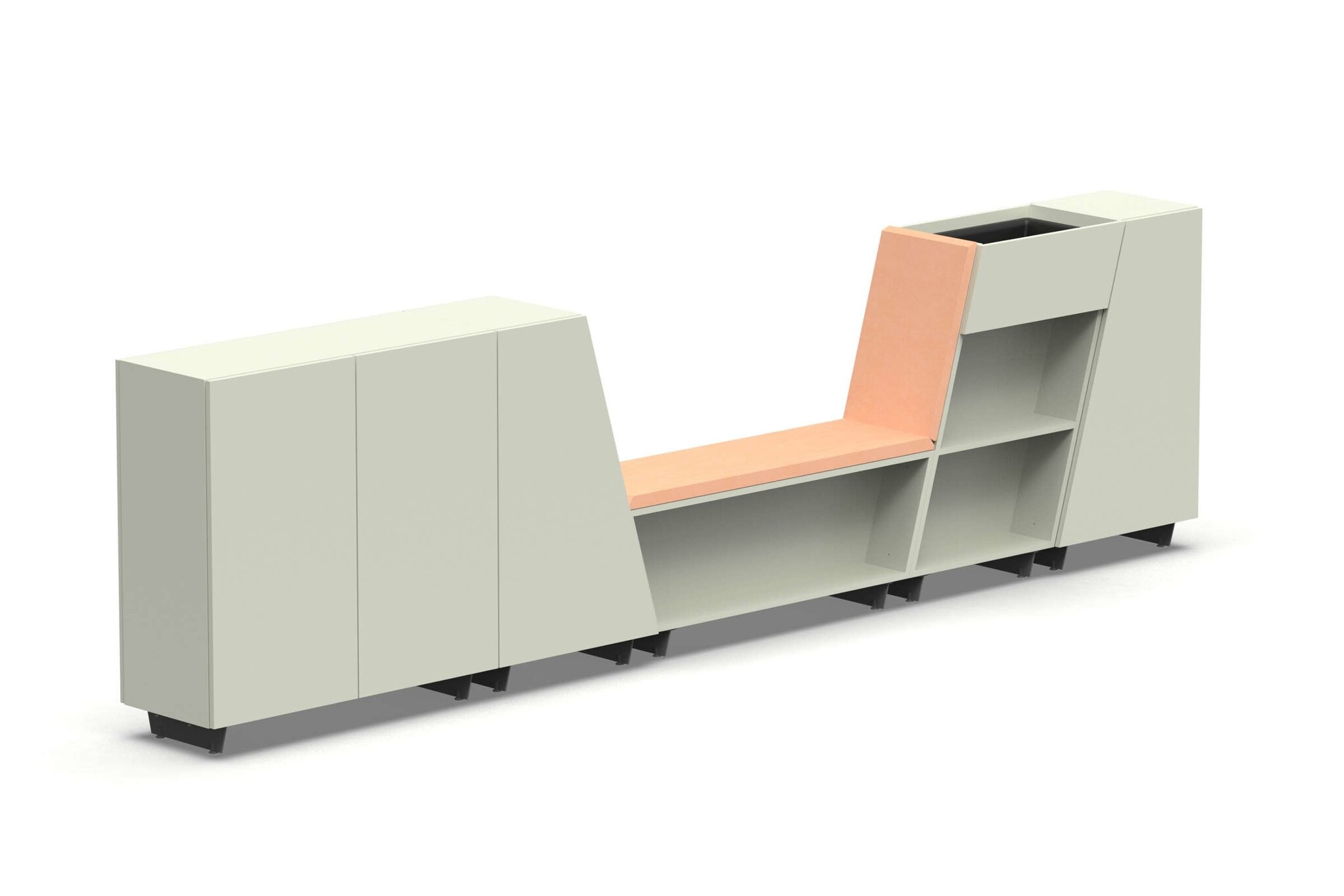 De Lande Petram is een modulair kasten systeem dat opbergruimte combineert met een interactief zitgedeelte. De diverse elementen van de Petram kunnen worden gecombineerd om tot een multifunctionele roomdivider te komen. In de open kantoren van vandaag waarbij flexplekken en clean desk de norm zijn, is het fijn om opbergruimte te hebben die meerdere functies heeft, namelijk als zitje en roomdivider. Met de Lande Petram is dit allemaal mogelijk. Ondanks dat de ruimte opgedeeld wordt in kleinere werkruimtes, blijft met Petram sociale interactie tussen collega’s mogelijk, bijvoorbeeld door te spelen met hoge en lage elementen van de kast of zitgedeeltes. Deze roomdivider is leverbaar met desgewenst een interactief zitgedeelte, diverse open of dichte kasten om kantooritems in op te bergen en ruimte voor planten. Groen op kantoor is immers een goed voor de medewerkers.
