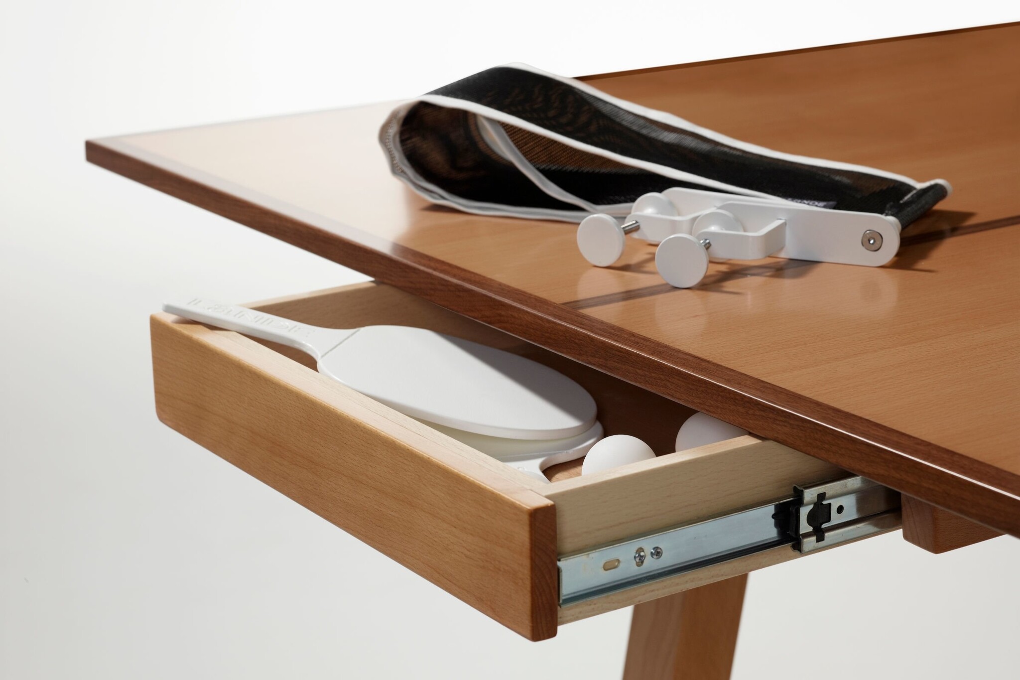 Aan de korte zijdes van de Lande Ping tafel zit een laatje, inclusief twee batjes en een net voor een potje tafeltennis.