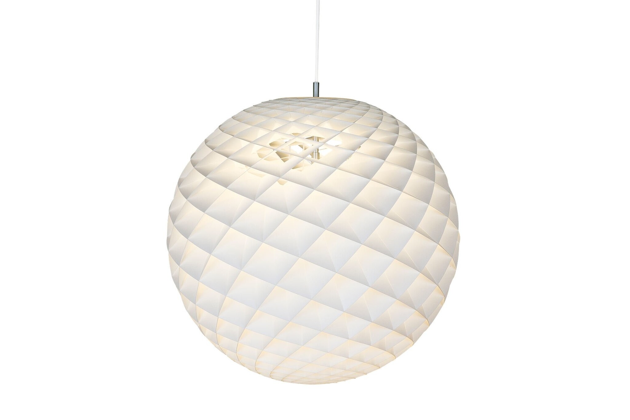 De Patera hanglamp is een stralende bol die is opgebouwd uit kleine diamantvormige cellen. Elke cel is zorgvuldig ontworpen om licht op te vangen en de lichtbron af te schermen voor zichthoeken boven de 45 graden.Echt elke cel van de Poulsen Patera plafondlamp straalt. Onder de 45 graden zijn de velden open om licht naar beneden te richten. Een kleine hoeveelheid licht wordt ook naar boven gestuurd om het plafond te verlichten.