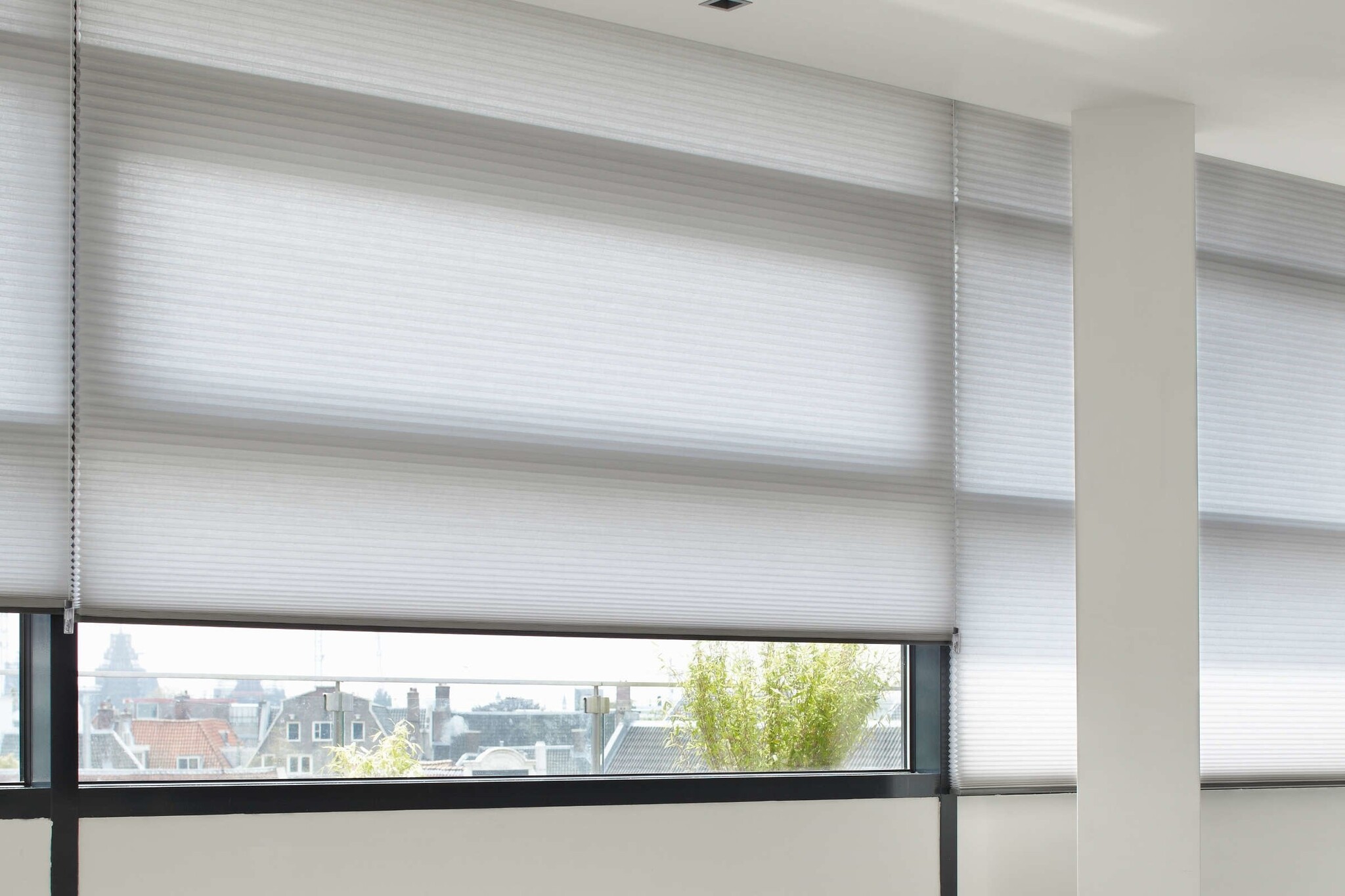 De stof van de Duette Batiste biedt de mogelijkheid om dezelfde kleur in alle drie de transparanties te gebruiken. Afhankelijk van de gewenste privacy en lichtinval, kunt u voor elke kantoorruimte een andere transparantie kiezen en toch dezelfde kleur voor de ramen hangen.