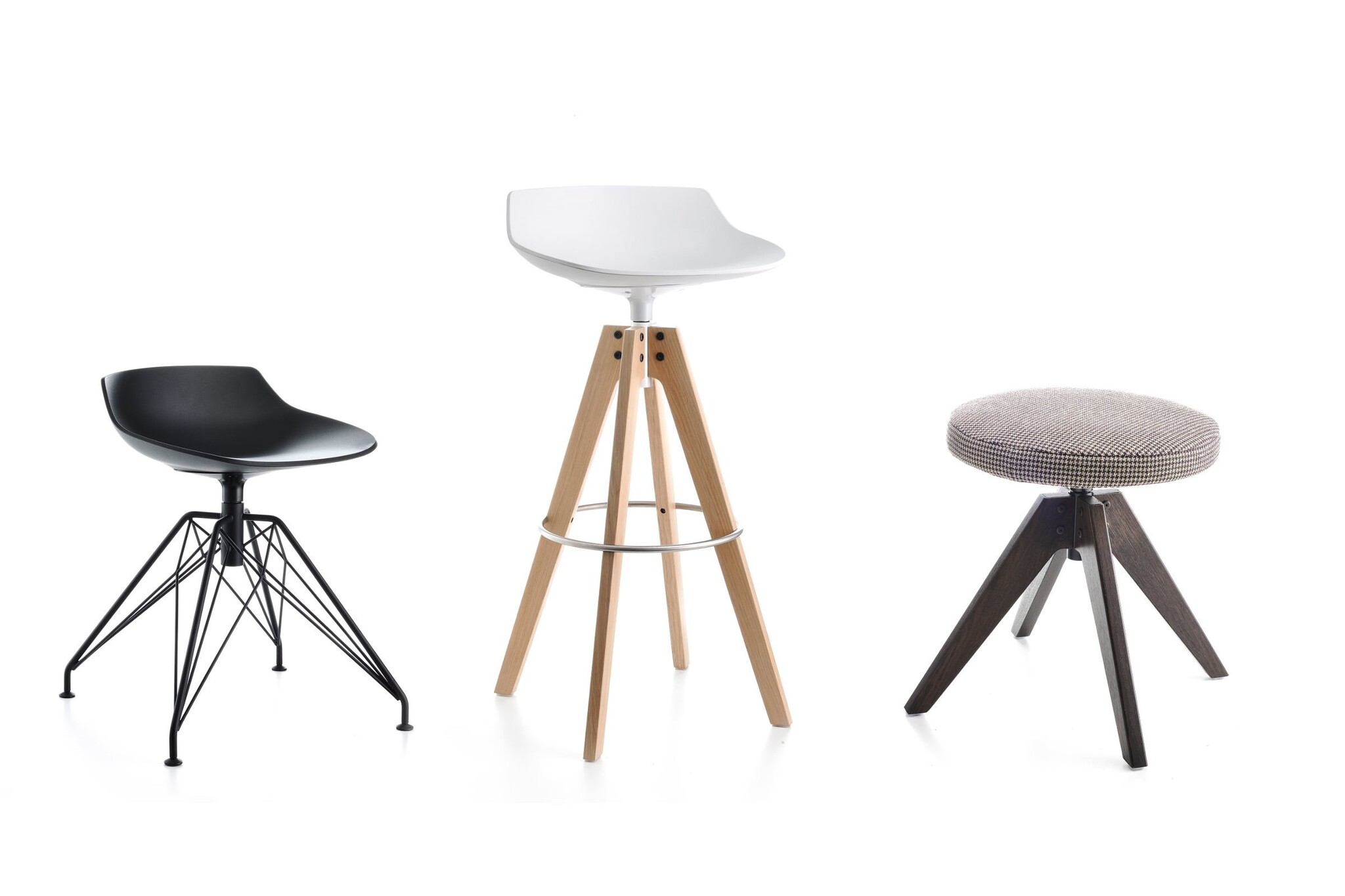 4 poten base staal, metaal, geschilderd mat wit of grafiet, met aluminium koppelinrichting in dezelfde kleur, 360 graden draaibaar. Stoelhoogte beschikbaar in: 44, 65 en 78 cm.