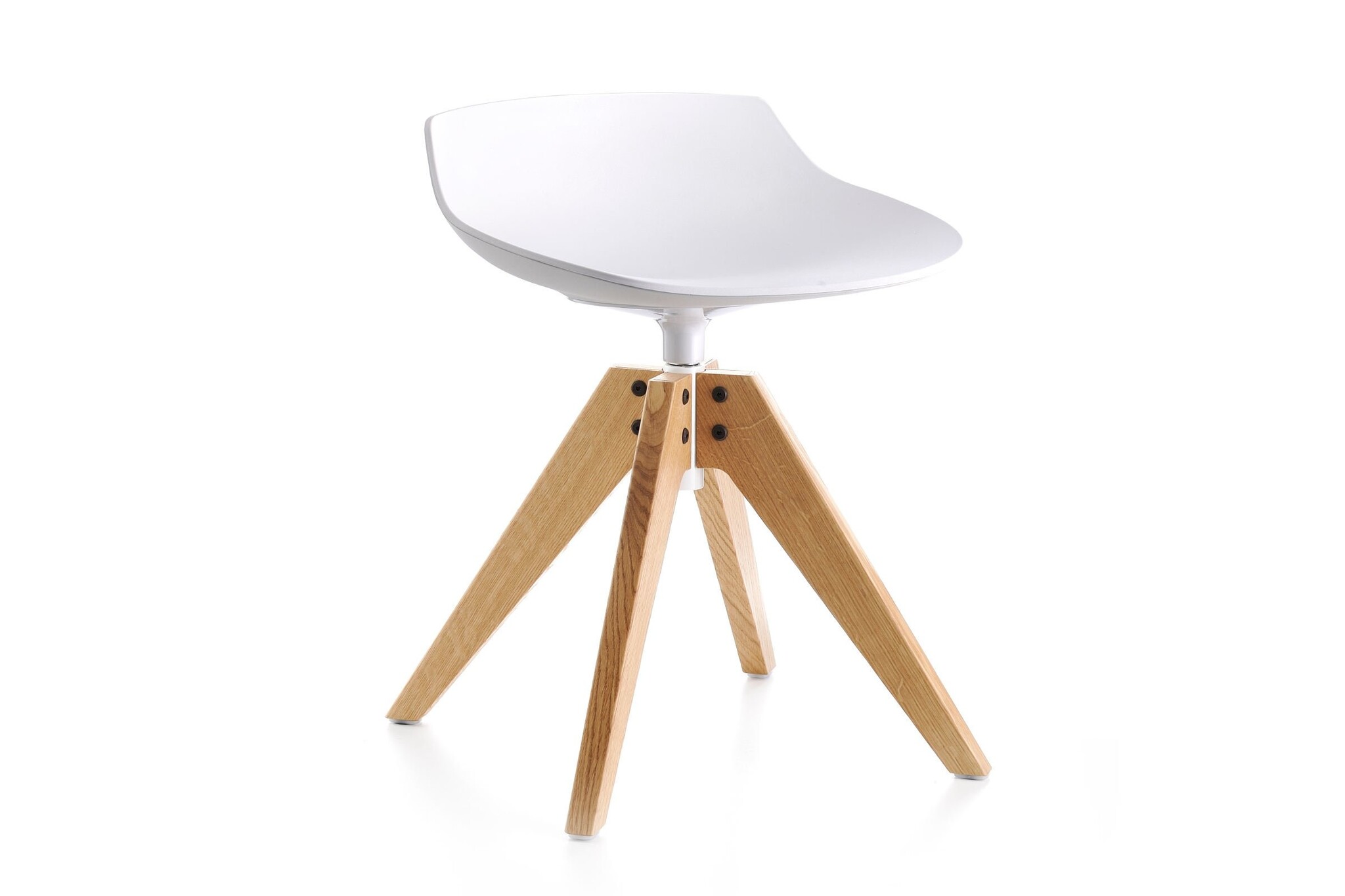 4 poten met een eiken basis, frame uit transparante gelakte eiken naturel massief hout met een natuurlijke, bruin of gebleekte afwerking, met een gelakt aluminium koppelinrichting in mat wit of grafiet. Geborsteld roestvrij staal voetsteun op alle versies. 360 graden draaibaar. Zithoogten beschikbaar in : 44, 65, 78 cm en voor de Flow Poef 48 cm.