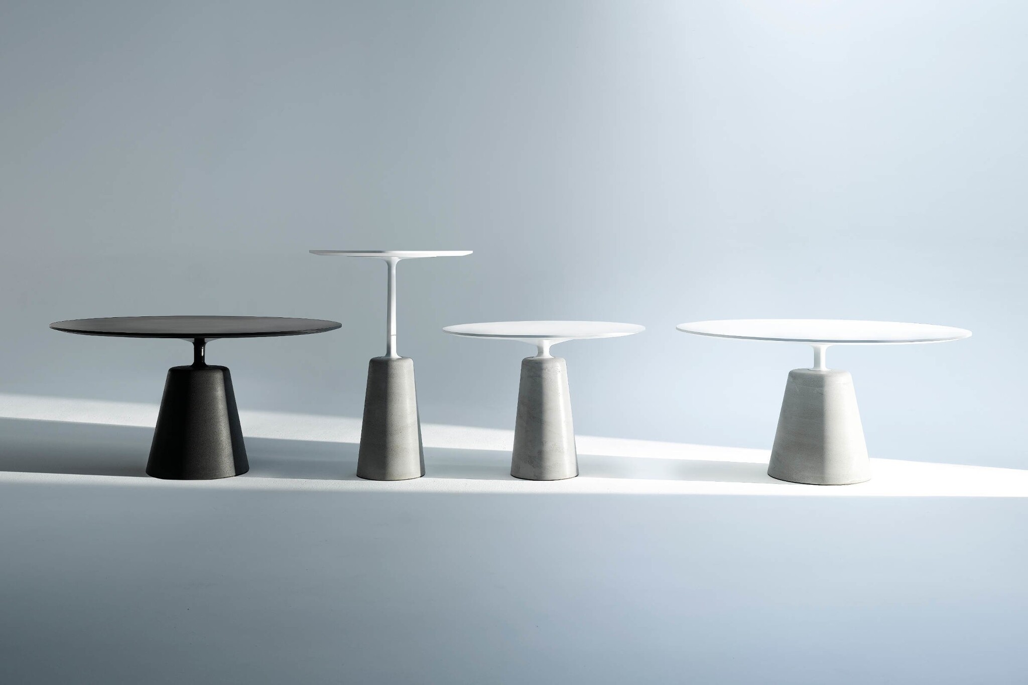 De componenten die de basis met het tafelblad verbinden zijn gemaakt van aluminium en zijn poedercoating met mat wit of antraciet gelakt. De basis die in natuurlijke cement leverbaar is, wordt geleverd met hulpstukken in mat wit. De basis die in antraciet cement leverbaar is, wordt geleverd met hulpstukken in mat antraciet.