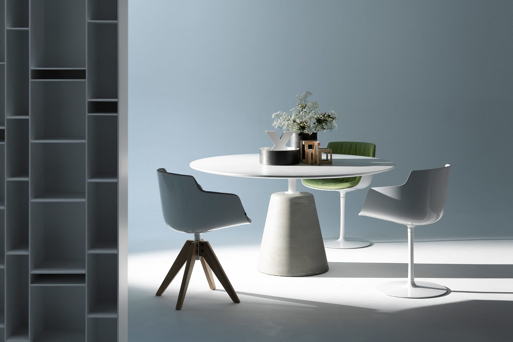 • smal onderstel (met een buitendiameter van 34 cm op vloerniveau) en leverbaar met tafelbladen van 80 en 100 cm groot in diameter