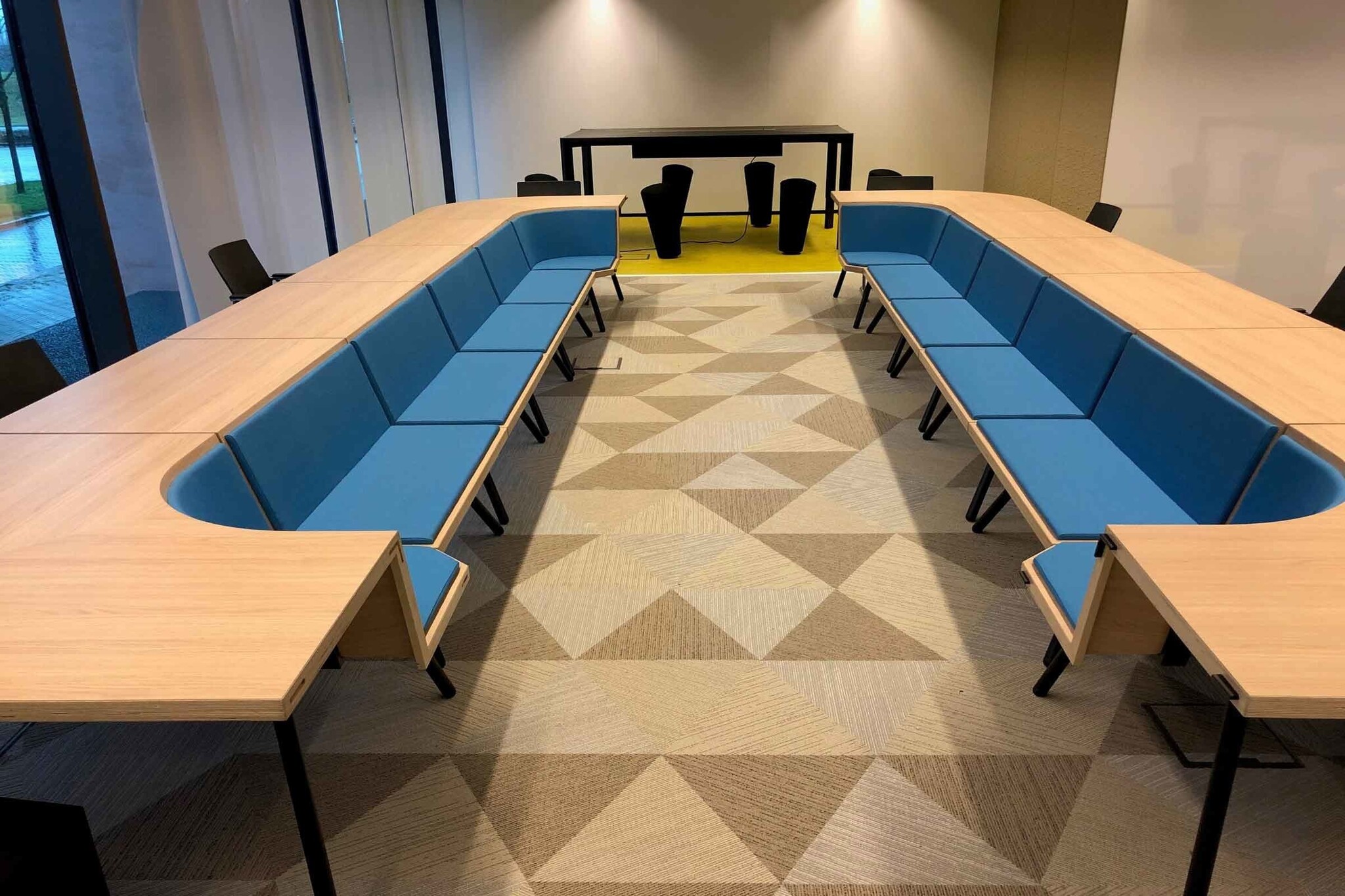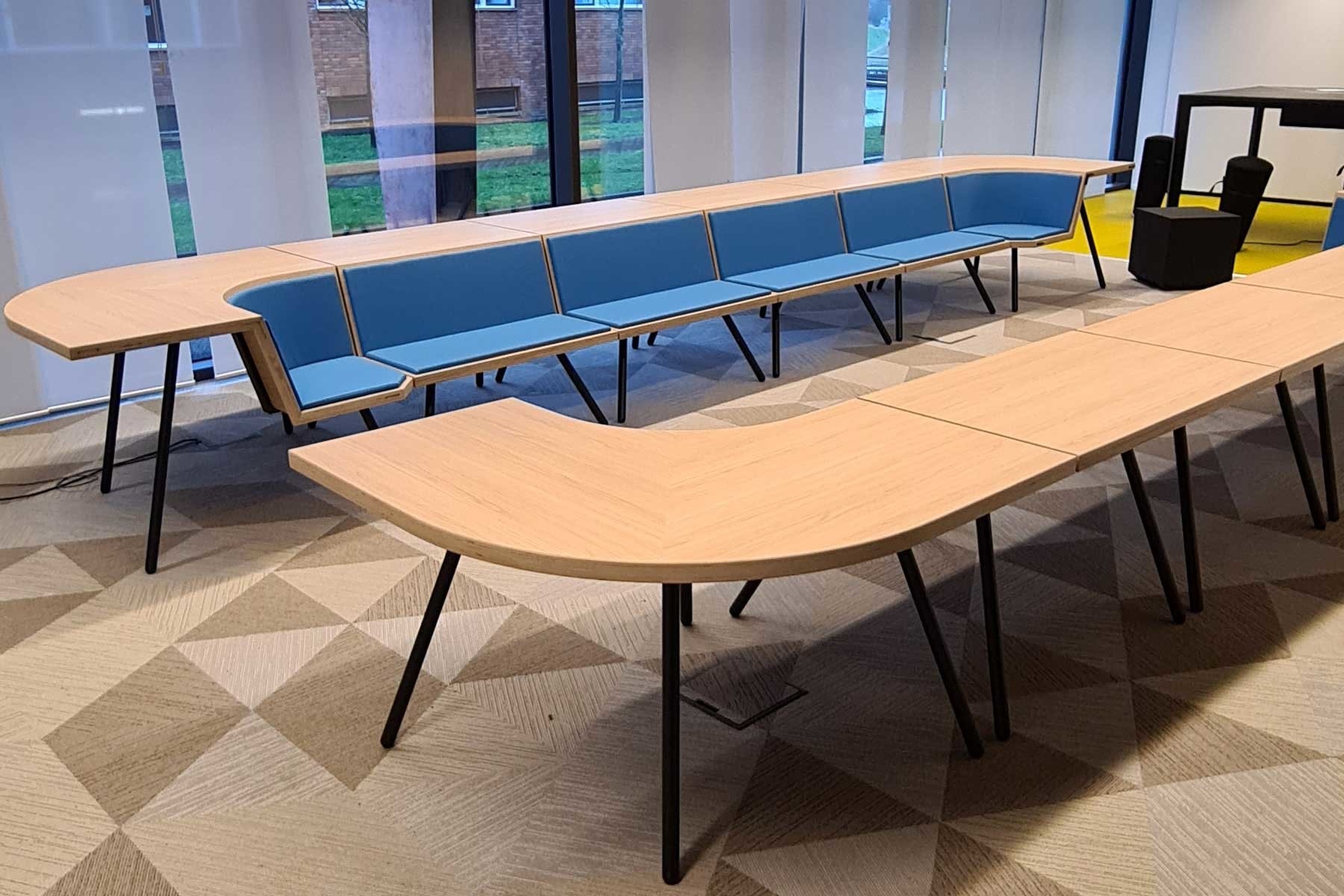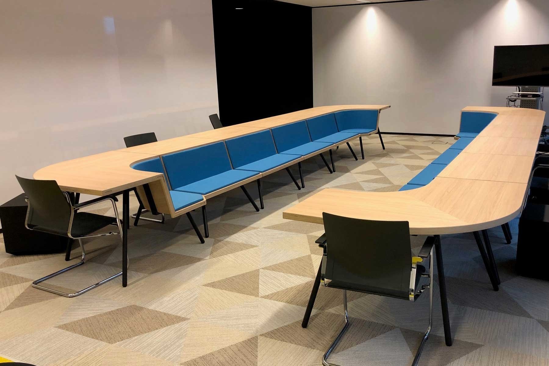 Met twee basisvormen, een hoekdeel en een recht deel, welke eenvoudig te koppelen zijn, kunt u vergaderopstellingen creëren die interactief vergaderen bevorderen en passief toehoren vrijwel onmogelijk maken.