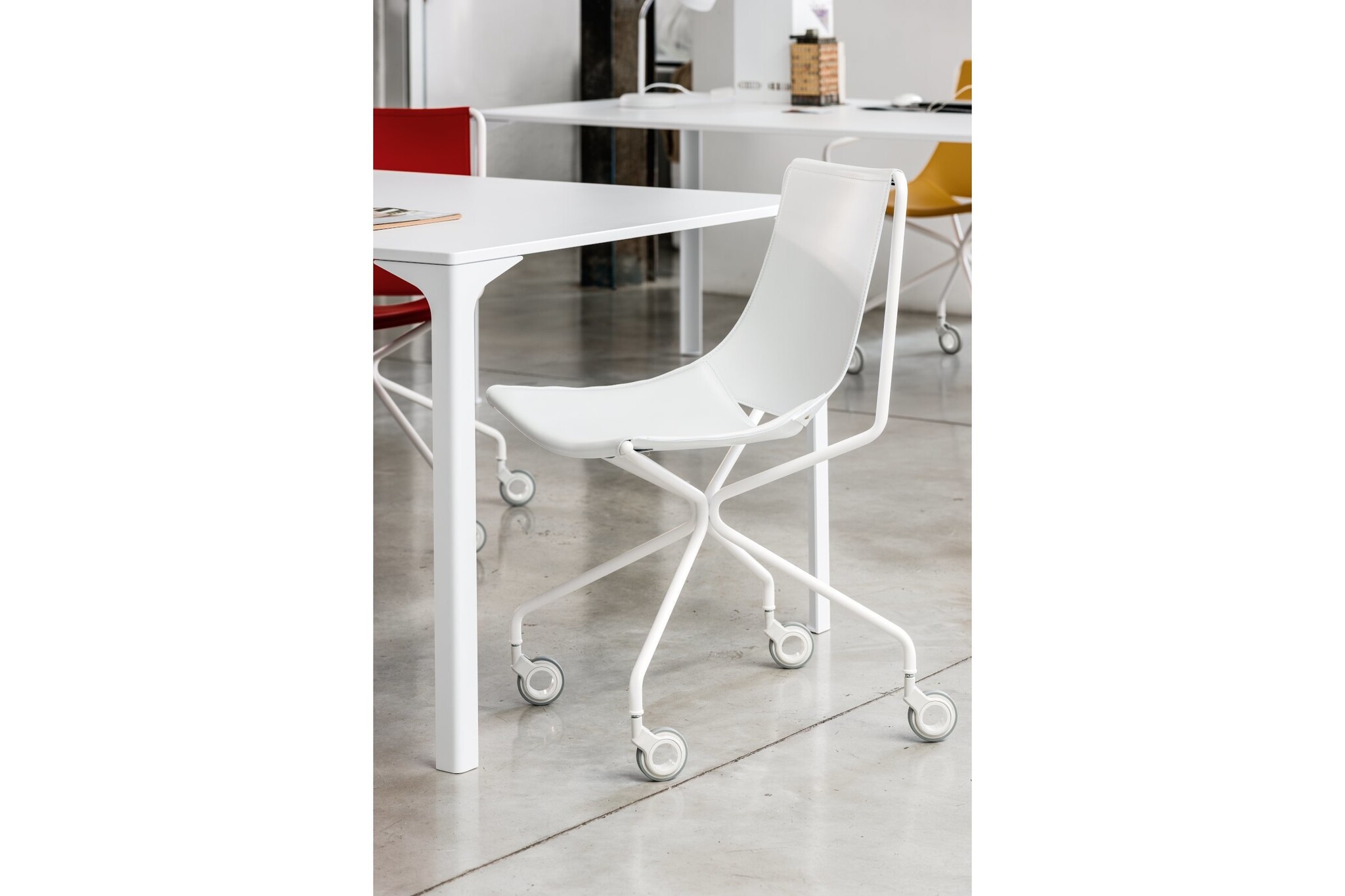 Kantoorstoel verrijdbaar model, onderstel kruisvoet met vier wielen in wit of zwart gelakt metaal.