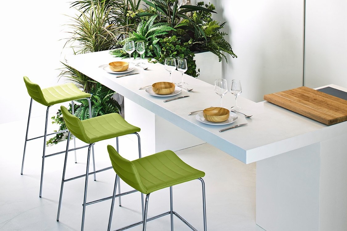 Barkruk met stalen onderstel en is leverbaar in 2 zithoogtes (65 of 75 cm).