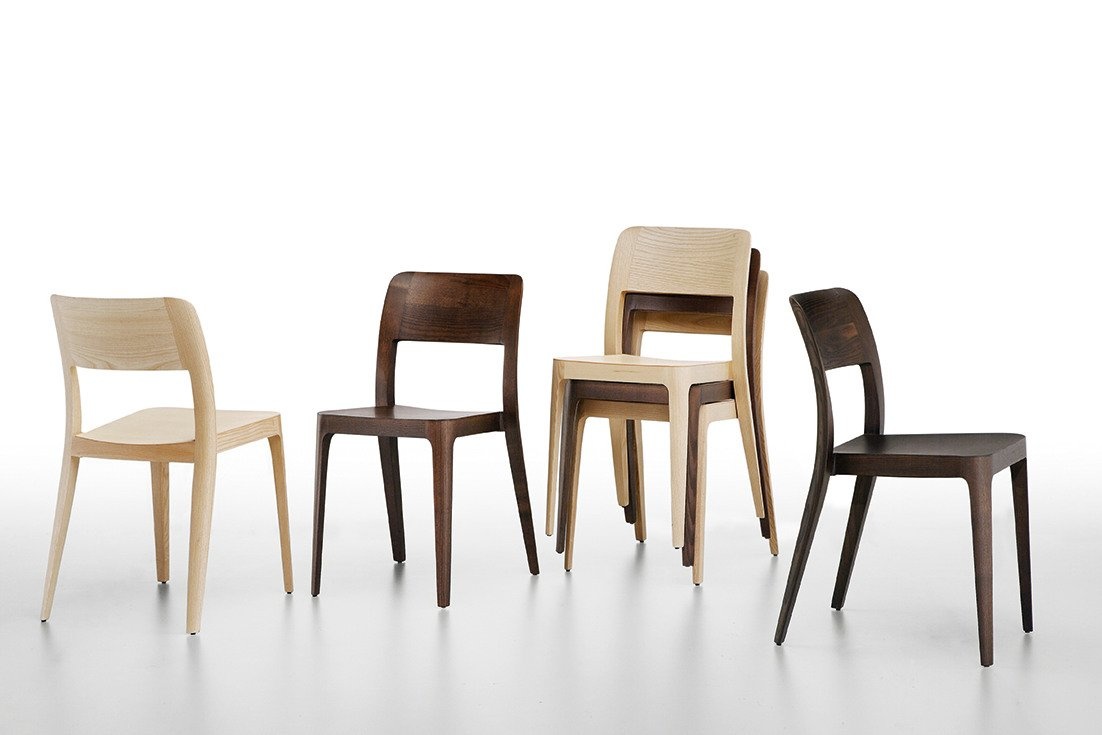 Een collectie stoelen met verschillende uitvoeringen, zoals met of zonder (open of gesloten) armleuningen, materiaalkeuze in hout of gestoffeerd of open of gesloten rug. Kortom: de keuze is ruim.